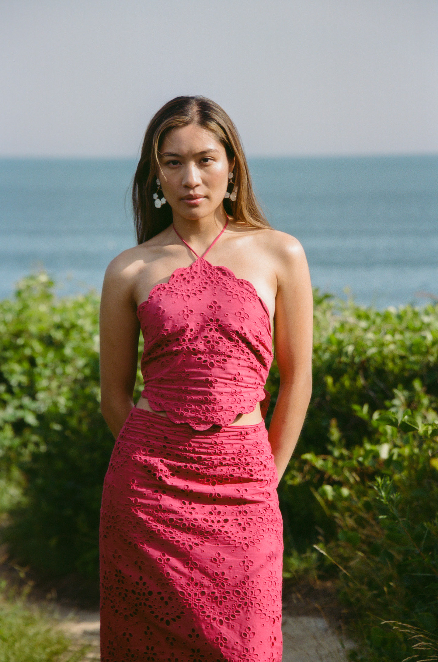 At daybreak on the Massachusetts coast, ANTHEMOESSA traces a siren’s awakening from quiet shore to the stone quarry—an arc from curiosity to other-worldly poise. Shot on the jagged granite of Halibut Point in Rockport, the series moves with the tide and the wind: a black column dress cuts against deep water, sun-kissed cutwork blooms in the greenery, and a pale knit clings to the last light atop weathered rock. Beauty stays natural and luminous so the silhouettes do the singing. The result is clean, modern, and mythic—an elegant echo of the call that draws you closer.