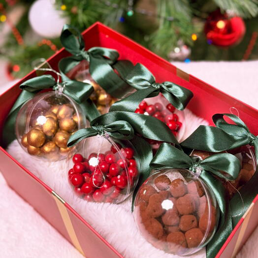 Enjoy the festive spirit with this exquisite dragee set, inspired by cozy winter evenings. Each of the six ornaments, perfect for decorating your Christmas tree, hides delightful treats that take you on a unique flavor journey.