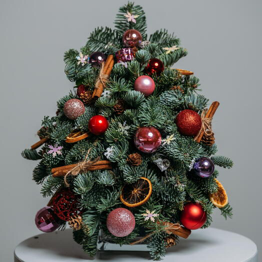 Celebrate the holiday season with this beautiful festive composition, featuring a delightful mix of cheerful ornaments, pines, real robilis, and juniper!