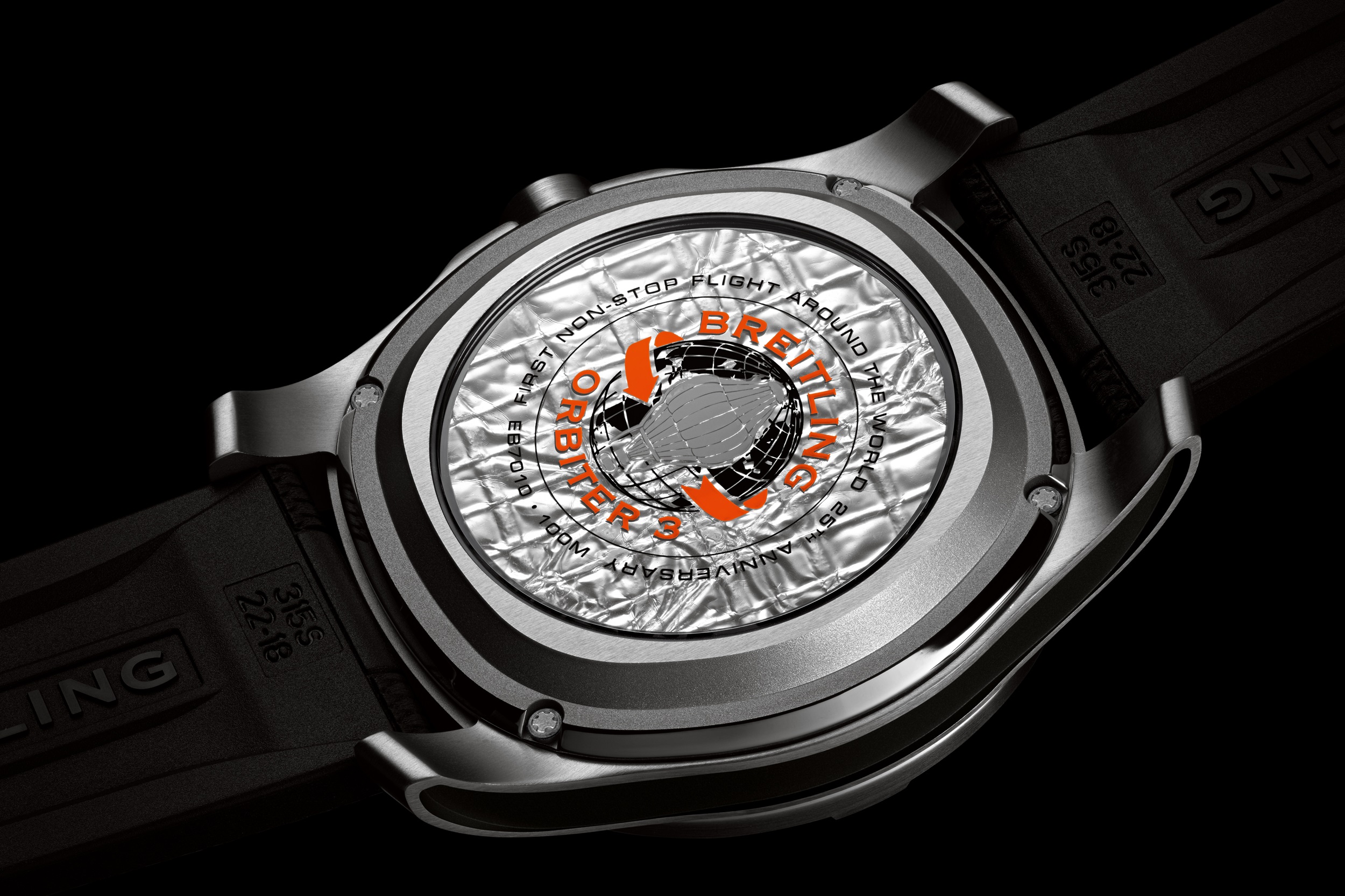 The Aerospace B70 Orbiter 25th anniversary edition—with its bright-orange dial the color of the Orbiter 3 capsule—contains its very own piece of history: a segment of the original Breitling Orbiter 3 balloon visible through the transparent caseback. The caseback also features the Breitling Orbiter 3 mission logo around its perimeter and the inscription “First non-stop flight around the world 25th anniversary.”