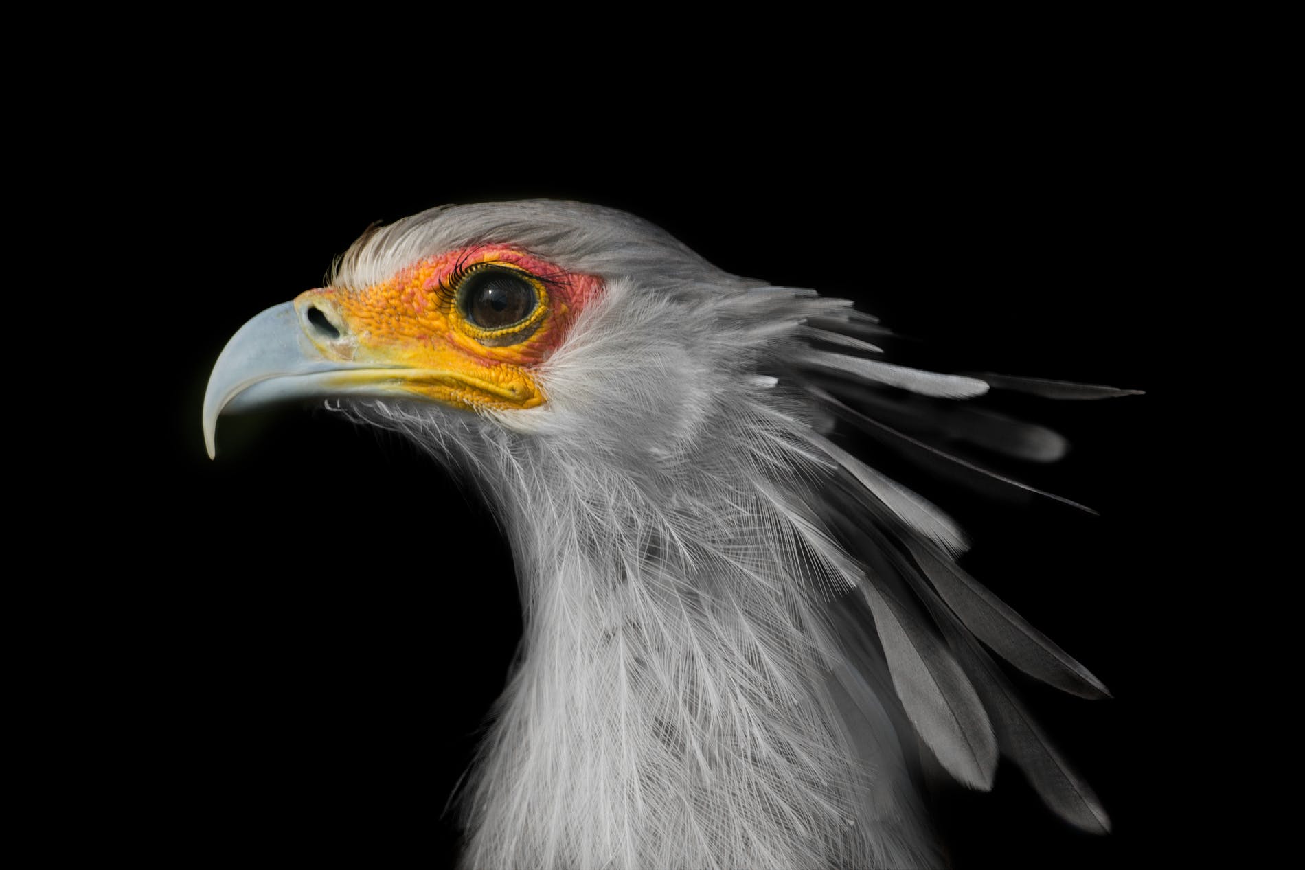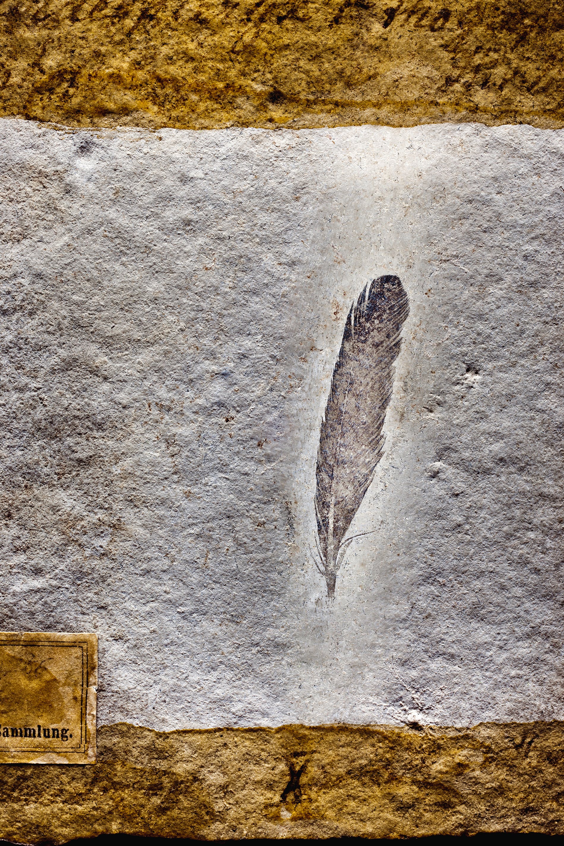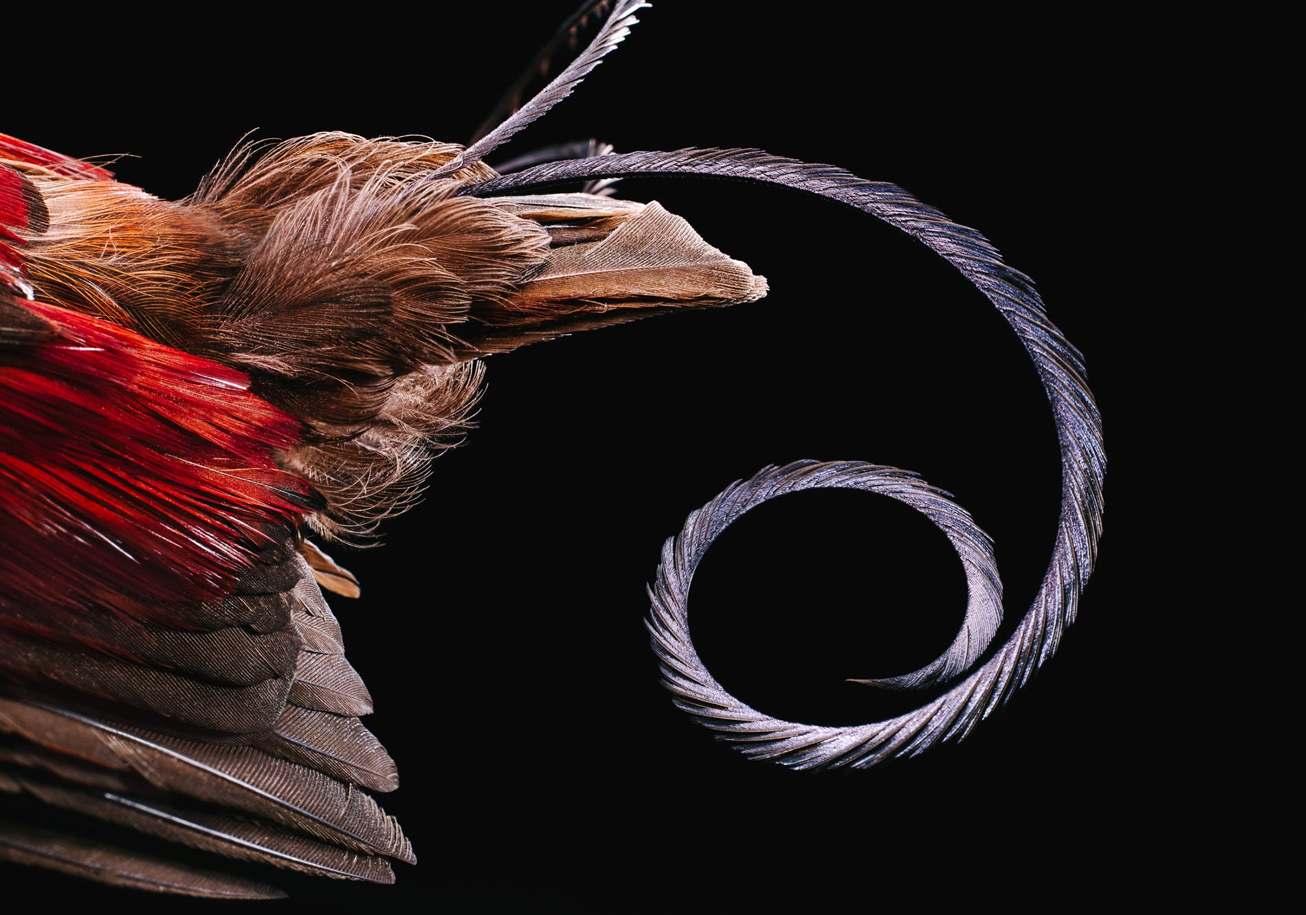 Notable highlights of Clark’s works on view are Secretary Bird (top), depicting the species found in the Savannas of the sub-Saharan region, and Wilson’s Bird of Paradise, which shows a single, tightly folded tail feather, which is the species’ most curious feature and one the male birds employ to attract a mate. Right is his work Archaeopteryx Feather, the first fossil feather ever known.