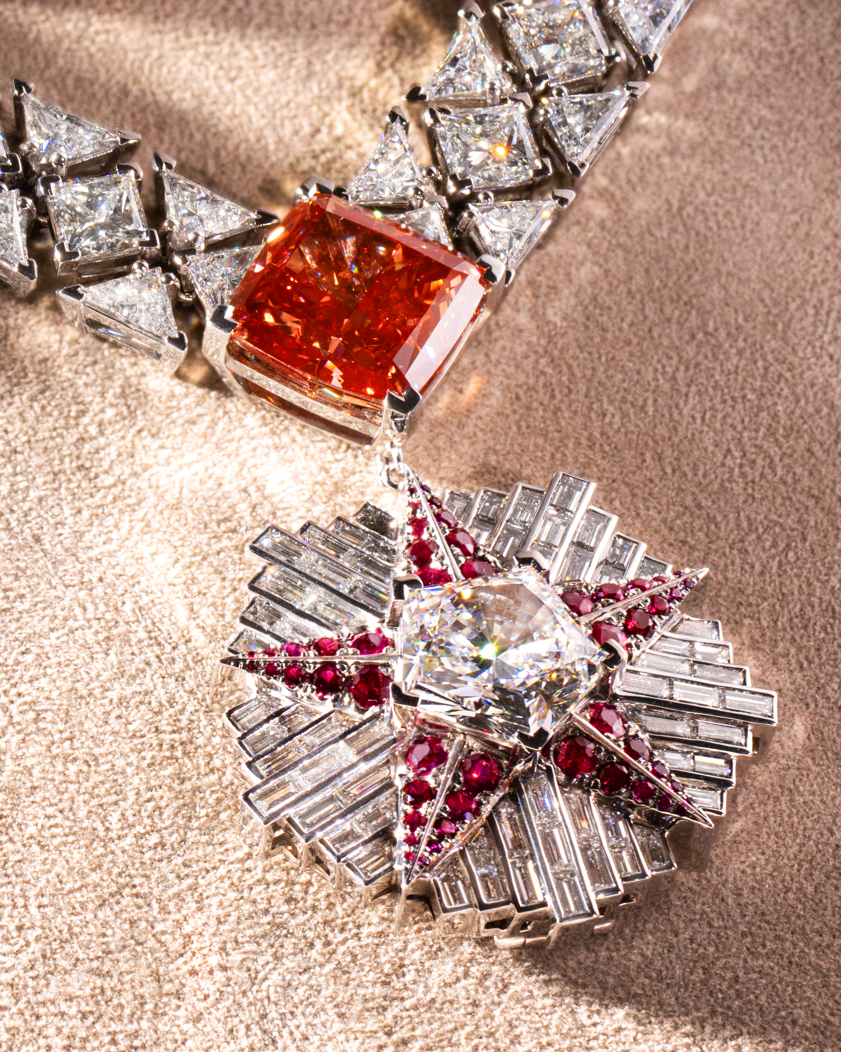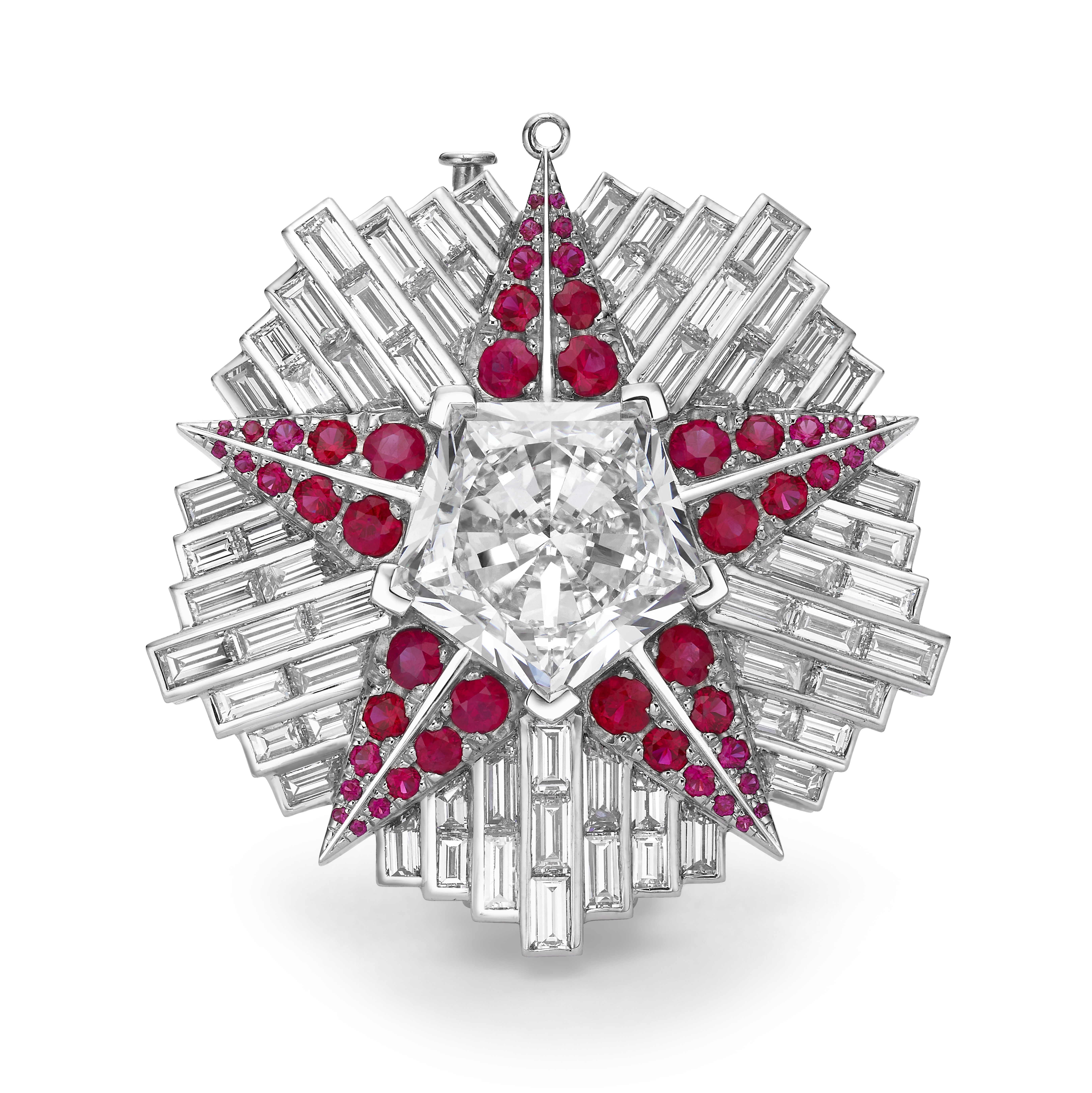 Seventy natural rubies pulse like living embers, breathing warmth into the icy brilliance of the white gold setting. Among them, a singular vision - a 12.32-carat pentagon-cut diamond, flanked by two matching penta-gems totalling 1.04 carats, adding intrigue and asymmetry to this regal design.