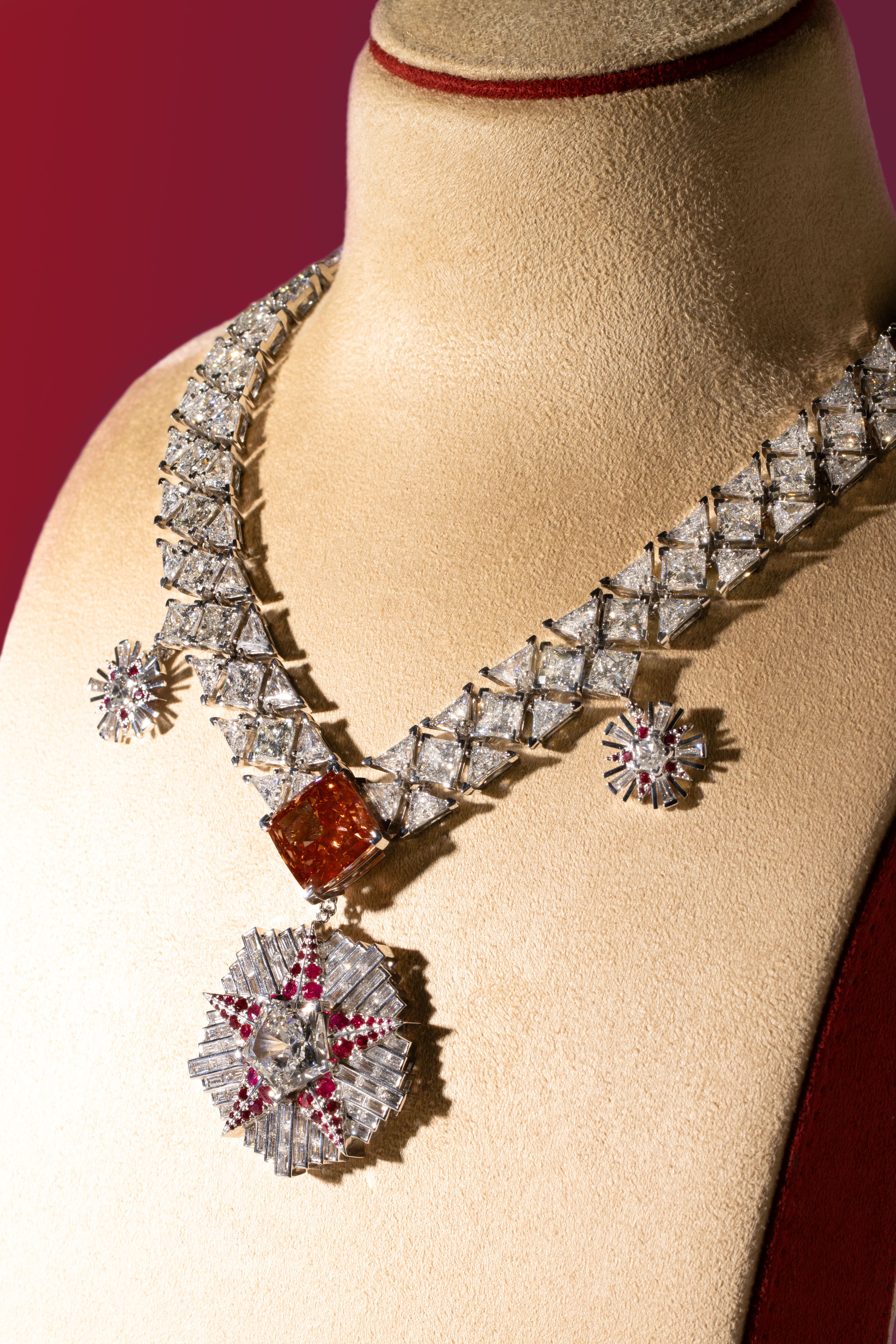 Sculpted from 178 grams of 18k white gold, POBEDA transcends valuation. Forming the heart of a sacred trinity — joined by a ring and a bracelet, each echoes the necklace’s luminous geometry. Centred with fiery red square diamonds and framed by the razor-sharp brilliance of white trillion-cut stones, the set embodies a powerful harmony of strength and elegance.