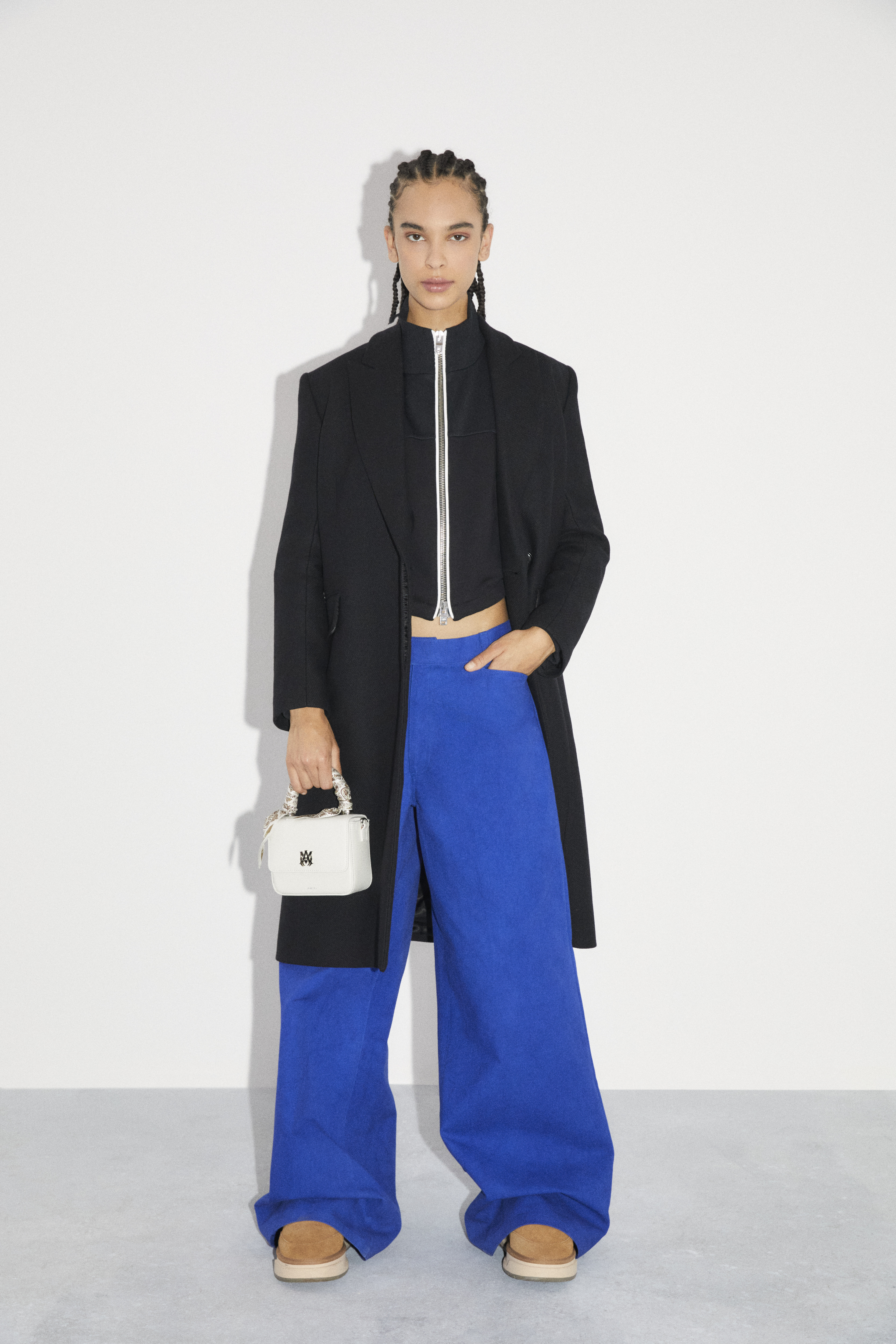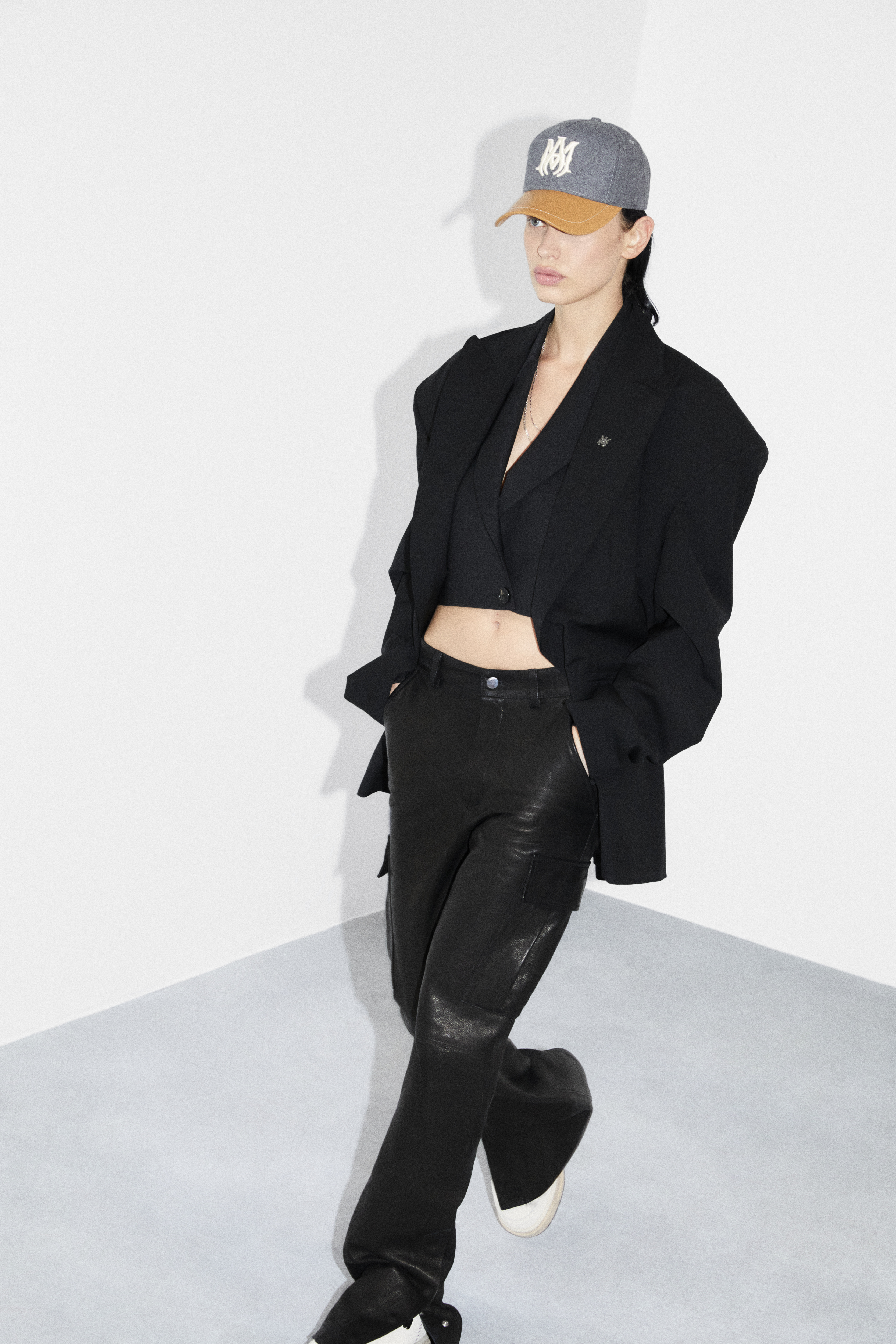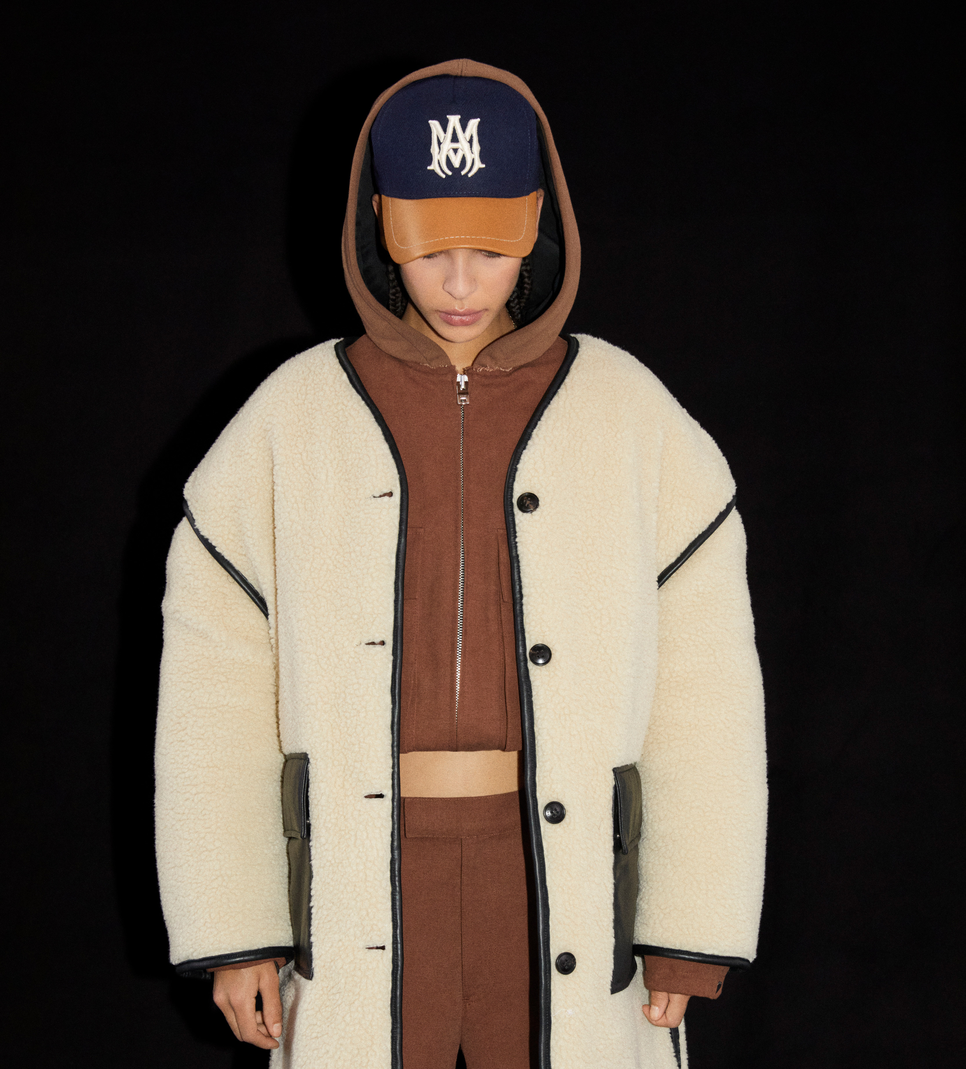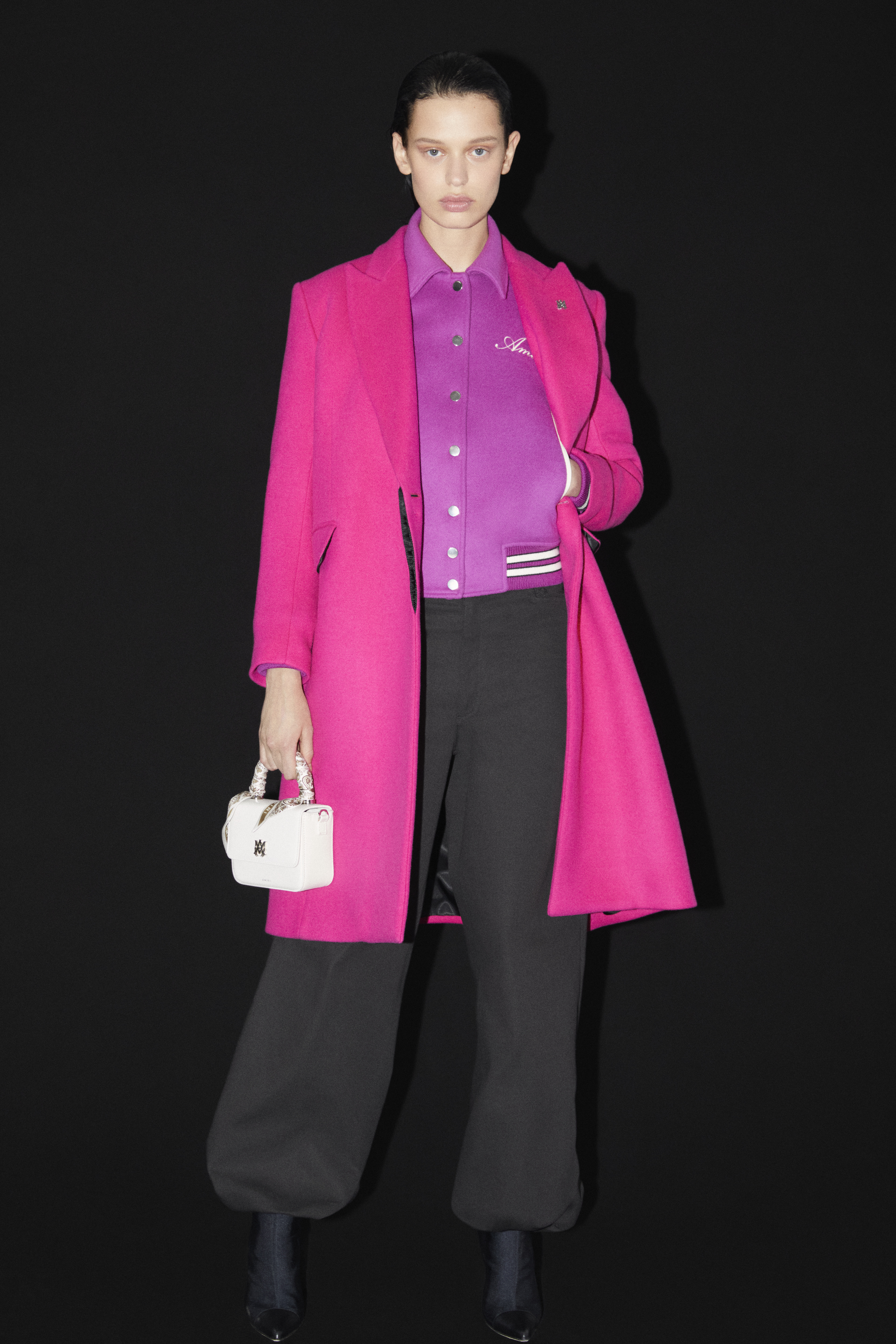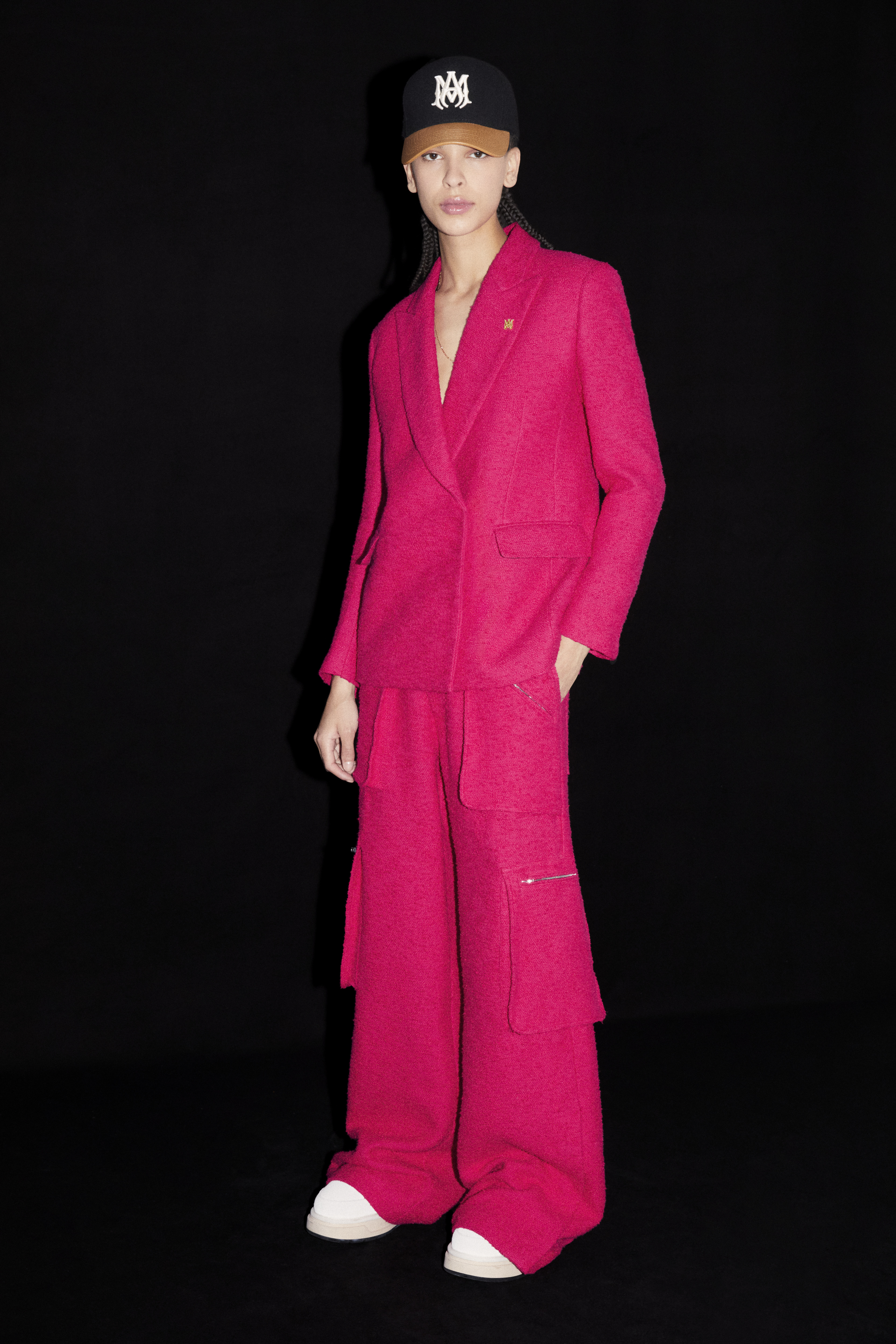 The Collection sees womenswear silhouettes shrunken, cropped elongated and skewed, offering interchangeability of shapes and solutions guided by sculptural craft and adjustable detailing. Workwear and tailoring are interchangeable, such is the versatility and rigor of AMIRI's savoir-faire. Seams are replaced with button fastenings and the pragmatism of cargo pants area elevated. Lines shift with ease between form-fitting and oversized, emitting notions of soft masculinity and empowerment. Bursts of vibrant pink and blue accent a neutral canvas built for layered, tonal plays and textural statements. Fabrics are soft yet tough – leather, wool, nylon, shearling, velour – borrowed from the worlds of sport and utility, repurposed for the everyday.