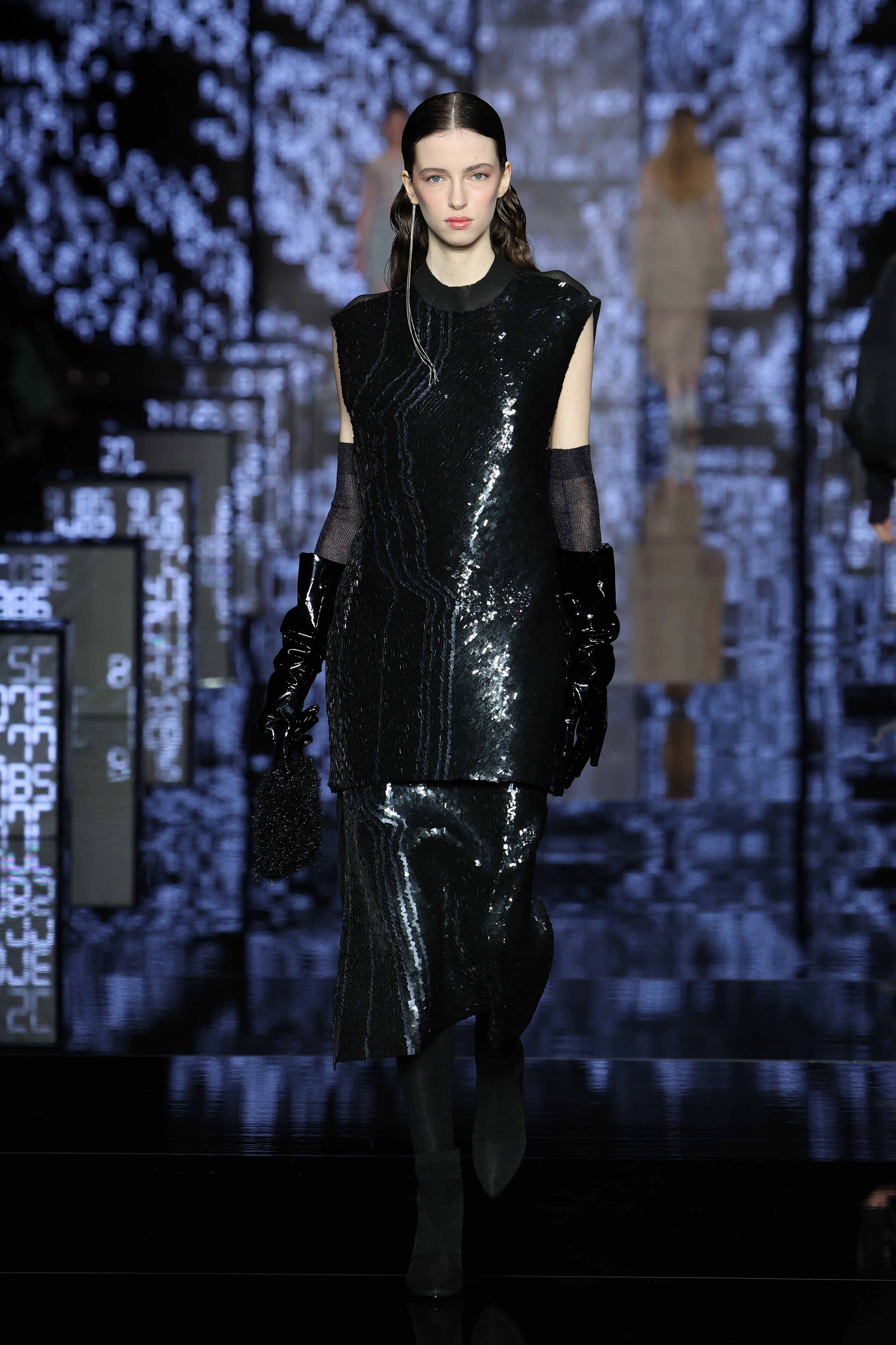 Digital party: the ensemble features a knitted fur design made from a blend of polyester and nylon sparkles, marked by a hip-length coat with metallic threads highlights. Paired by a mini-dress with matching detachable hood made of silver net. The oversized doublefaced wool coat embraces an inclusive silhouette of gender, and is elegantly paired with wide-leg PU Venice pants. The tailored knit shorts adorned with a chain add a touch of boldness and glamour to the collection.