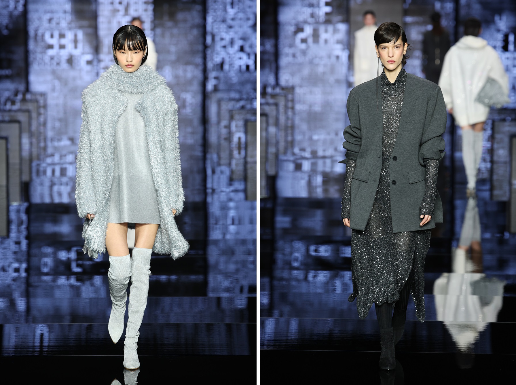 Bold glamour through wet-looking and glossy trims, such as the metallic film, soft mirror effect, irregular square sequins, shining silver and acrylic glow.