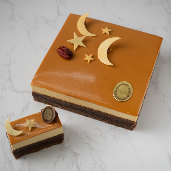 Ladurée’s Ramadan Dates Cake is a poetic composition of textures and flavors, where heritage meets haute patisserie. A delicate pecan biscuit base is layered with luscious date paste, topped with smooth pecan cream, and finished with a rich caramel mousse. A refined indulgence, this dessert is available as an individual portion or as a grand cake for 8, perfect for sharing with loved ones during Ramadan’s most cherished gatherings.