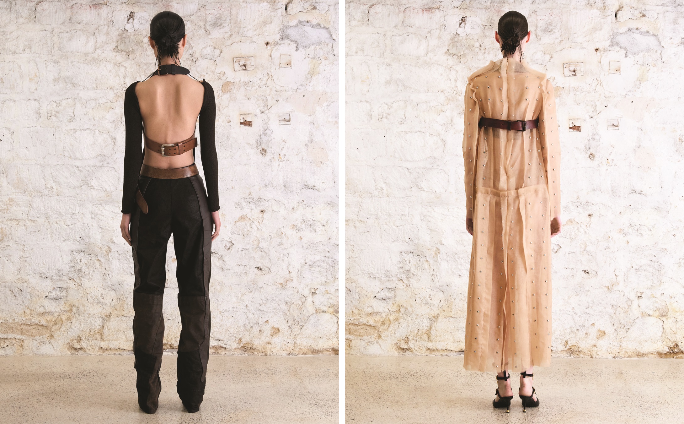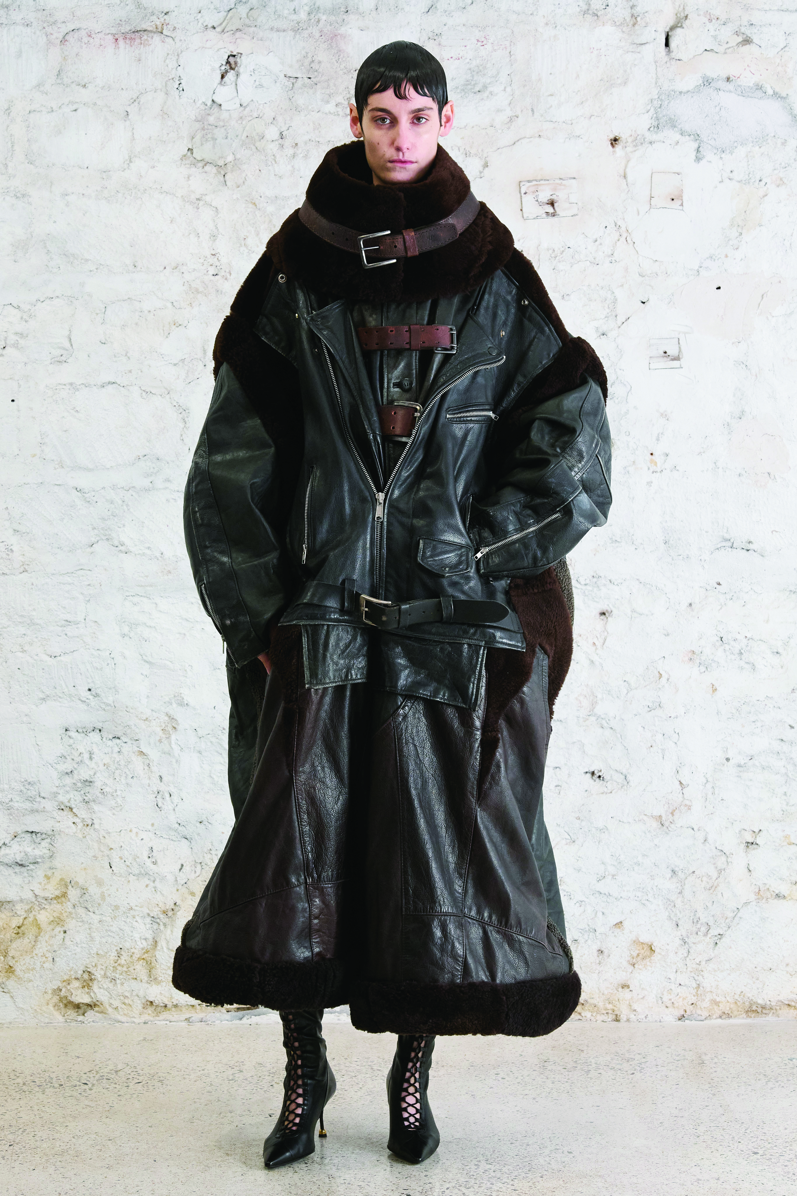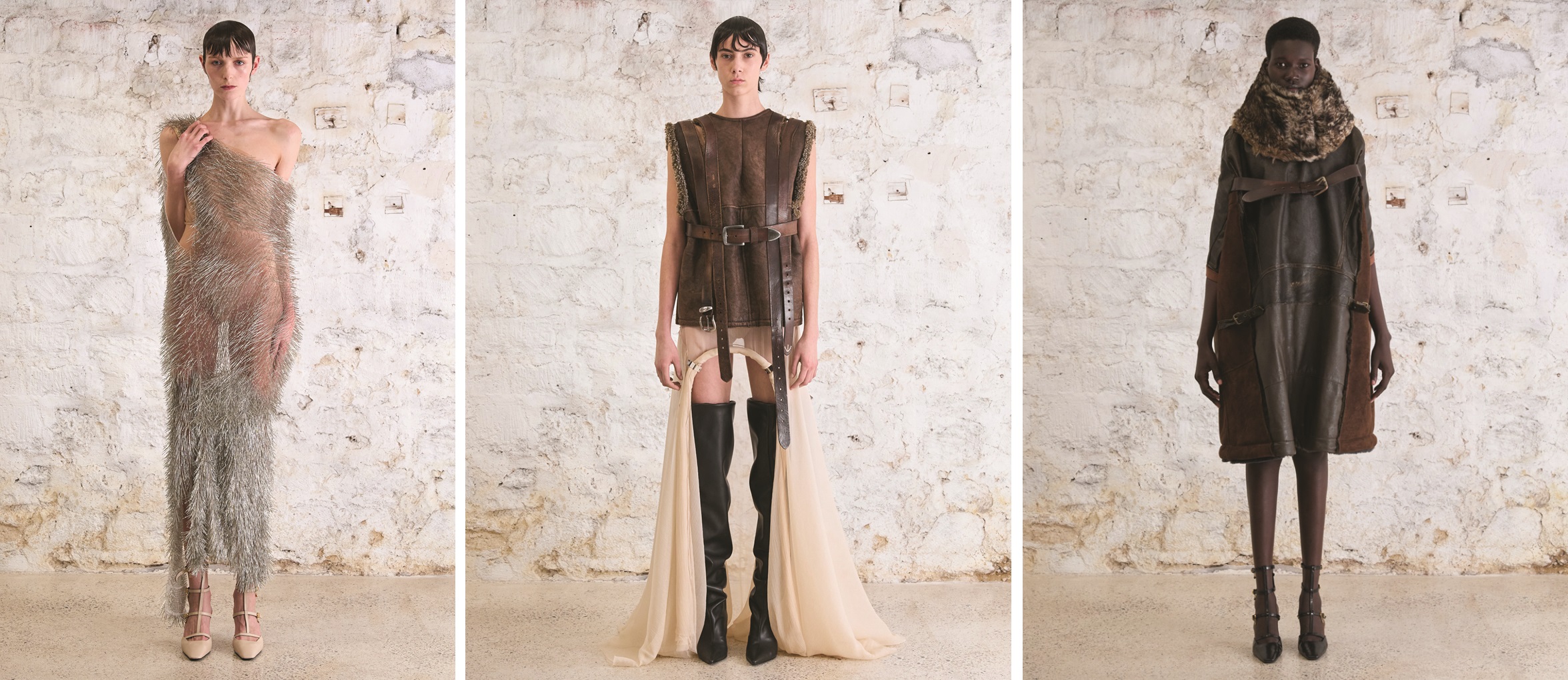 For this AZ Factory with Jenny Hytönen SS 2024 Couture Collection the main base is recycled military shearling jackets. In all shades of brown, this very masculine attire is cut and reconstructed into feminine shapes: tops, neck-covers. Miniskirts are made of belts. Overall looks are carefully-thought collages of both transparency and textures. The blush pink translucent silhouettes in organza inspired from archival 1920s evening gowns are studded with metallic details and undergarments reminisce archival Alber Elbaz’ designs.