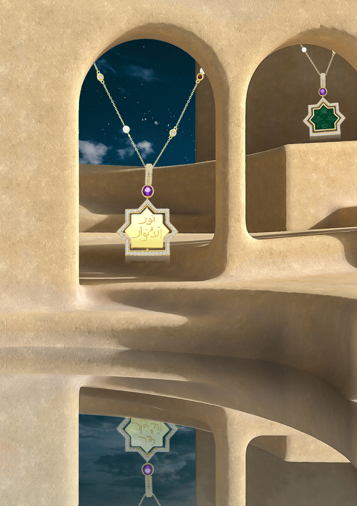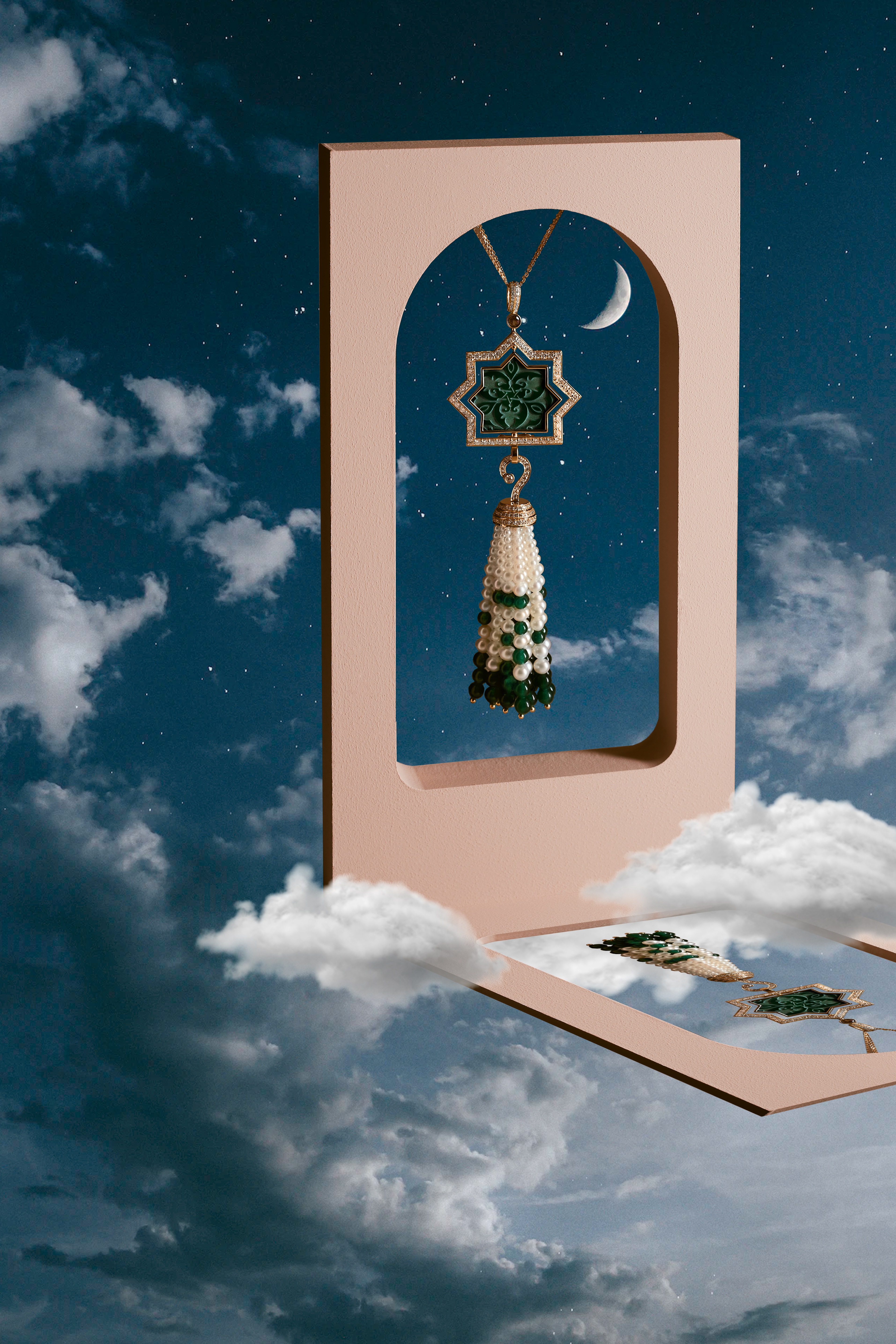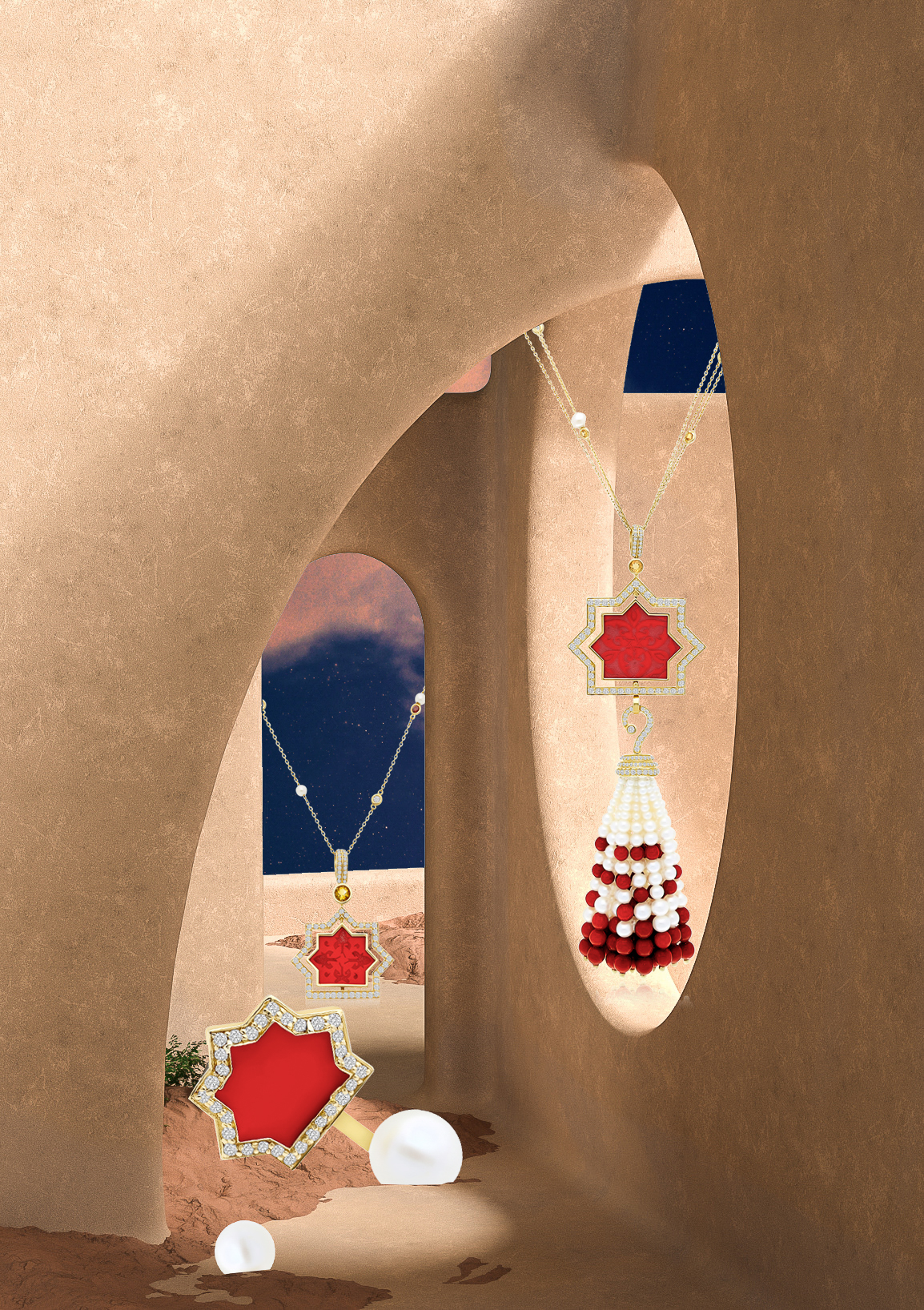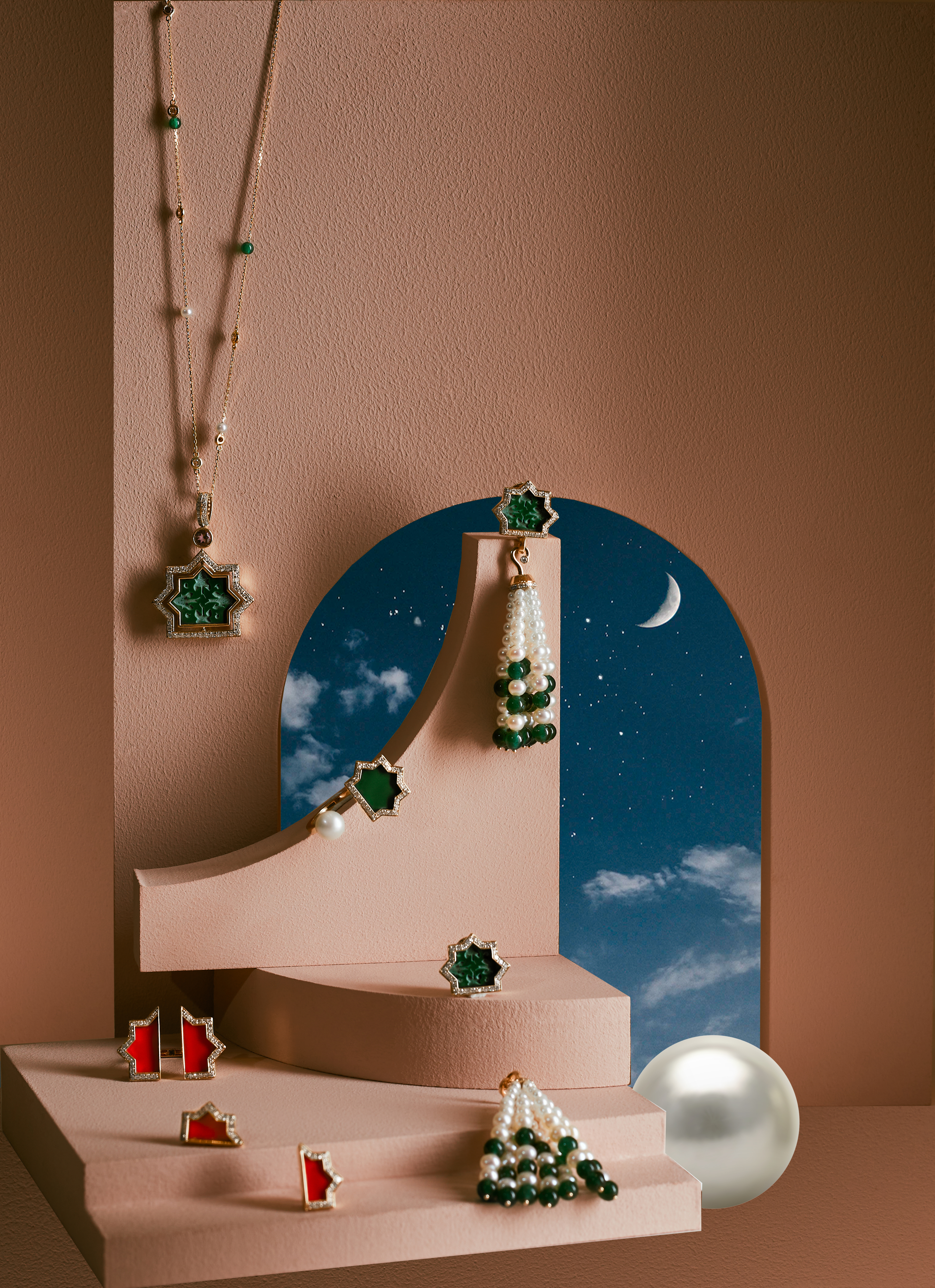 A hero piece, the medallion, designed in a mesmerising coral and green onyx threaded with Al Fardan’s famous natural pearl collection, presents a symbolic hidden prayer written in Sheikha Alyazia Bint Nahyan Bin Mubarak Al Nahyan’s distinctive handwriting. The collection also features a refined selection of bracelets, earrings, and rings in the timeless style, influenced from the beautiful shades and patterns of Andalusian tiles and Islamic floral motifs. Each and every piece transports the jewellery wearer into a new world of Arab heritage, linking to the landscape of Middle Eastern culture, to be adorned for all occasions.