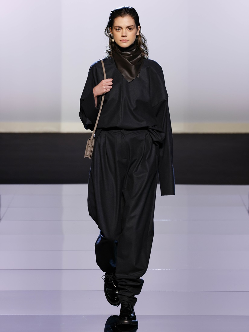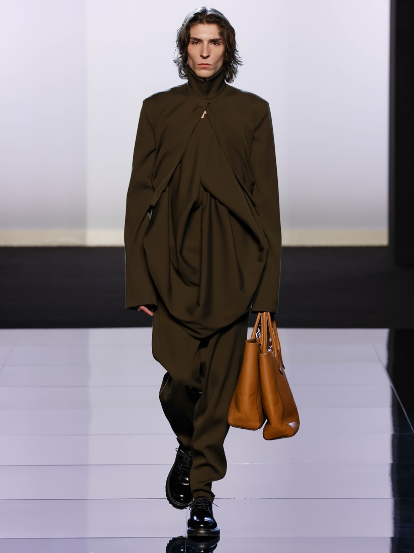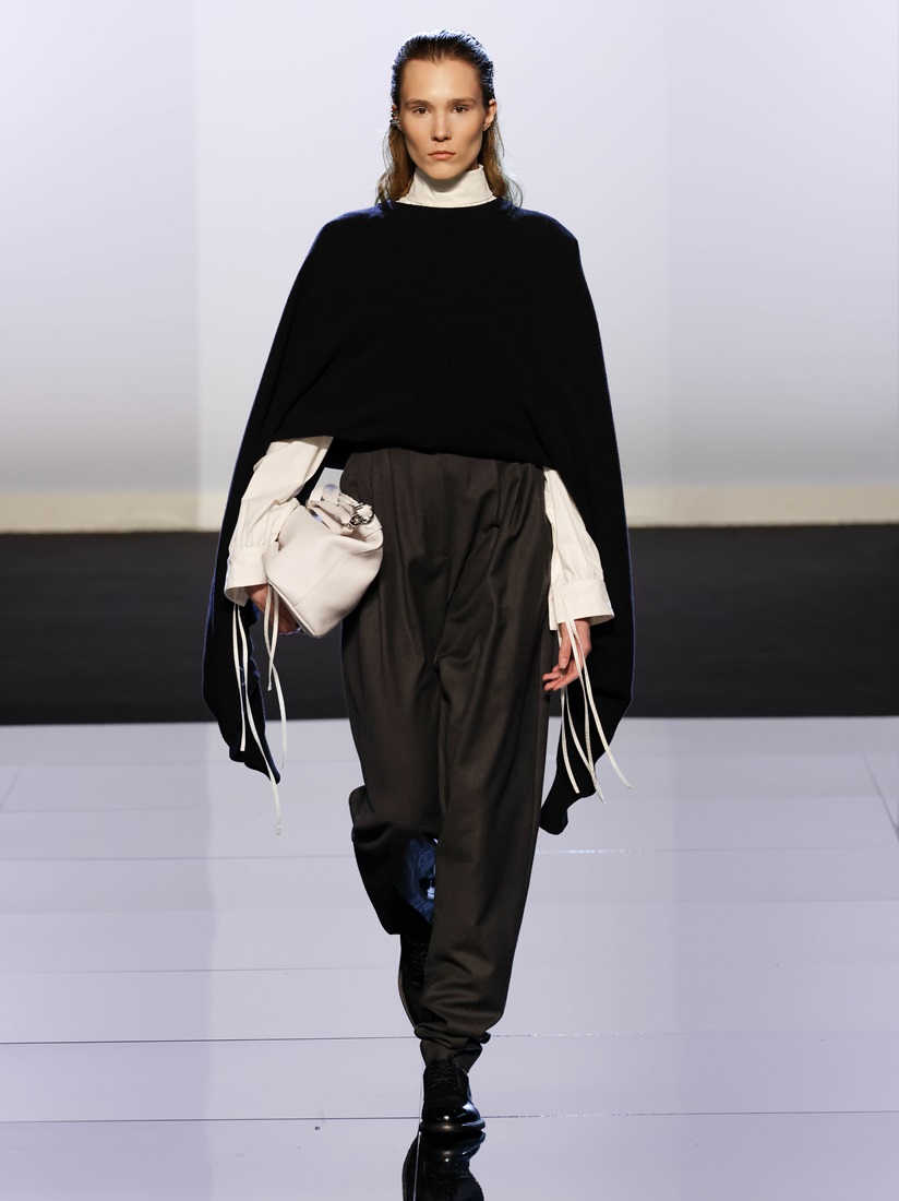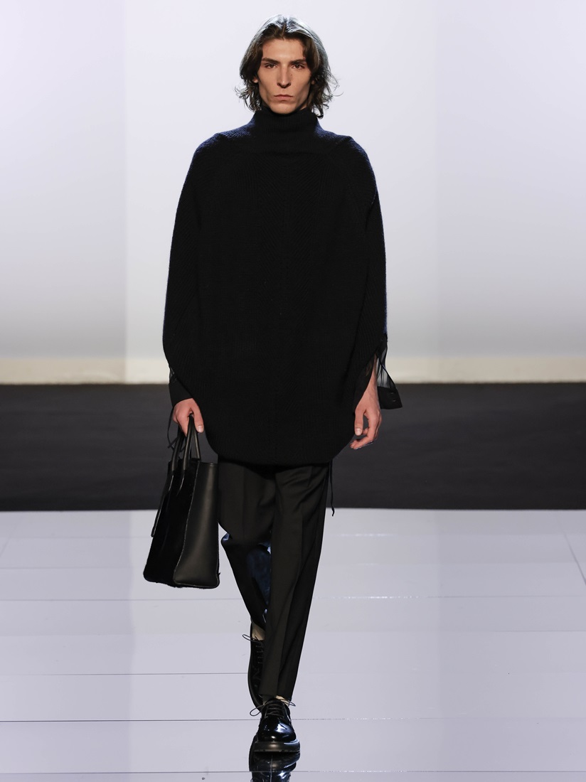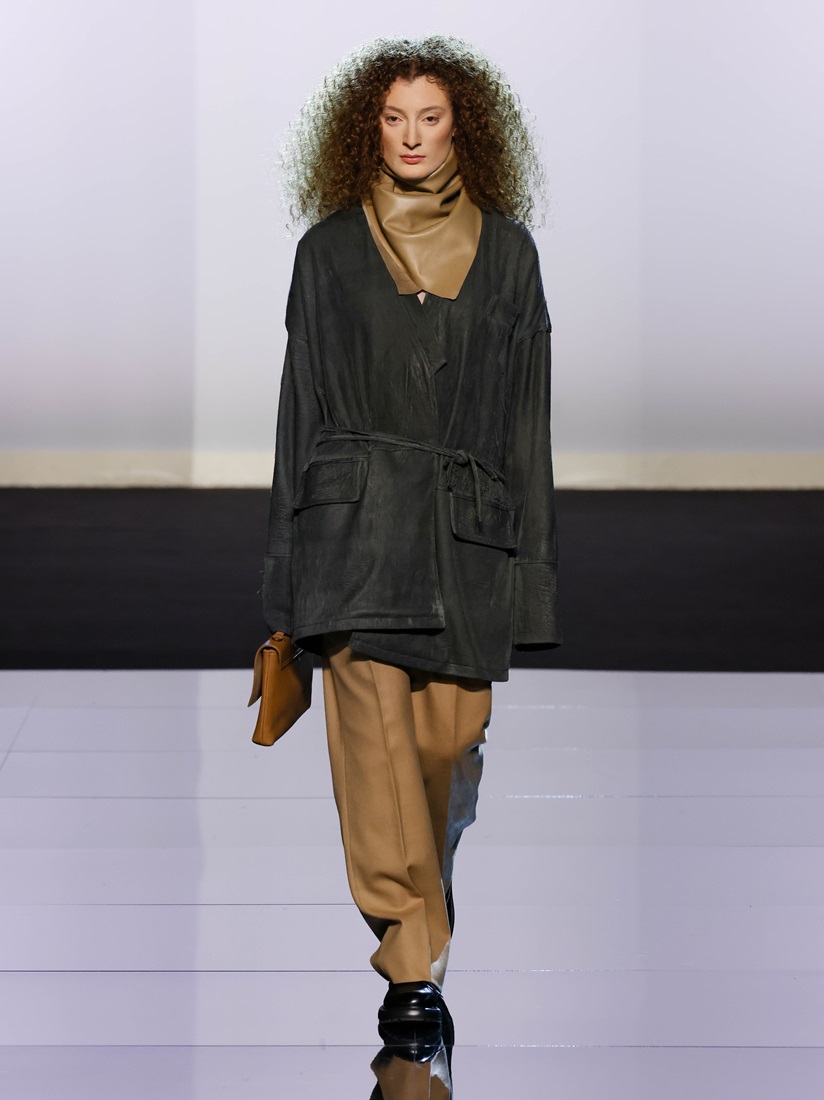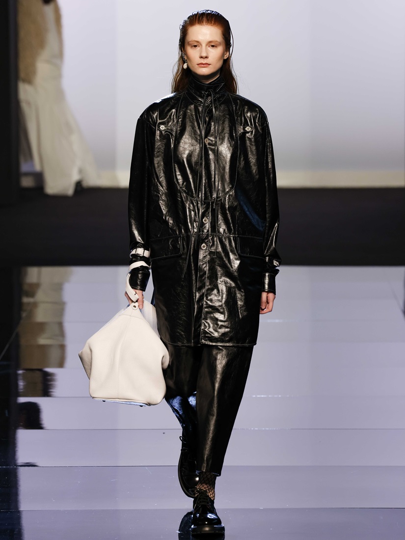Zambelli reflects and creates a dialogue between these dualisms, transforming silence into a visual language. The designer explores the world of tailoring through the use of leathers with sophisticated and elegant textures, precise cuts with embracing forms in a timeless minimalism.