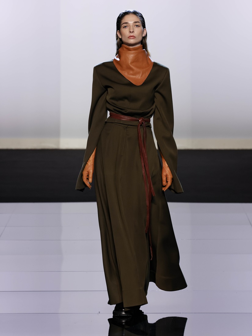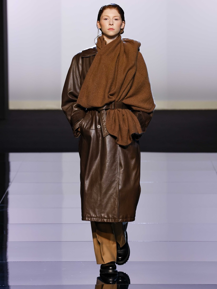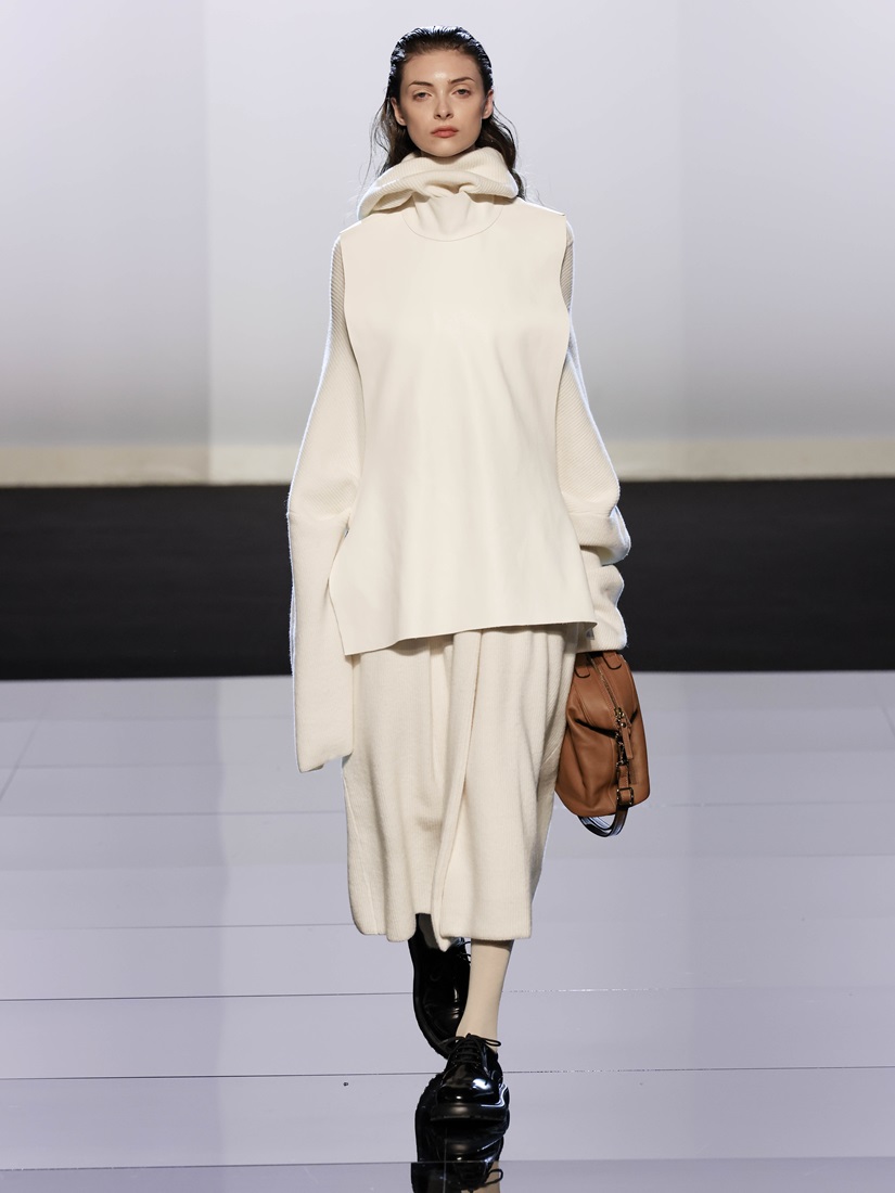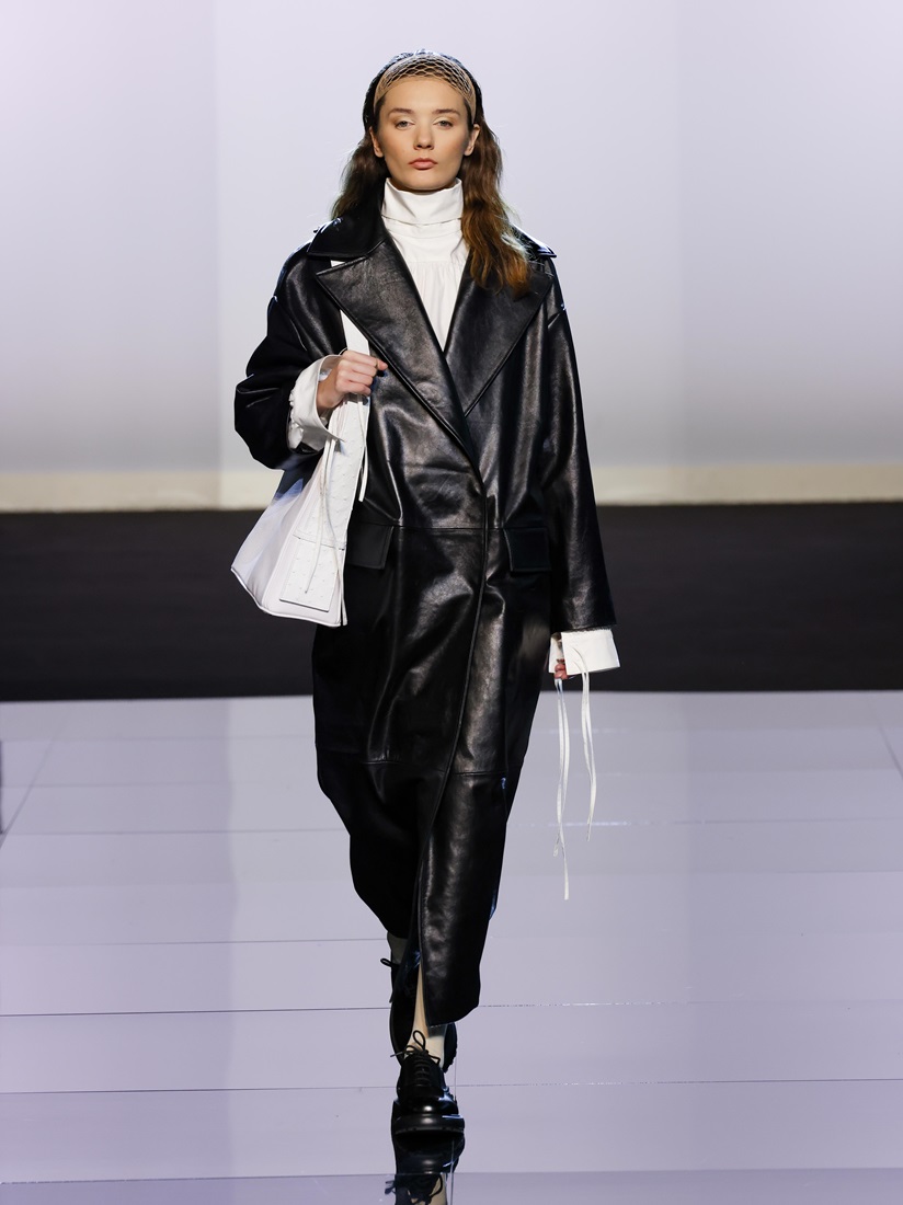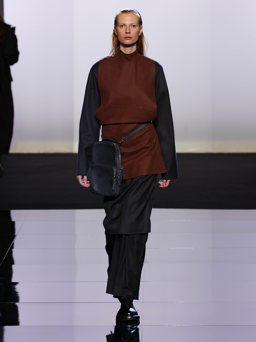 Zambelli reflects and creates a dialogue between these dualisms, transforming silence into a visual language. The designer explores the world of tailoring through the use of leathers with sophisticated and elegant textures, precise cuts with embracing forms in a timeless minimalism.