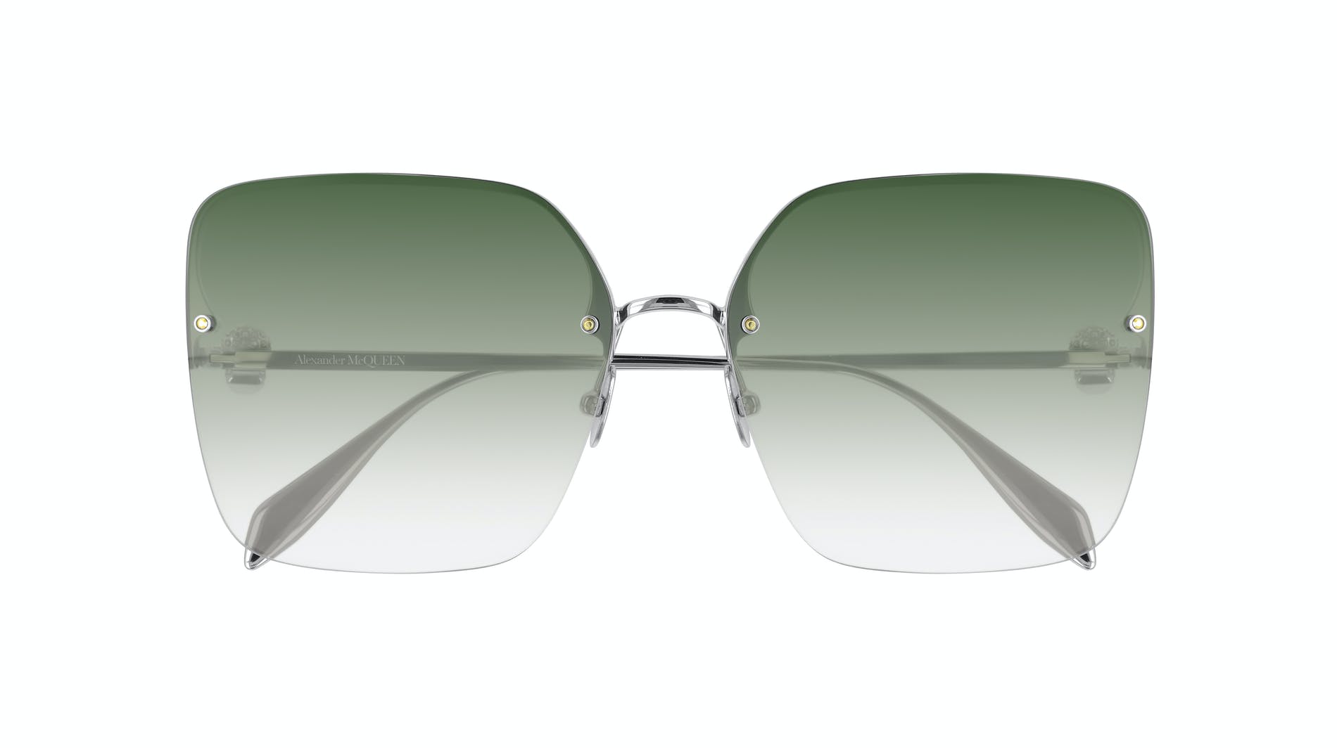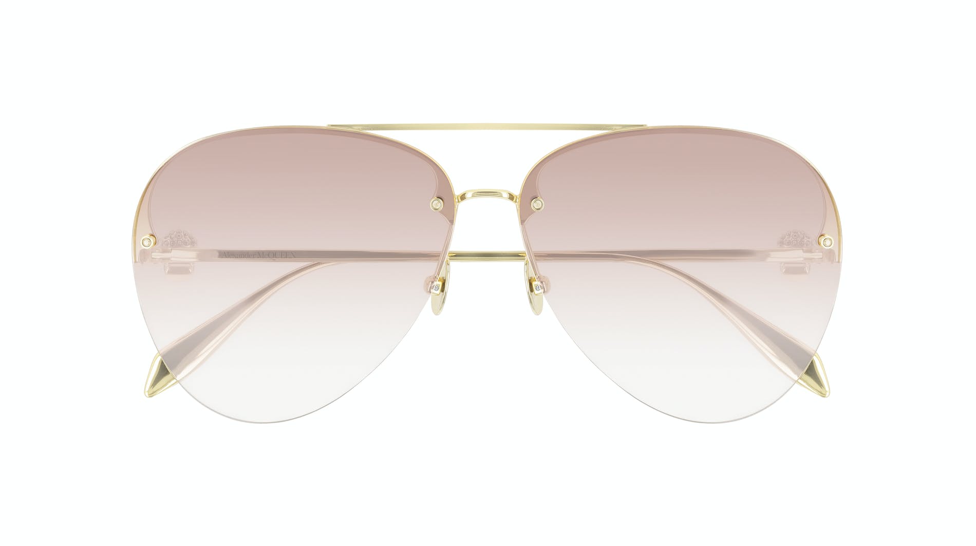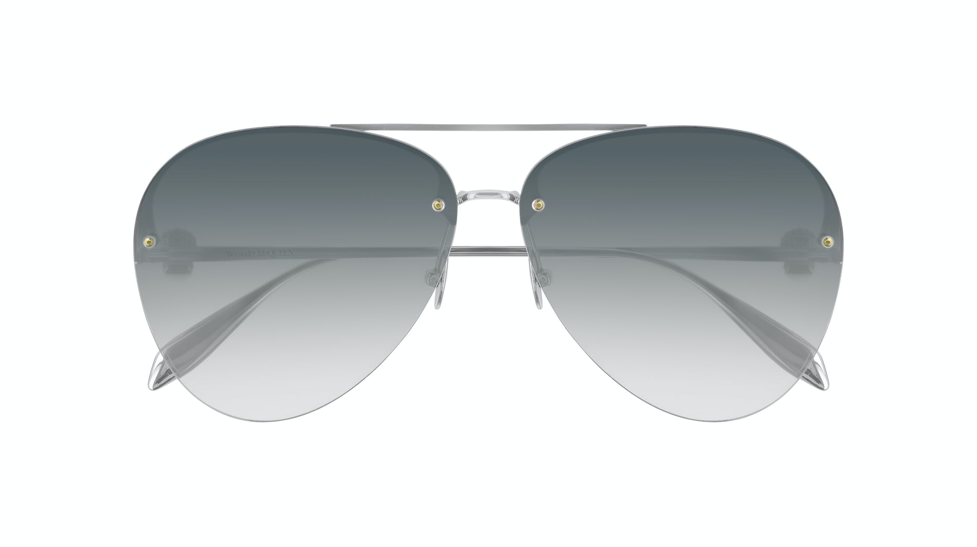 This masculine navigator shape has a double bridge detail and a striking front design with a metal structure visible through the lens. It further features the Alexander McQueen logo engraved on both temples.