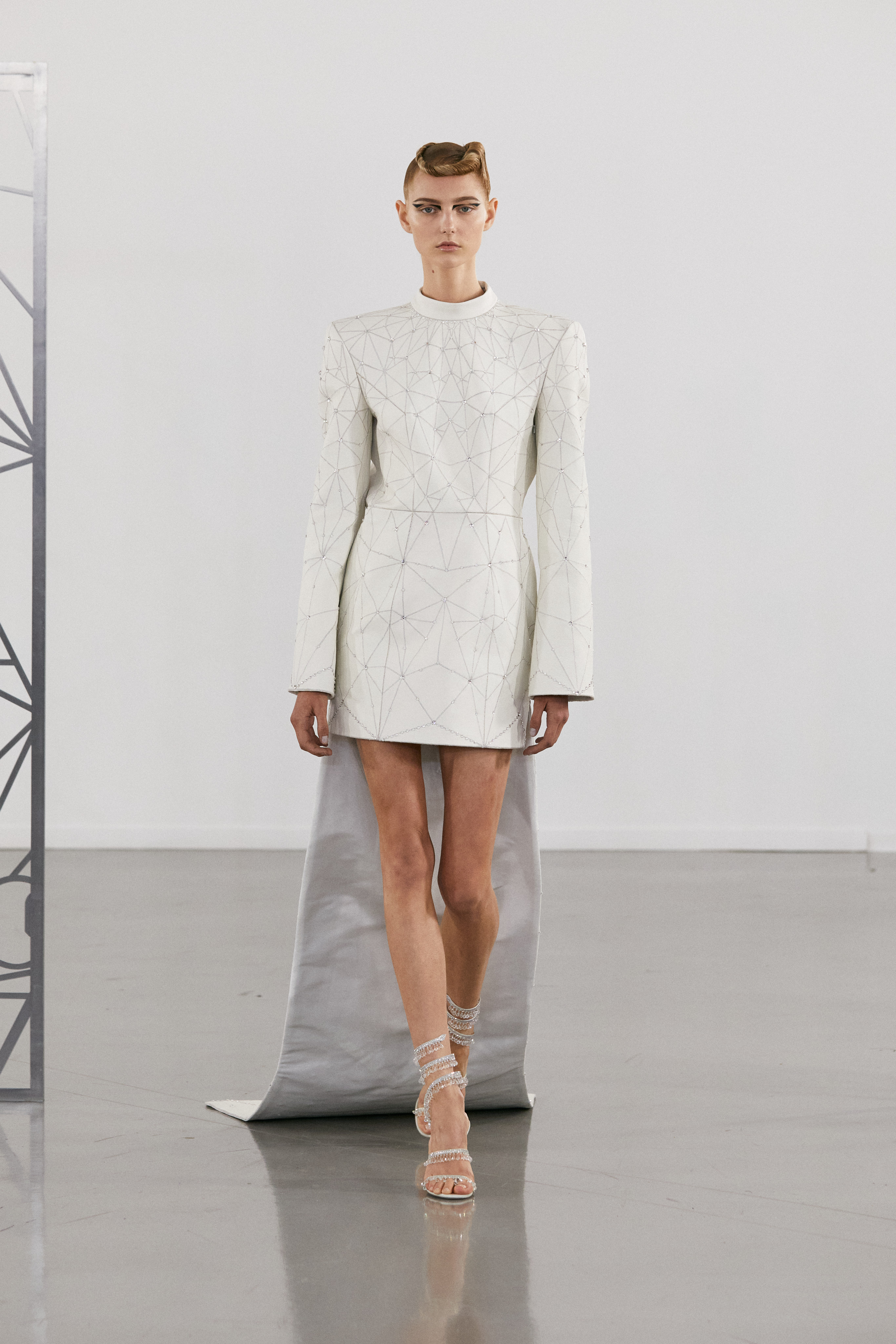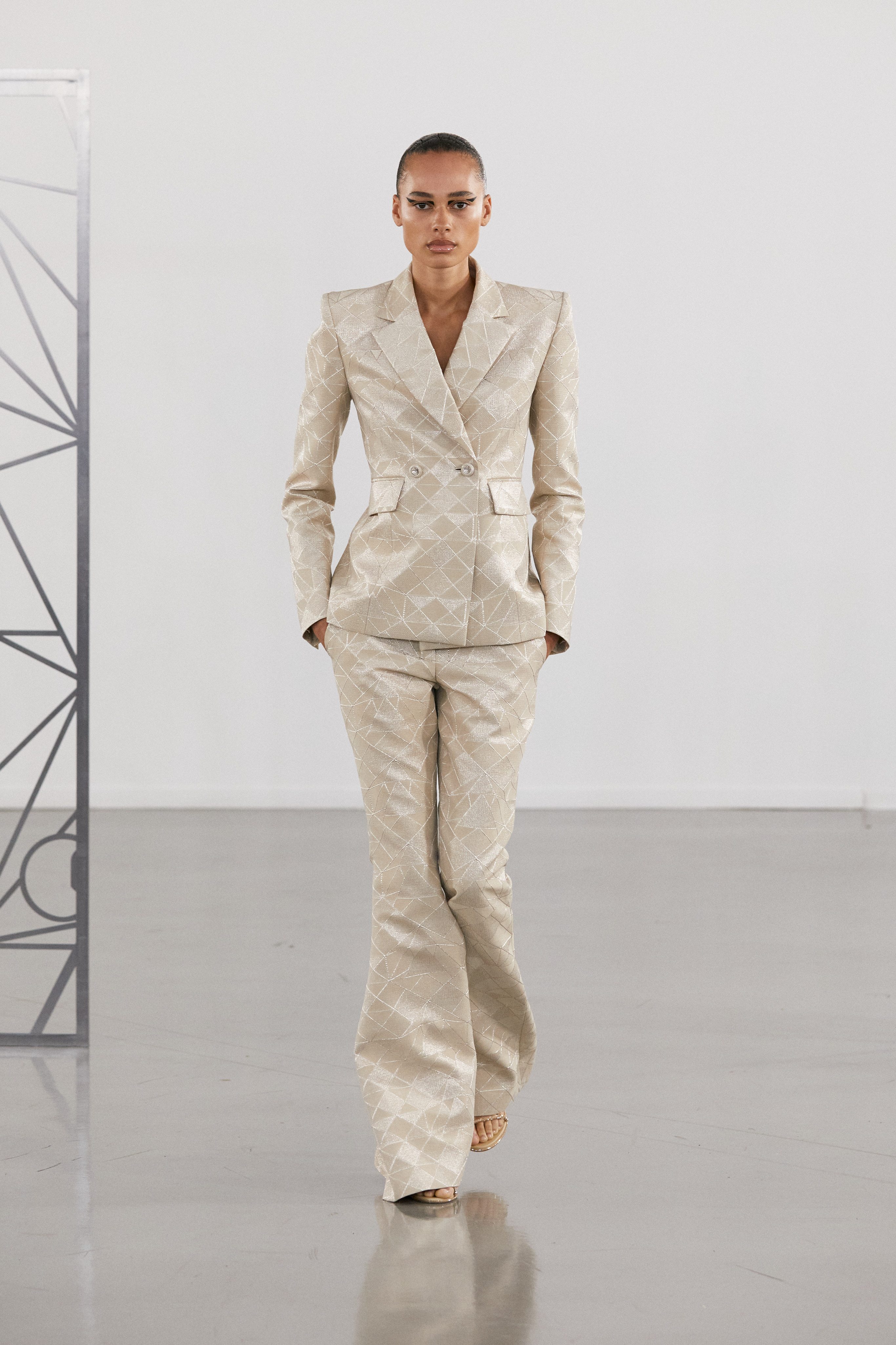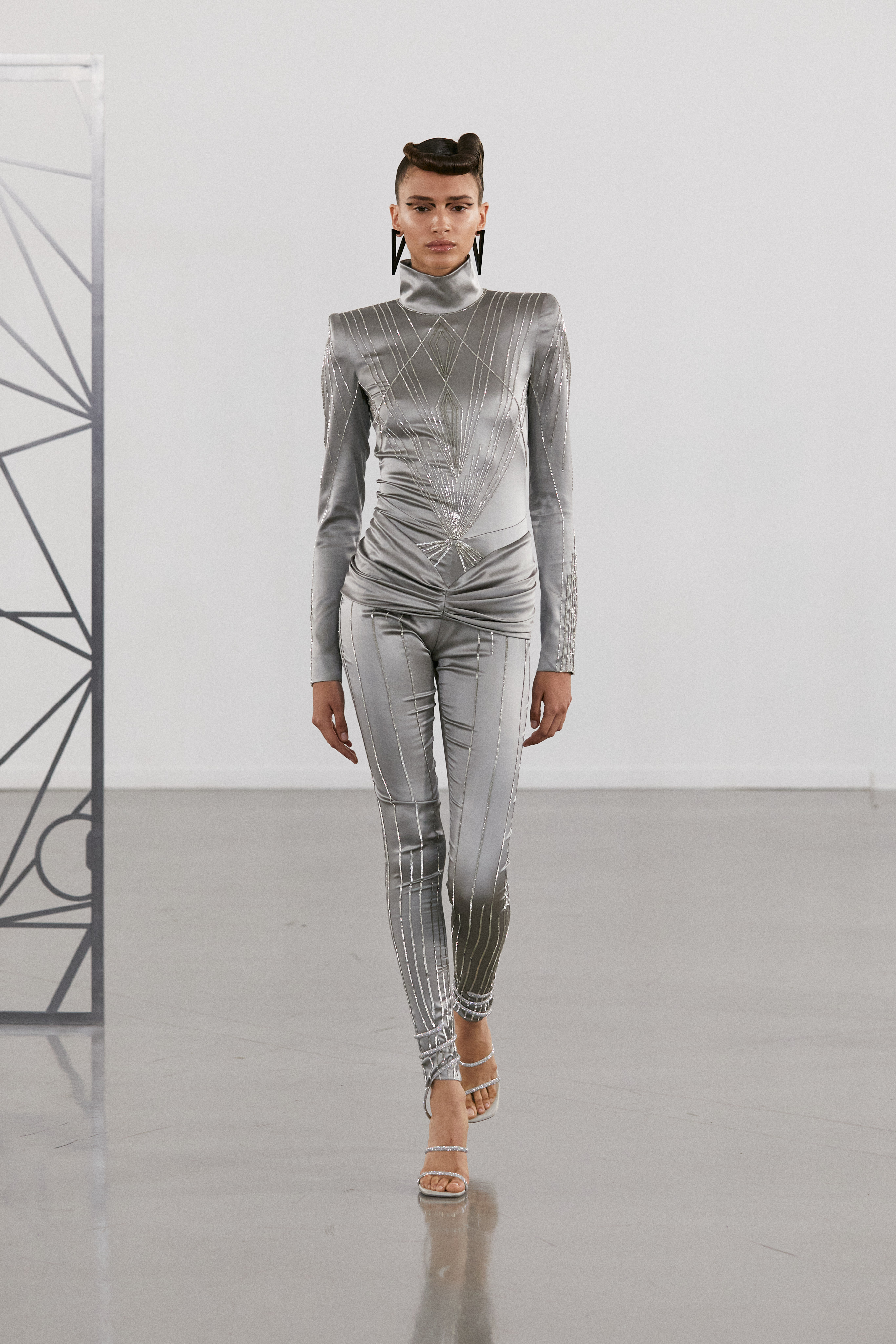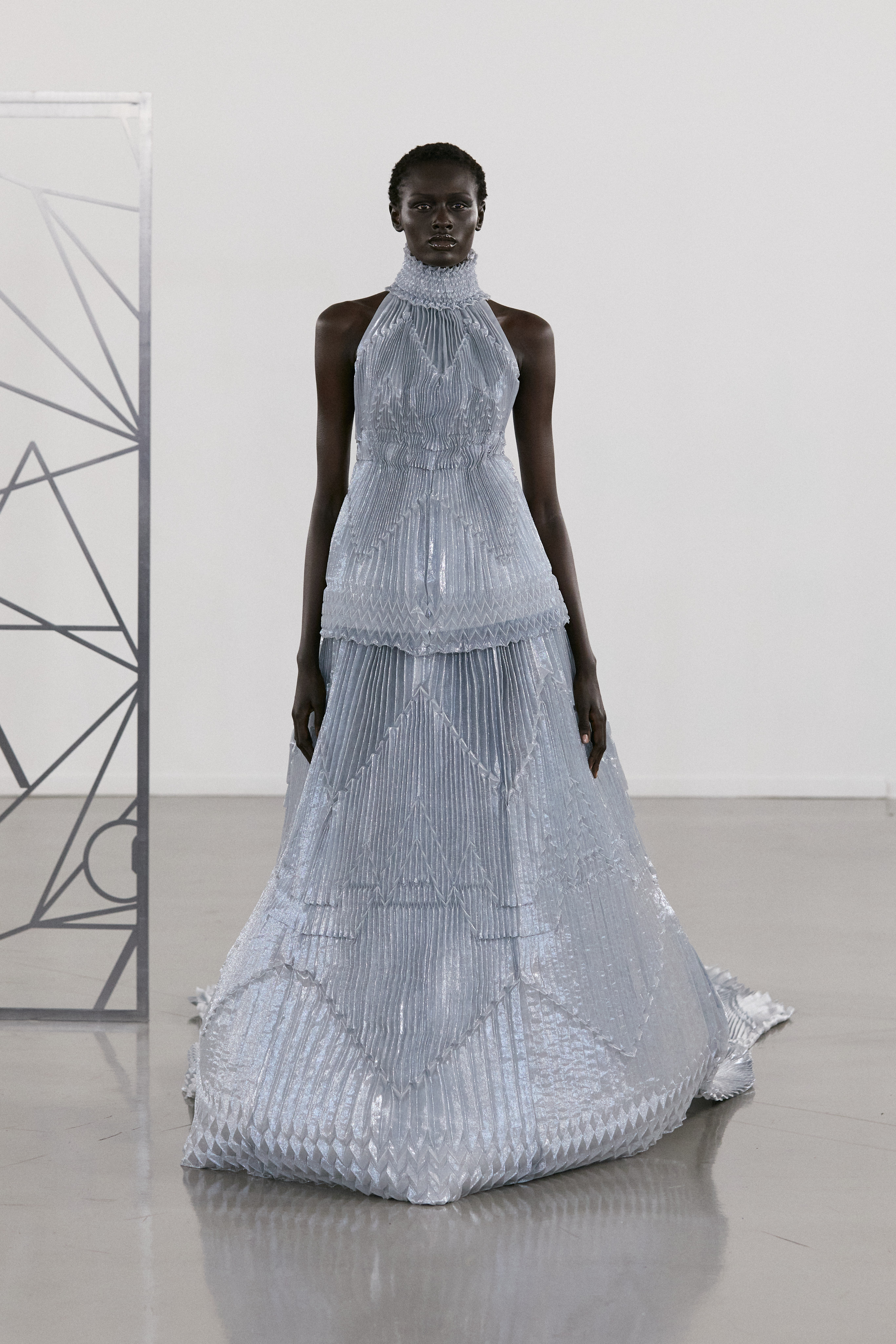 Geometry is a recurring theme. The ‘Vega’ dress, made of a fine silk, takes inspiration from an ornamental ceiling in the ancient Persian city of Yazd, its elaborate mathematics informing the composition of the dress’ plissé, appliqué, and intricately embroidery beads, sequins, and silver threads. The collection also presents bespoke jacquard fabrics, patterned with the atomic structure of the mineral Beryl, applied to an impeccably tailored suit and a gown with a long train, both geometrically cut to create the ArdAzAei stone cut.