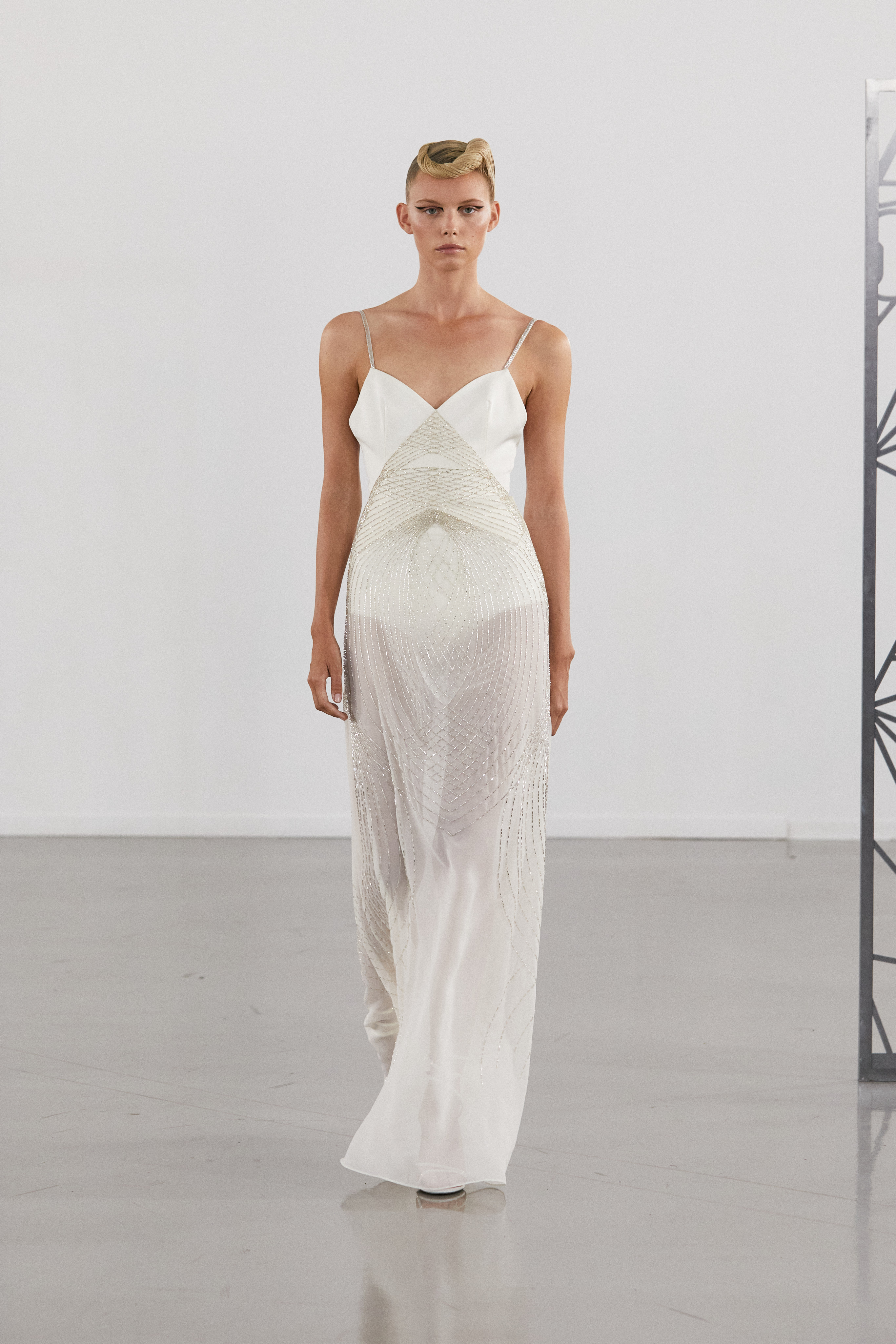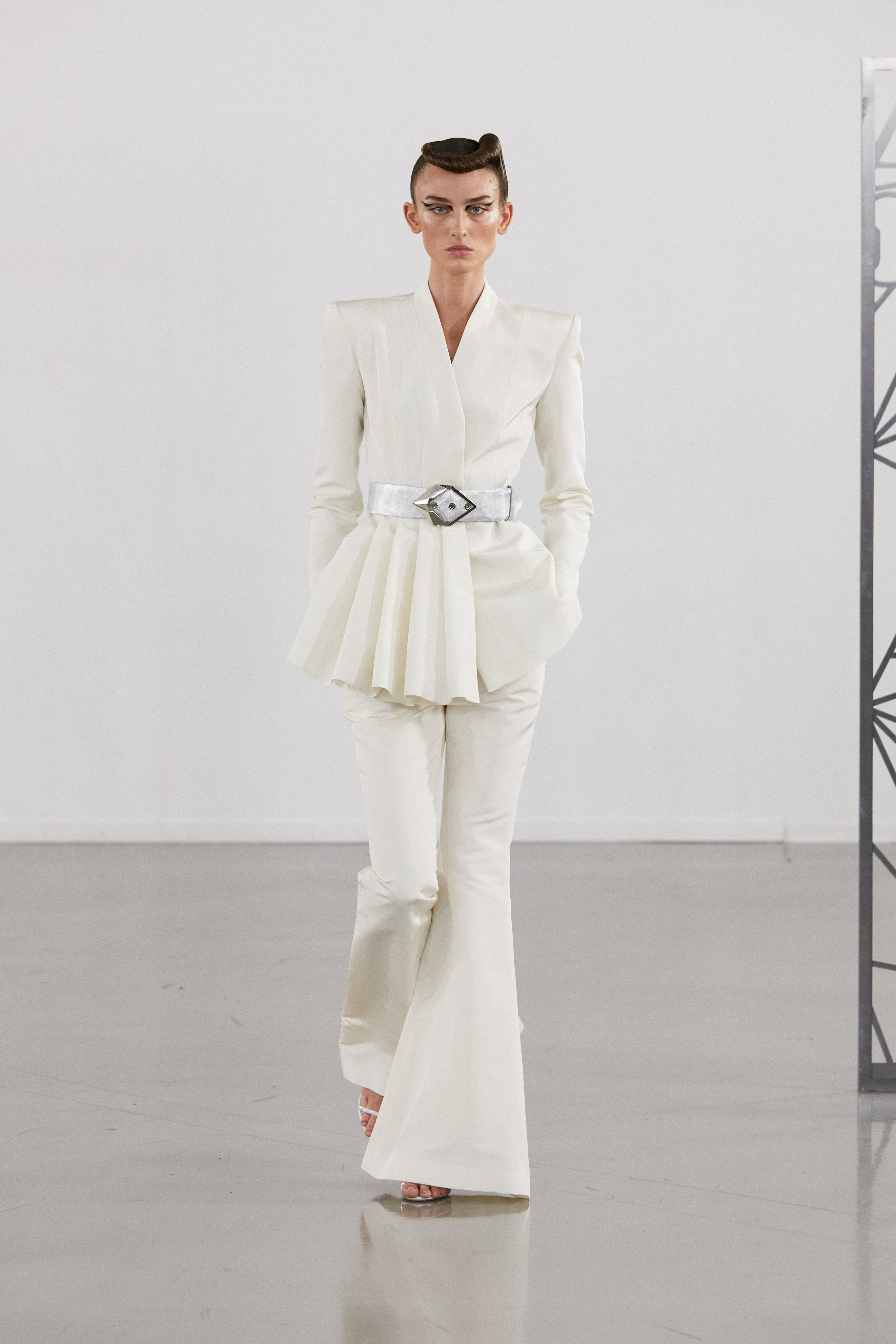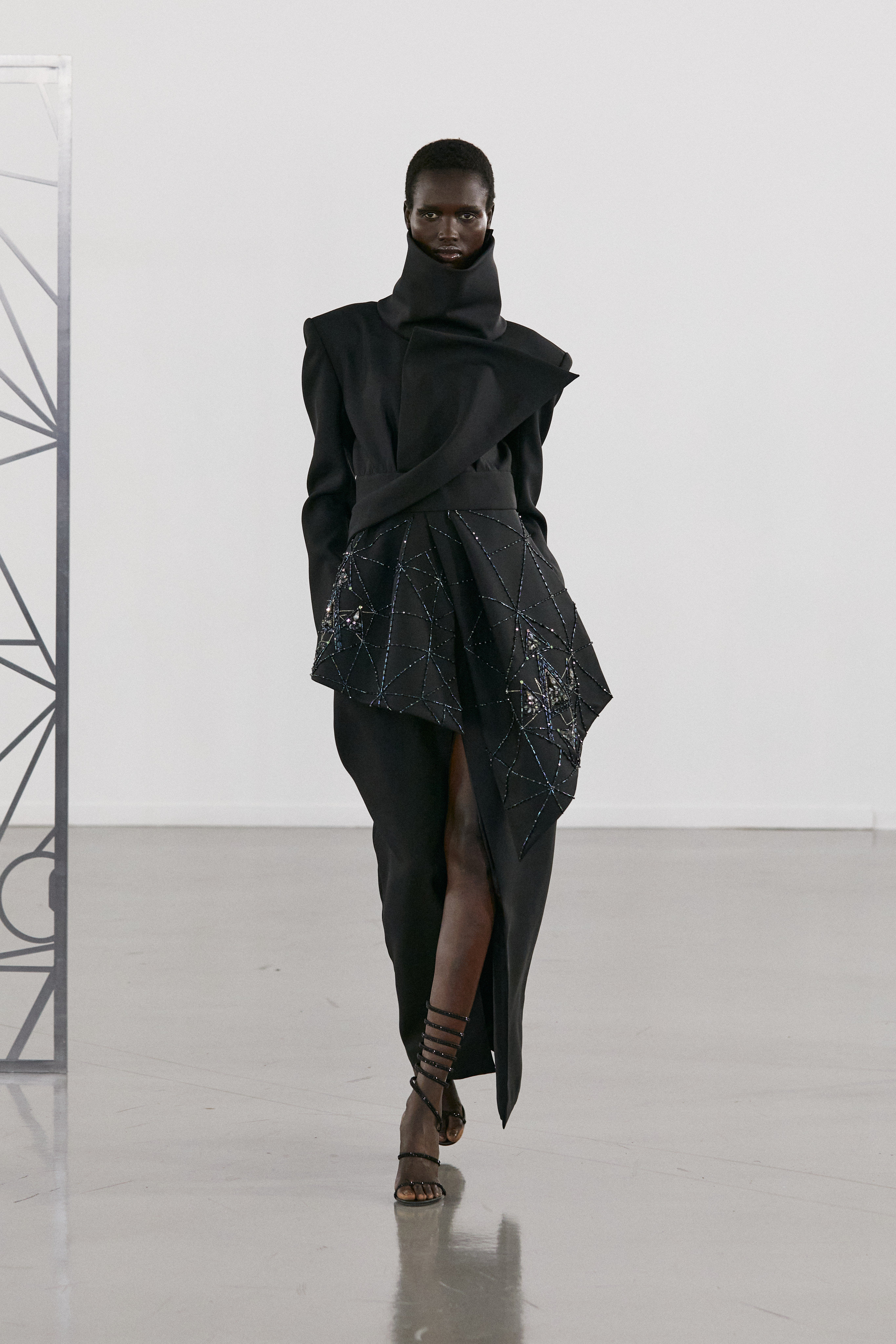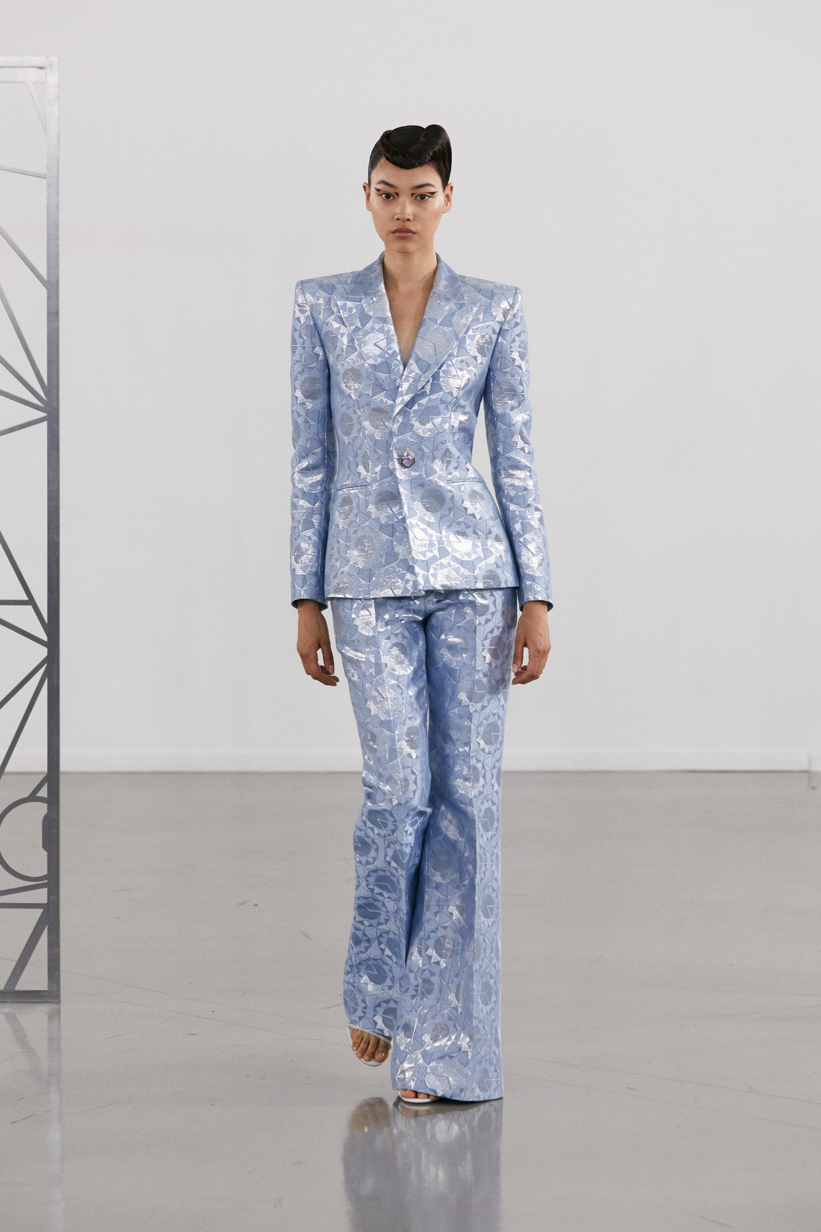 Geometry is a recurring theme. The ‘Vega’ dress, made of a fine silk, takes inspiration from an ornamental ceiling in the ancient Persian city of Yazd, its elaborate mathematics informing the composition of the dress’ plissé, appliqué, and intricately embroidery beads, sequins, and silver threads. The collection also presents bespoke jacquard fabrics, patterned with the atomic structure of the mineral Beryl, applied to an impeccably tailored suit and a gown with a long train, both geometrically cut to create the ArdAzAei stone cut.