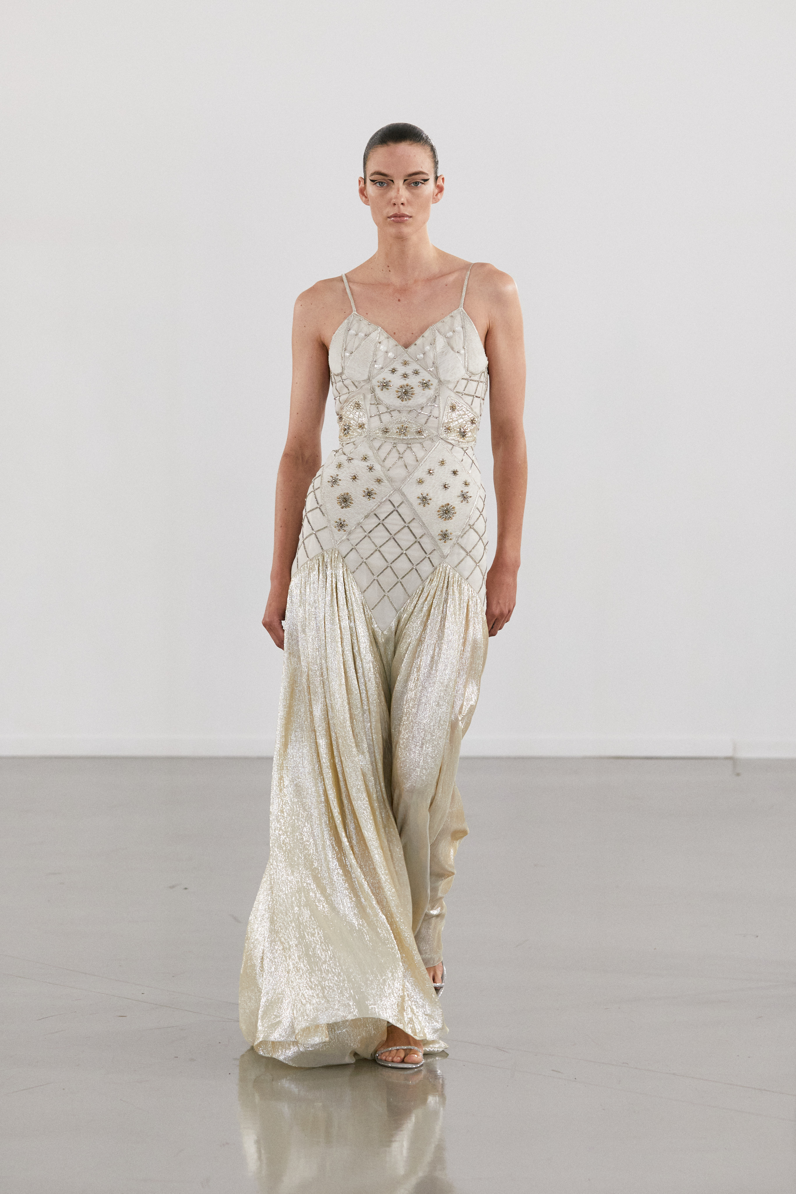 A collection of 24 looks, The Diffraction of Light showcases hand-crafted couture techniques of smocking, pleating, embroidery, and appliqué, in order to create the effect of light radiating from a garment. The theme of light is also interpreted, quite literally, through the use of the lightest of fabrics, often sheer, to reveal the meticulous attention to detail of their construction, and how their true beauty comes from within.