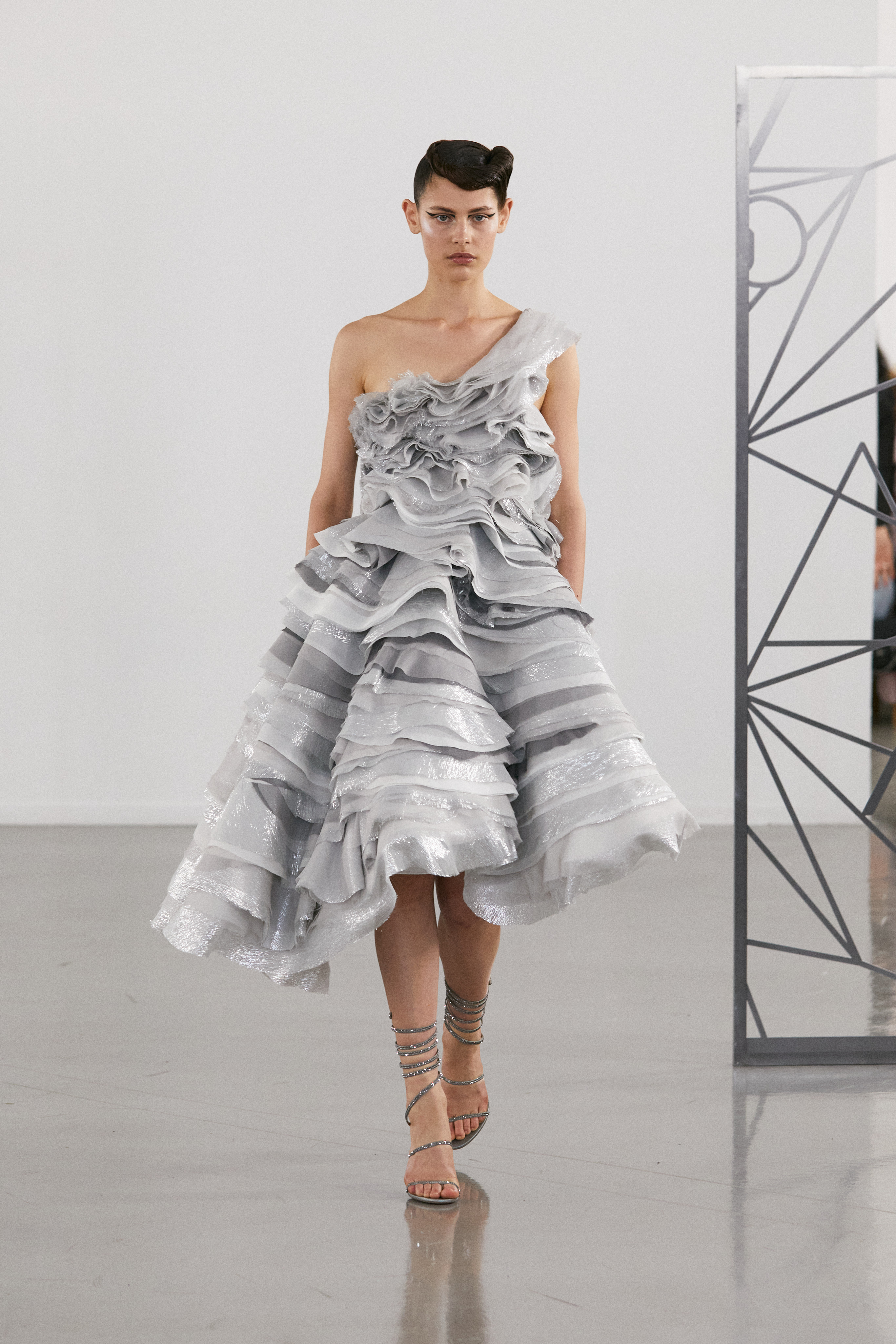 The collection’s asymmetric lines and geometric shapes are contrasted by soft, voluminous draping, as seen in ‘June’. An evening dress defined by its featherlight layers of silk chiffon, organza and shimmering silver lurex swirling gracefully around the body, over 850 hours, and 200 meters of silk were required to create its sumptuous volume. Through working with France’s most skilled couture artisans, the theme of lightness is also applied to a uniquely supple, vegetable-tanned Swedish reindeer leather, crafted to drape and swirl around the body.