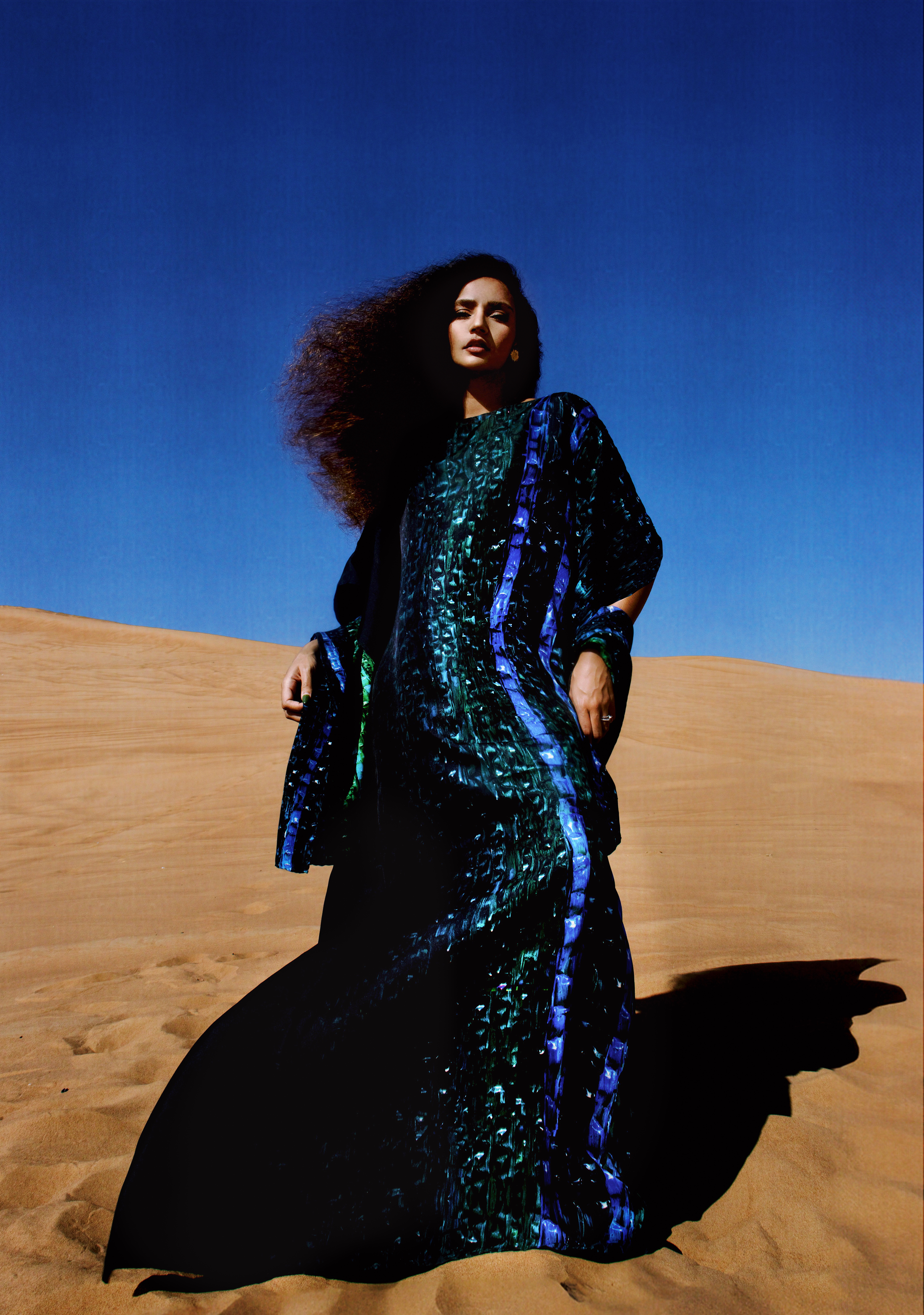 Shot against the breathtaking backdrop of Middle Eastern deserts, Batita’s campaign encapsulates silhouettes in perpetual motion—light fabrics dancing with the wind, each fold and contour telling a story. This visual poetry highlights the seamless harmony between scarves, dresses, and kimonos, proving that fashion, much like art, is an exploration of form, texture, and spirit.