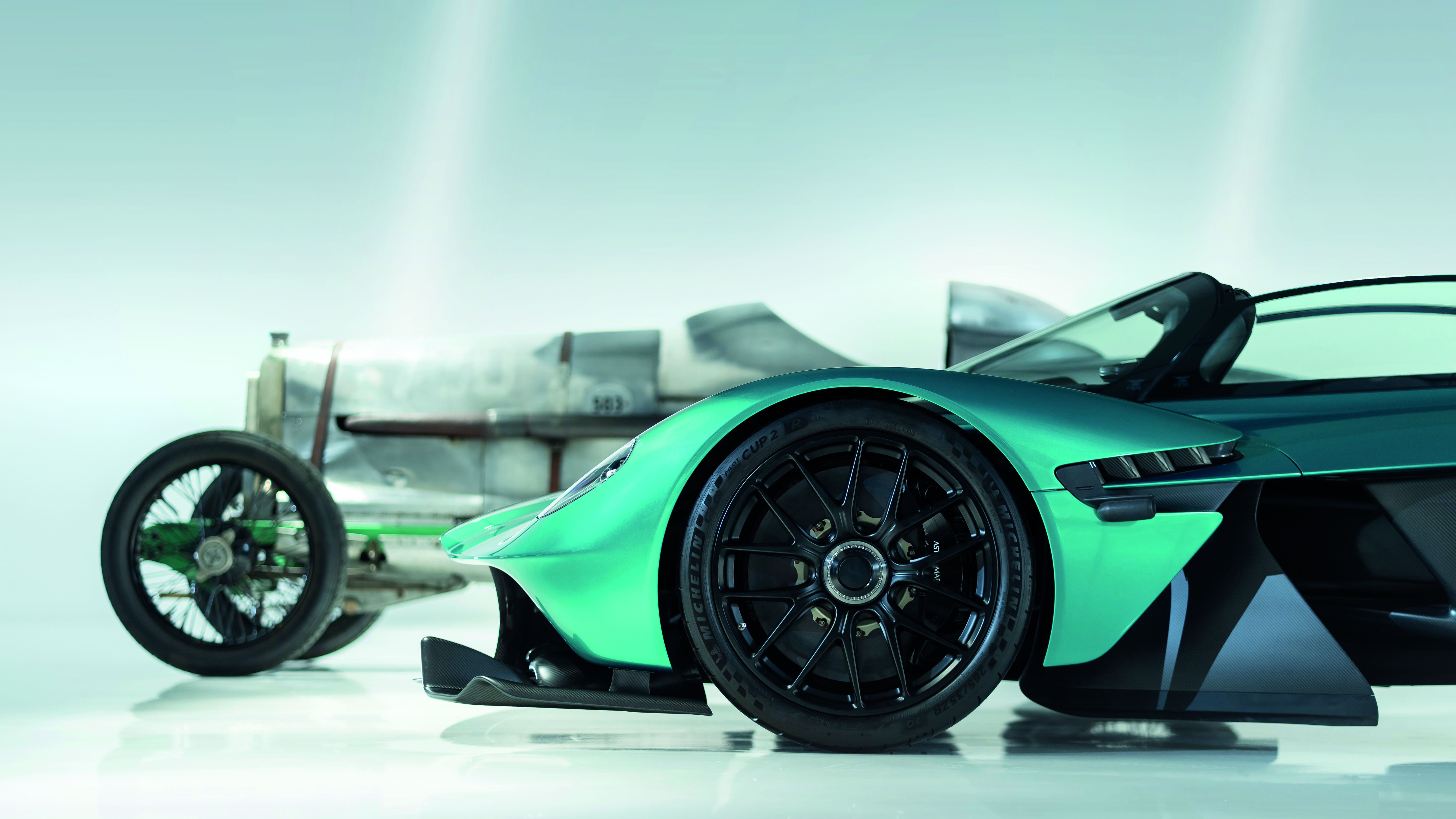 One of the brand’s oldest surviving racing cars, the record-breaking 1923 racer Razor Blade is pictured alongside the uncompromising Aston Martin Valkyrie hypercar.