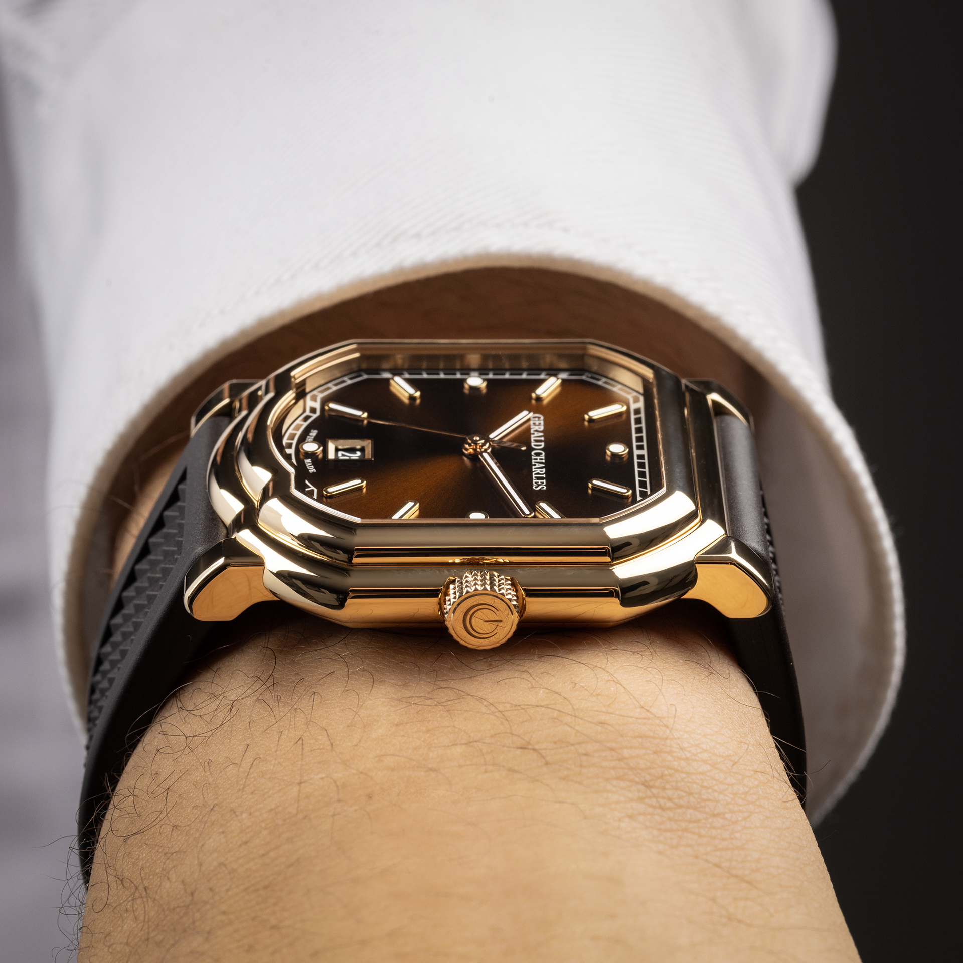 For the Maison Gerald Charles, precision, accuracy, as well as ergonomics and wearability are key features to develop a timepiece. Furthermore, as the case-back, the lugs and the strap are on the same straight line, the timepiece sits flat on the wrist and it’s perfect to be worn on any occasion.