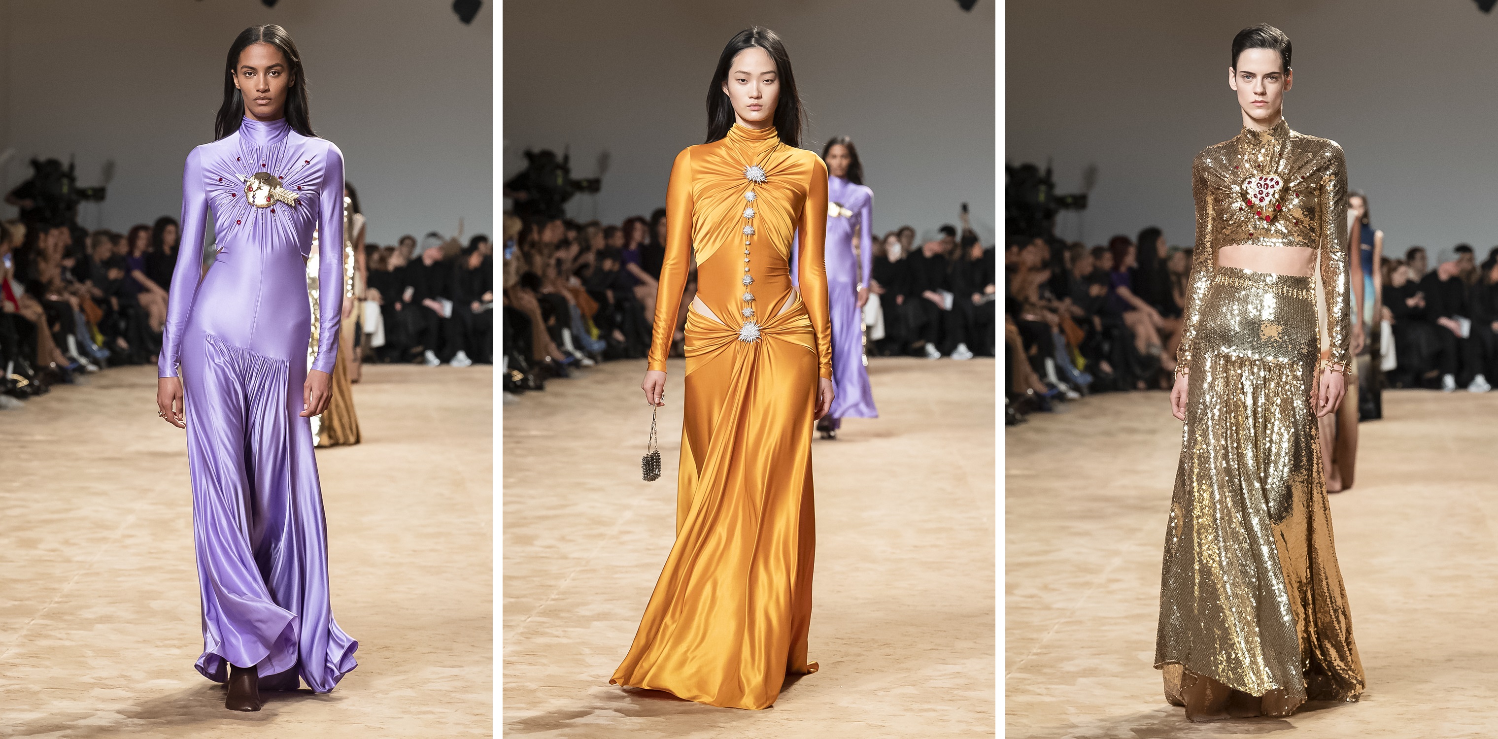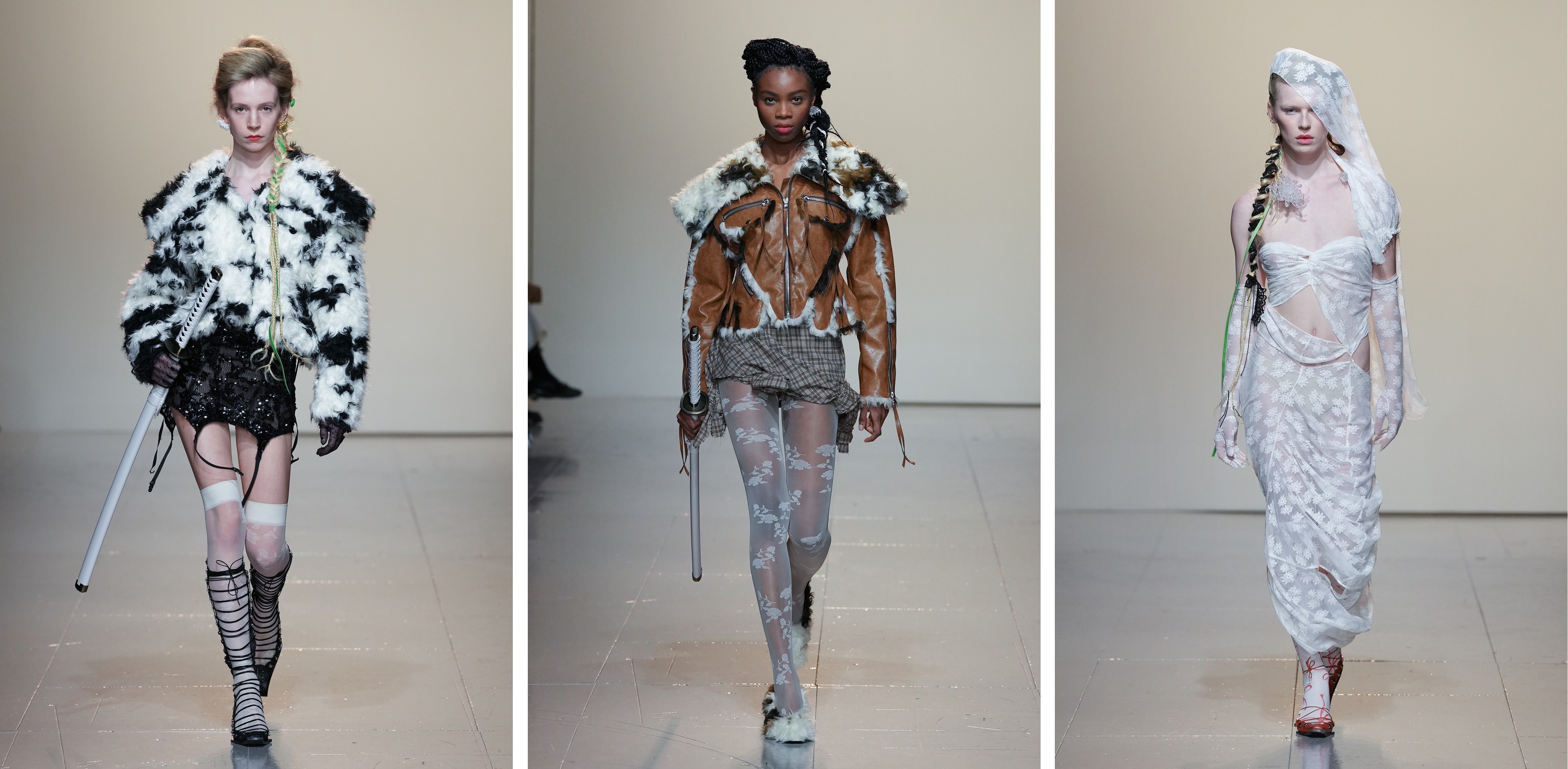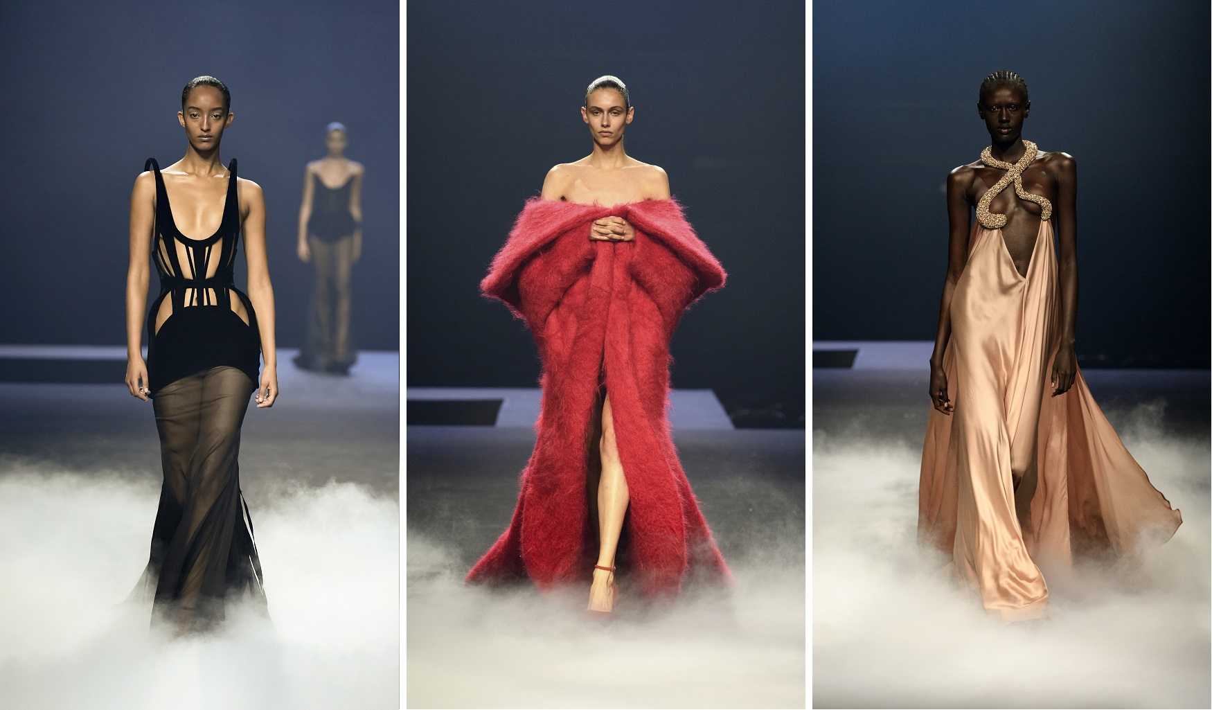 Cihan Nacar’s collection was a sweeping ode to fantasy and sensuality. A former swimmer turned designer, Nacar channels movement into fabric — and it shows. His FW25/26 lineup blended slinky evening wear with sharply tailored suits, resulting in a gender-fluid narrative rich in opulence and architectural beauty. Think plunging satin gowns in deep emerald and midnight blue, juxtaposed with razor-cut blazers that emphasised the waist and shoulders.