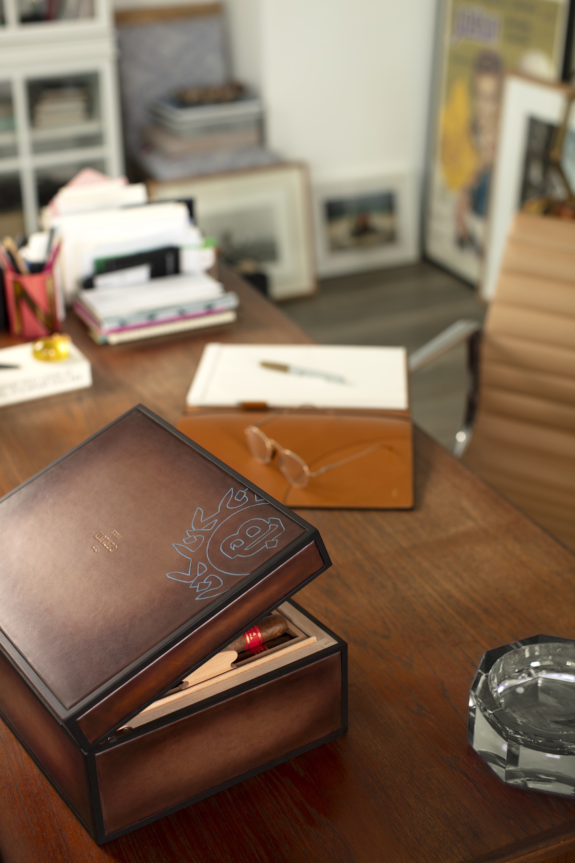 The resulting collection features an embroidered patch on a white T-shirt, as well as leather goods with the pattern tattooed on the Venezia leather using Berluti’s signature tattoo technique. Complete with a timeless Cacao Intenso patina, the selection includes a Bambou card holder, Makore wallet, Tersio pouch, Un Jour briefcase and Time Off backpack. A Formula 1005 rolling suitcase and a cigar box - a nod to Nadine’s own cigar connoisseurship - complete the offering.