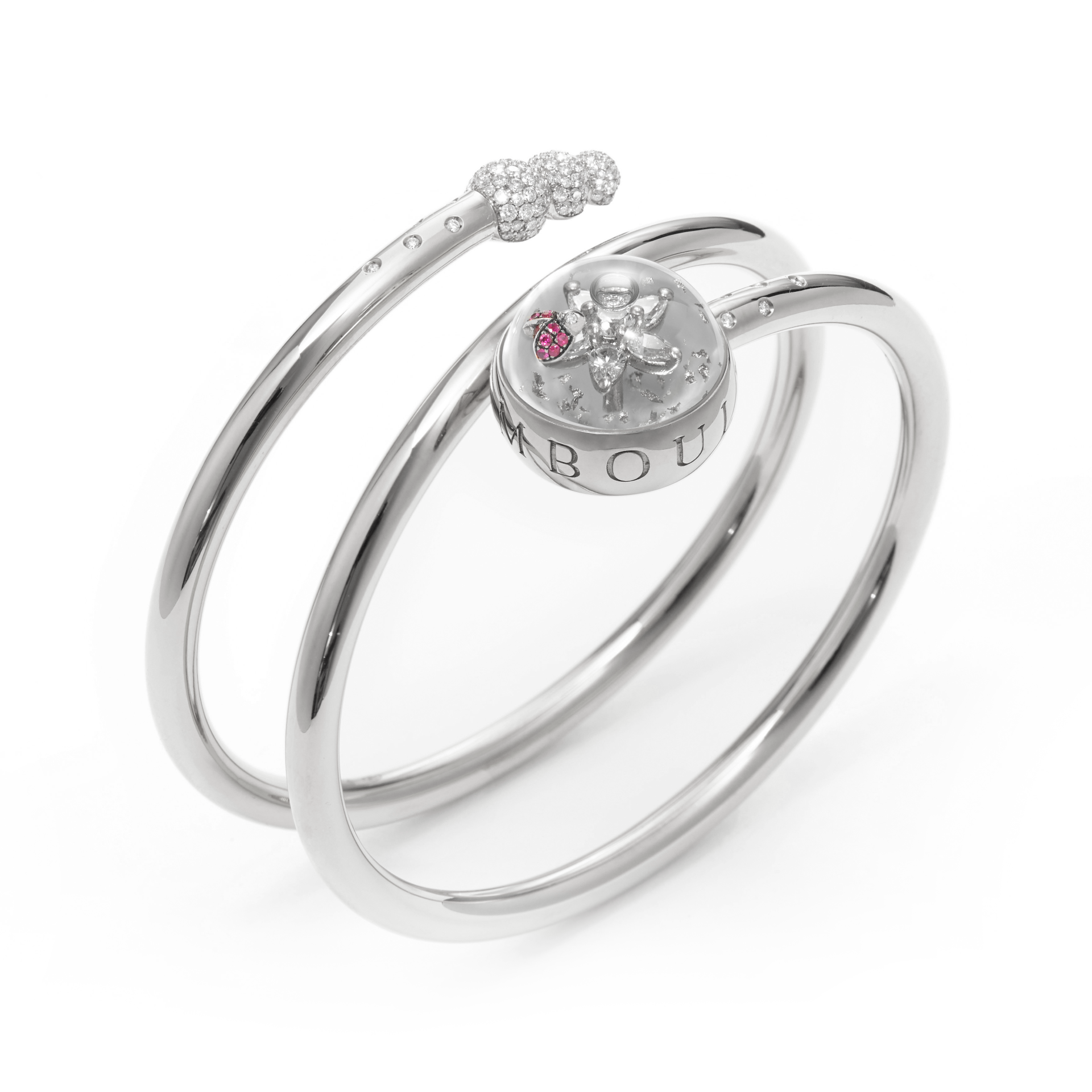 Dreamboule, the Milanese brand established by Beniamino Crocco, presents the BLOOM from the Chic & Shine Collection, a standout piece within the Bubble Line 16mm series. Fashioned from 18K white gold weighing 30.53 grams, it boasts 1.68 carats of white diamonds, 0.06 carats of rubies, and accents of white mother of pearl. The bracelet also includes Swiss Made sapphire crystal, 24K white gold flakes, and a distinctive liquid Dream Solution for captivating slow-motion movement.
