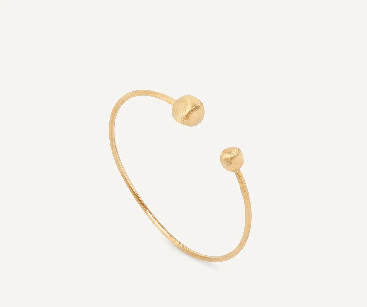 A rigid bracelet with linear beauty, embellished at the ends with two irregular spheres in 18kt yellow gold. Finely hand-engraved using the ancient millgrain technique, it is elegant on its own and perfect when paired with other bracelets from the collection.
