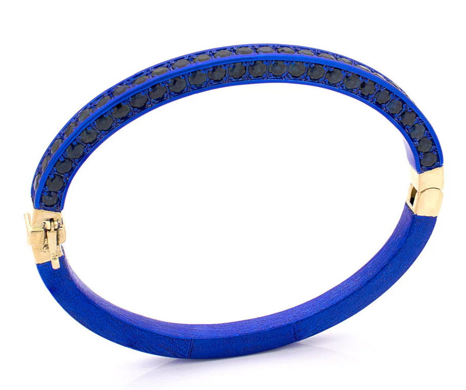 Faraone Mennella presents the Husband cuff, an exquisite piece crafted in 18kt gold and sterling silver, featuring 9.88 carats of blue sapphires. This elegant cuff combines sophistication and luxury, making it a standout accessory for any occasion.