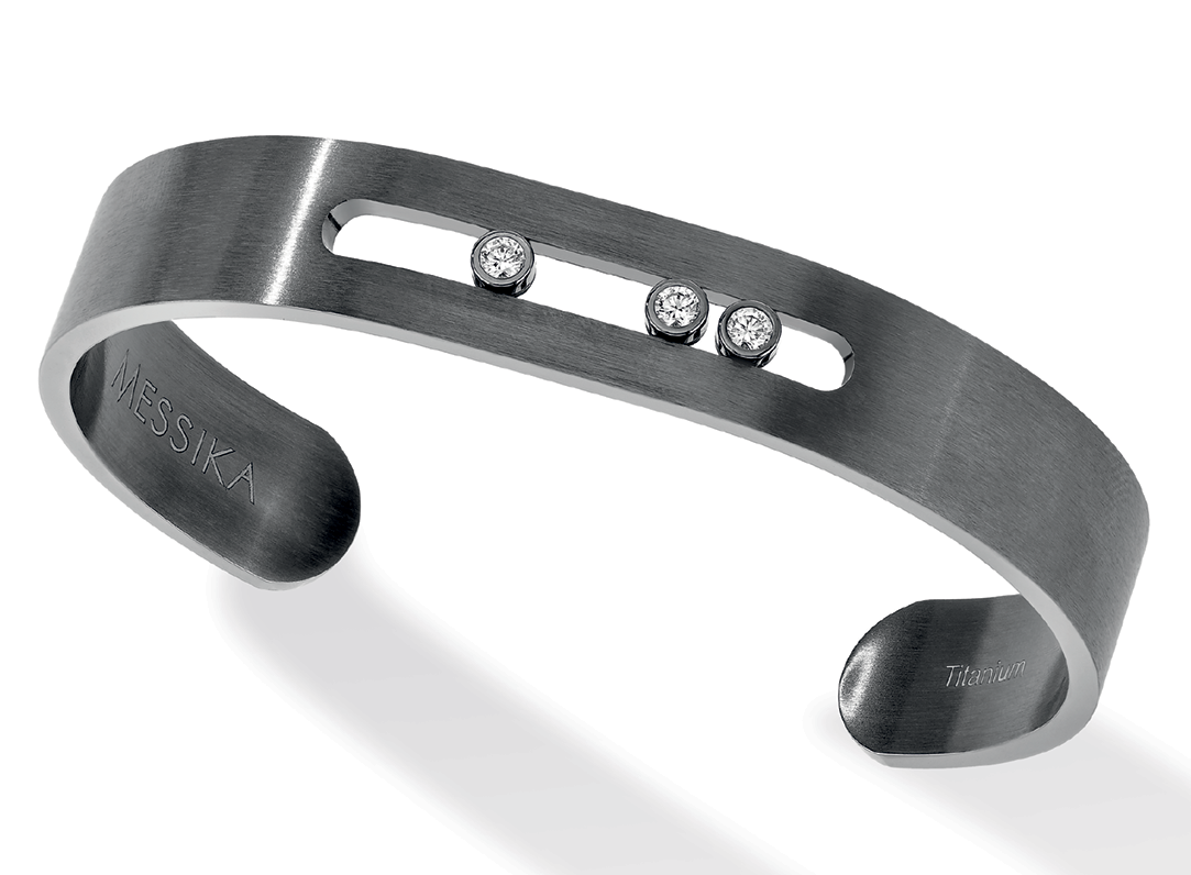 Valérie Messika's graphite titanium and brilliant-cut white diamond bangle bracelet epitomizes modern masculinity and elegance. Part of the Move Titanium collection, this bracelet features sleek, minimalist lines and playful, moving diamonds. The combination of robust graphite titanium and dazzling white diamonds, with a diamond weight of 0.25 carats and a width of 11 mm, creates a striking contrast of strength and luxury. Available in graphite, natural, and black titanium, it offers options for various styles. This bracelet is a testament to Messika's innovative design and craftsmanship, making it a perfect statement piece for any occasion.