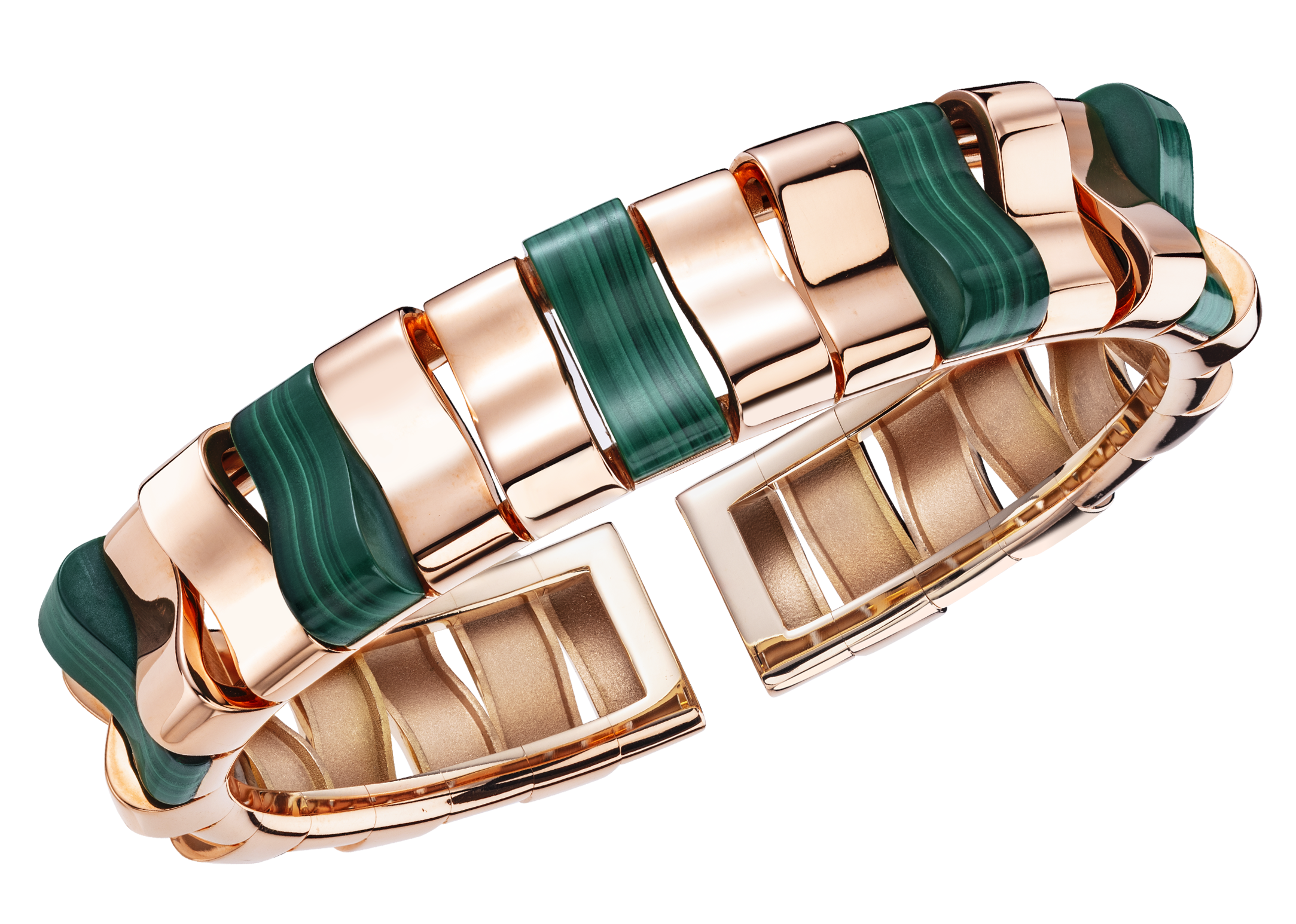The renowned Milanese luxury brand Sabbadini introduces the Onda bracelet, a classic yet timeless piece designed for the strong yet sophisticated man. Crafted in pink gold and malachite, this bracelet features sinuous lines that evoke the waves of the sea, seamlessly integrating with the wearer's arm.