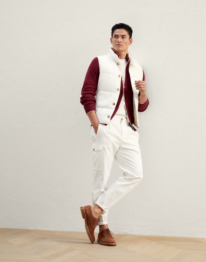 The highest-quality materials, artisanal workmanship and the refined, elegant, luxurious and discreet style that is distinctive to Brunello Cucinelli reinterprets functional components and inspiration from nautical and adventurer uniforms.