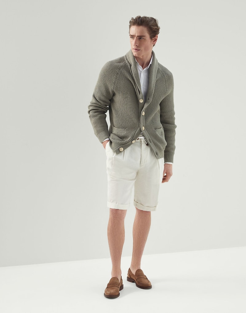The crisp, light and compact texture of the twisted linen and cotton gabardine fabric combines perfectly with the sporty style of these bermuda shorts, a warm weather wardrobe must-have.