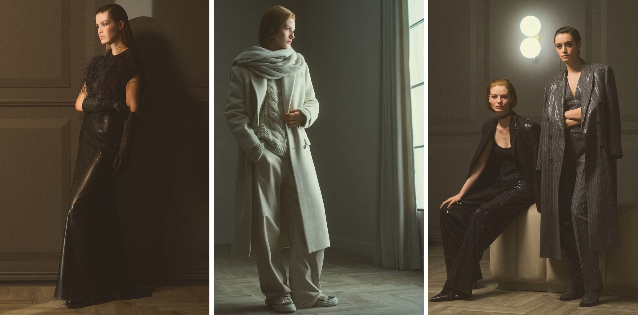 In-depth research into the quality of the shades deepens the endearing sense of enduring colours, with a special privilege given to the timeless shades of grey. Black breaks away from its classic rigidity to take on a cosy, three-dimensional nature, becoming a coherent expression of the brand's character in the interpretation of the most special garments and in the creation of graphic effects in combination with beige.