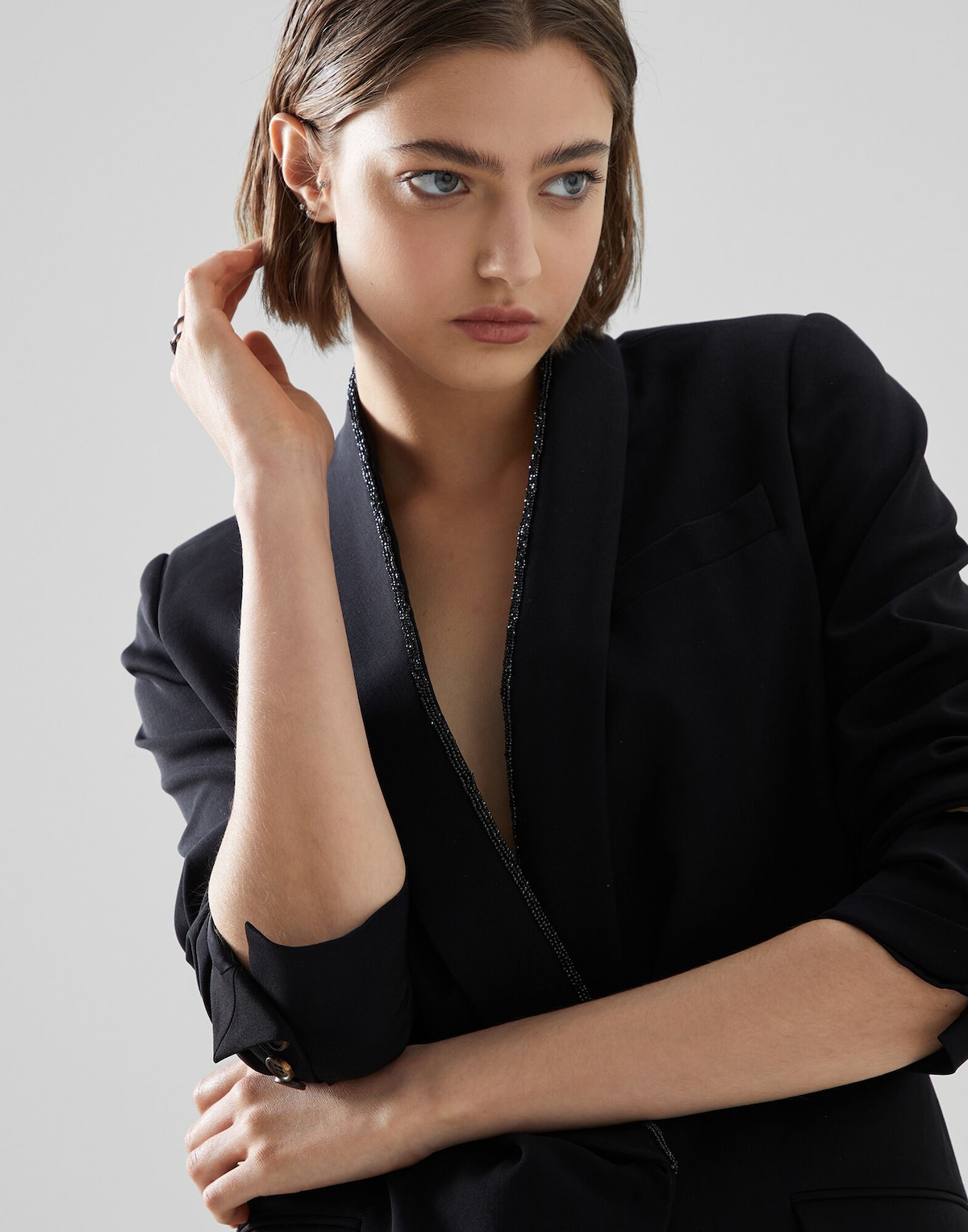 Elegance, femininity and beauty are the key words to describe this new techno virgin wool Couture gabardine blazer. The tailored details of the welt flap pockets and the casual feel of the shawl collar give life to a silhouette with sophisticated style. A dense precious monili embroidery illuminates the edge of the collar, creating a sparkling trail in true Brunello Cucinelli style. The acetate and silk-blend satin lining provides added comfort.
