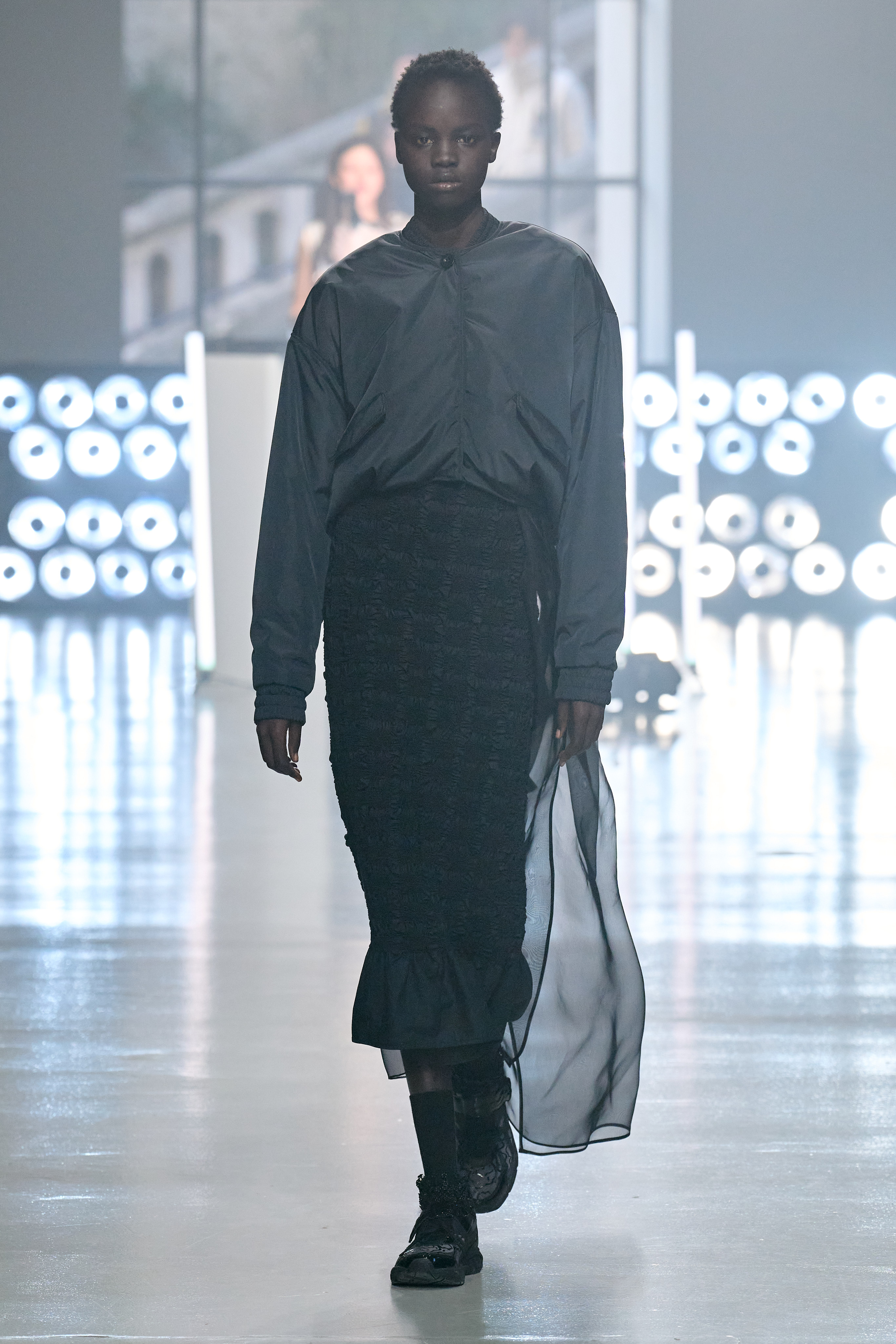 The brand continues to explore reducing waste, partnering for the first time with Nona Source, the LVMH backed fabric resale platform, which “re-sources” exceptional luxury fabrics from its own labels. Cecilie’s method of working out her ideas on models, focusing on the touch and feel of fabrics, results in the distinctive volumes and silhouettes. This season, she found herself smocking and ruching, allowing the techniques to lead the design.