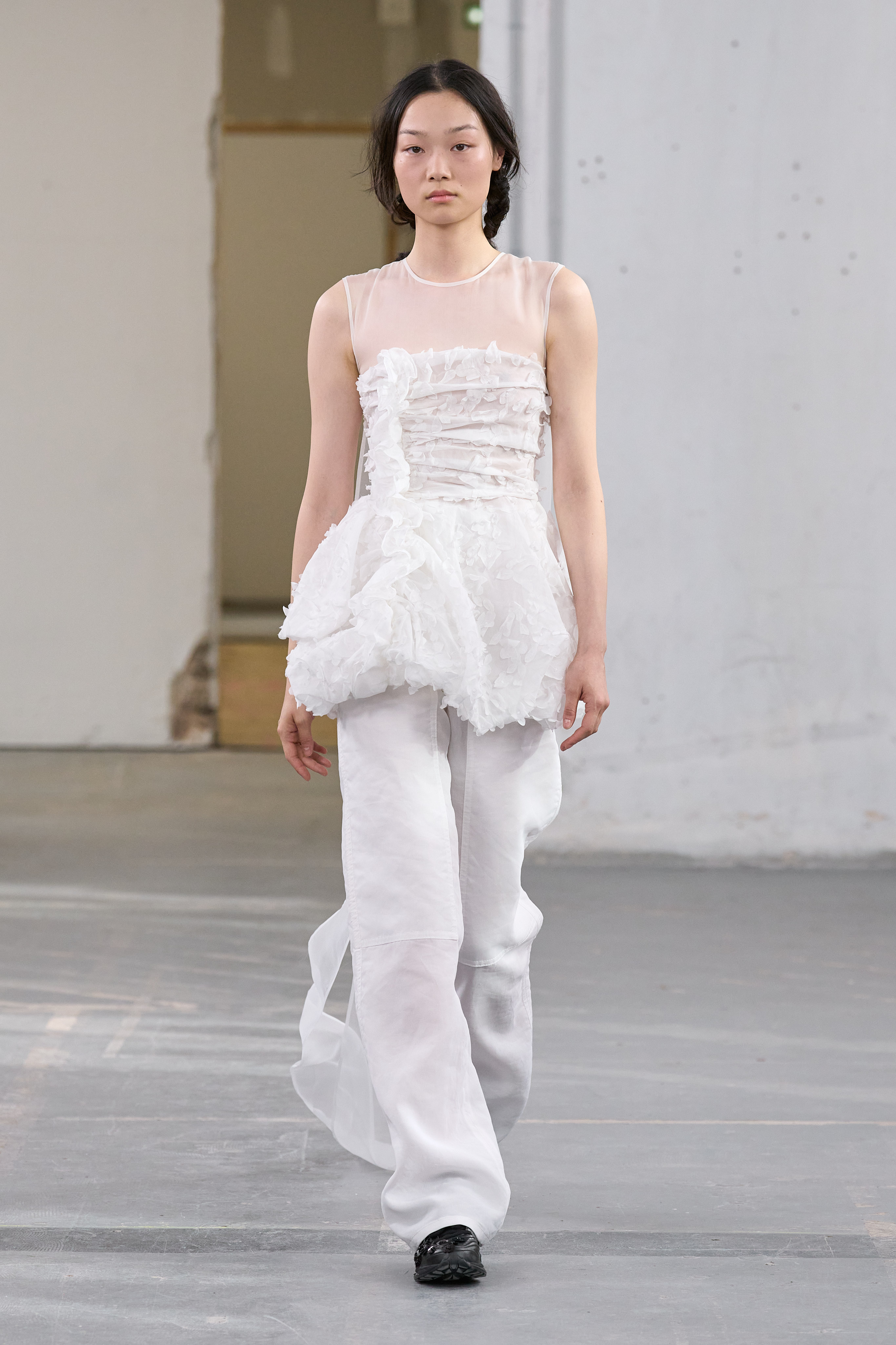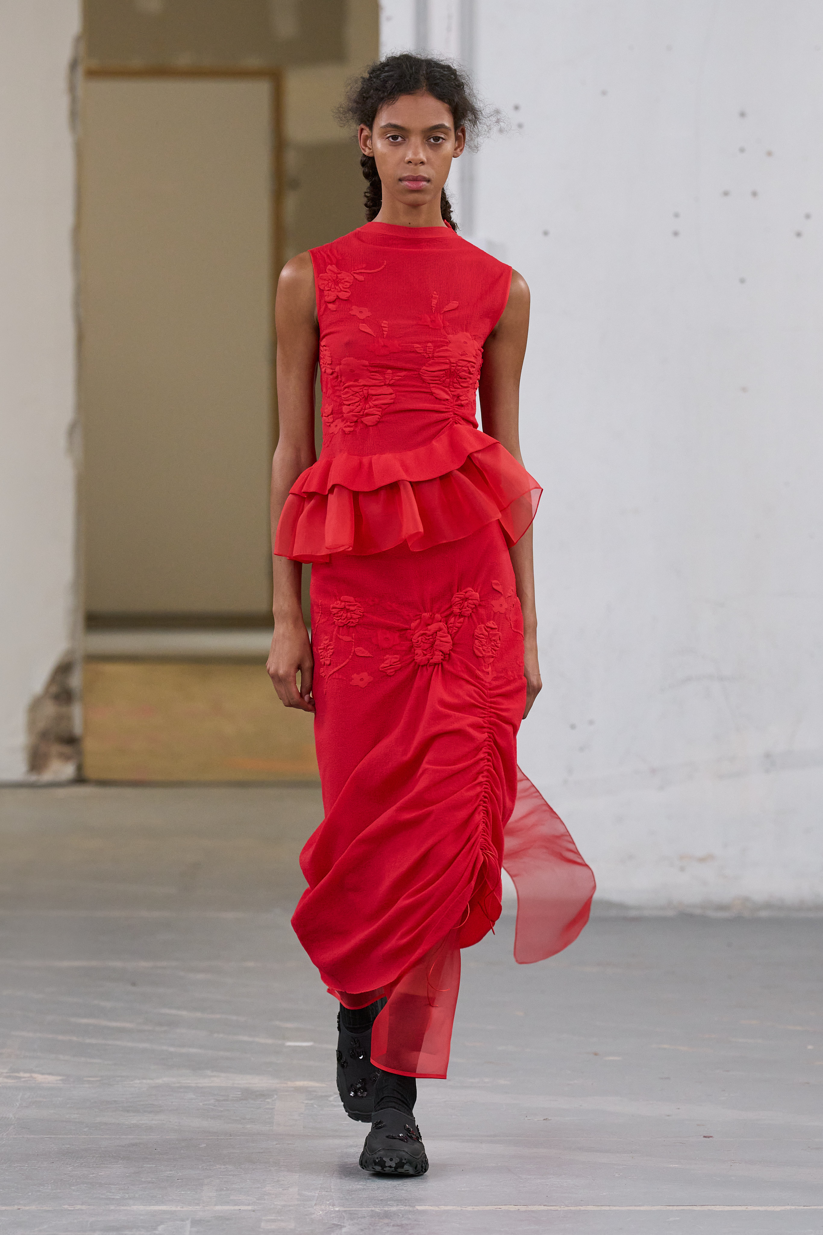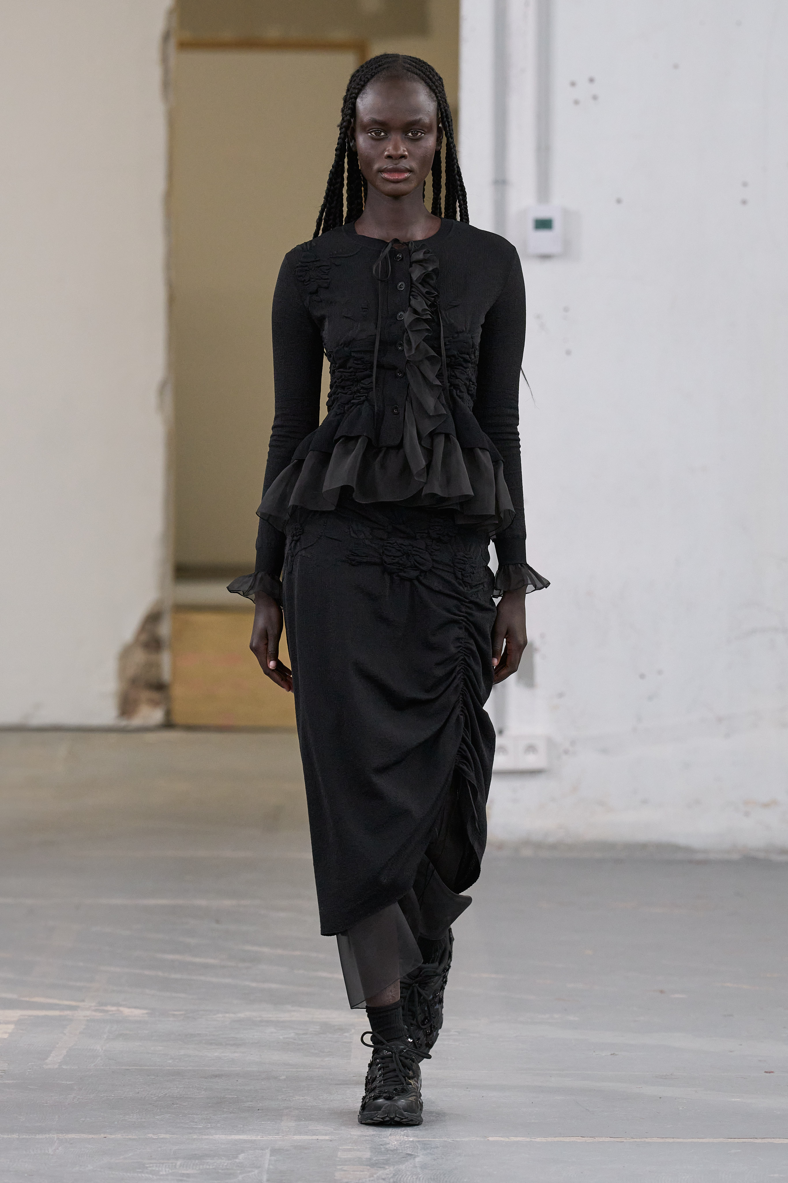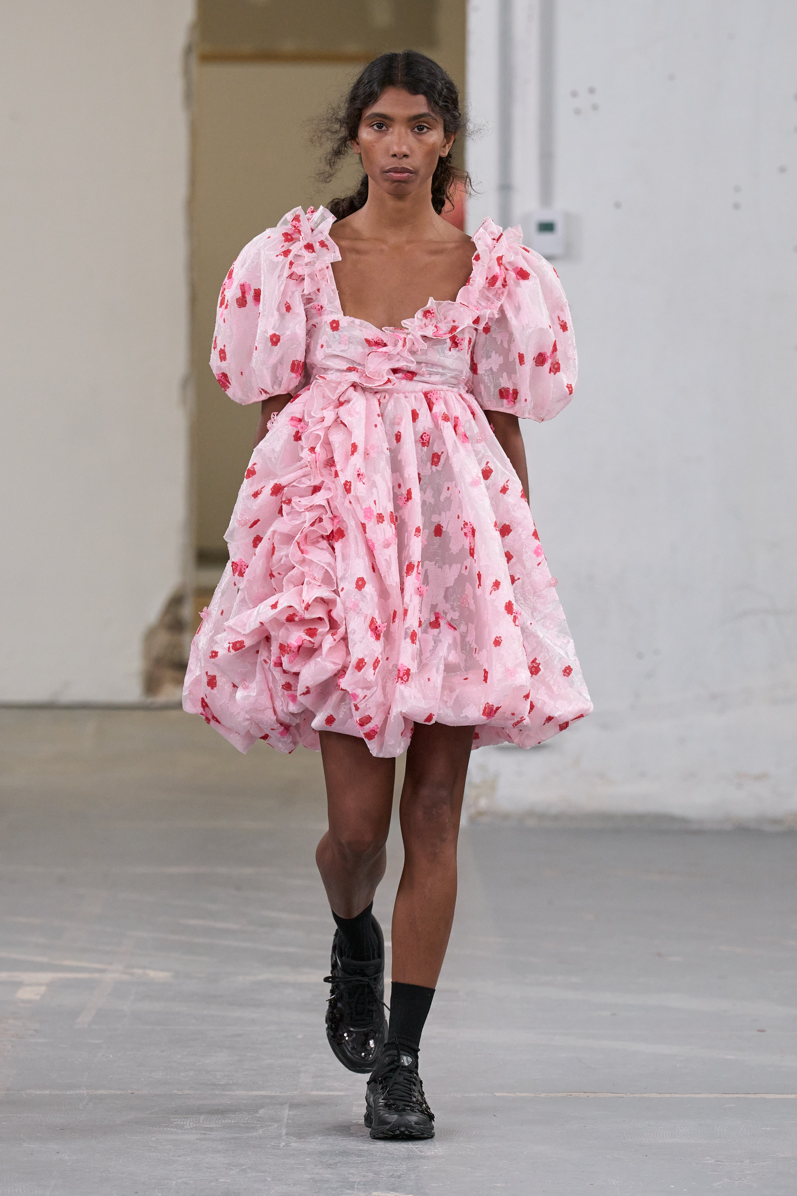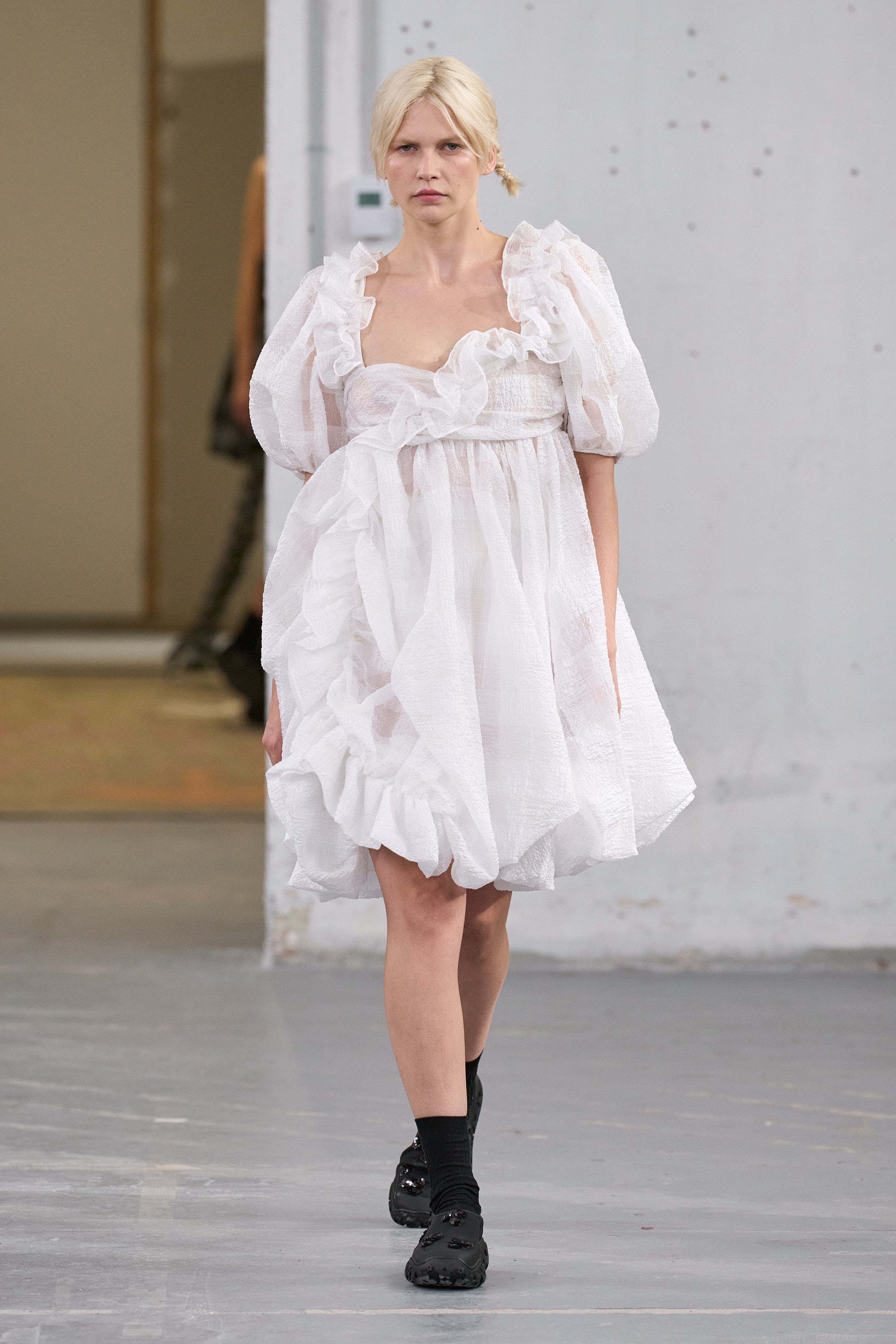 This season, Cecilie Bahnsen peels back the curtain on her process, with an intimate presentation showcasing the care and craftsmanship (more often craftswomanship) that goes into creating her romantic, ultra-feminine universe. The collection is presented in Paris at a raw space, 35/37, guests seated so close to the runway that fabrics brush up against them in whispers and the intricate details are seen, before taking on new shapes as they float down the runway faraway.