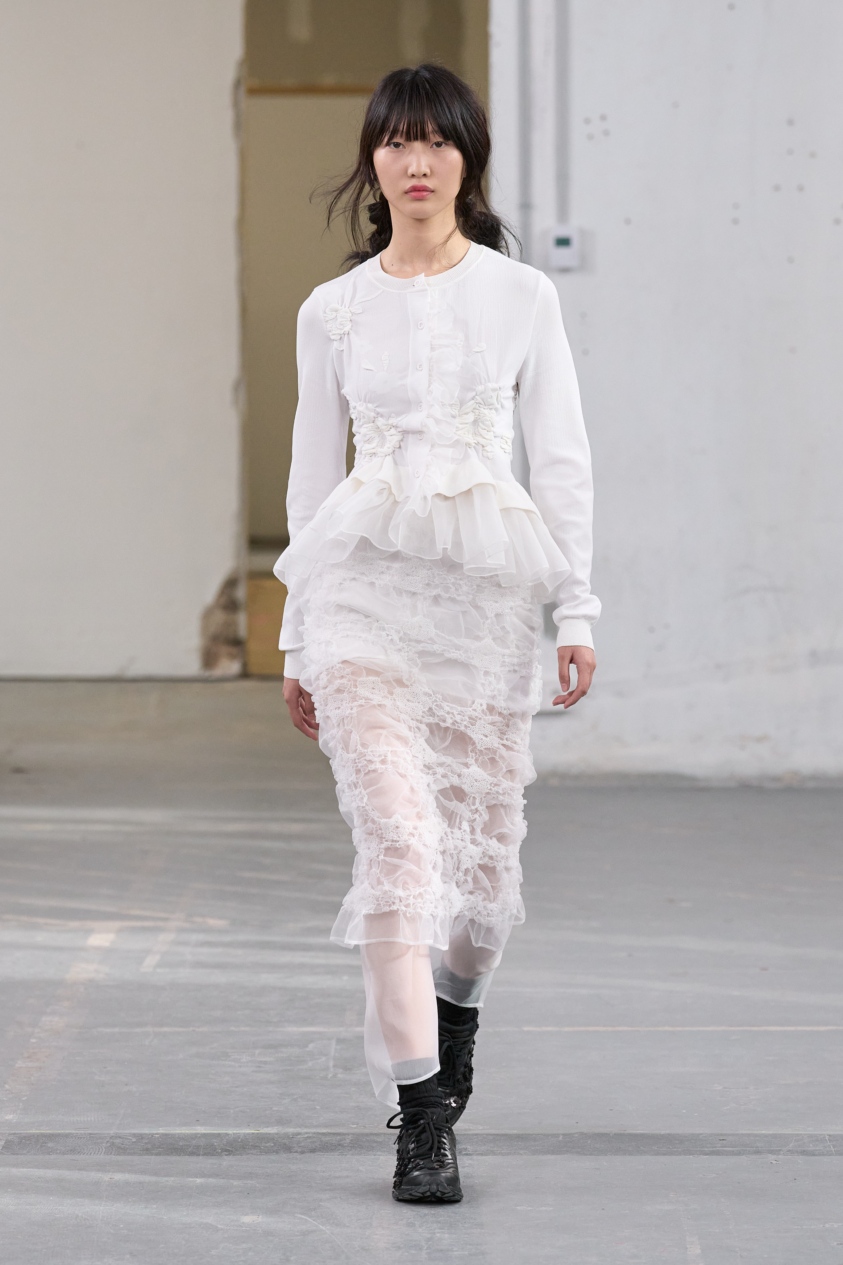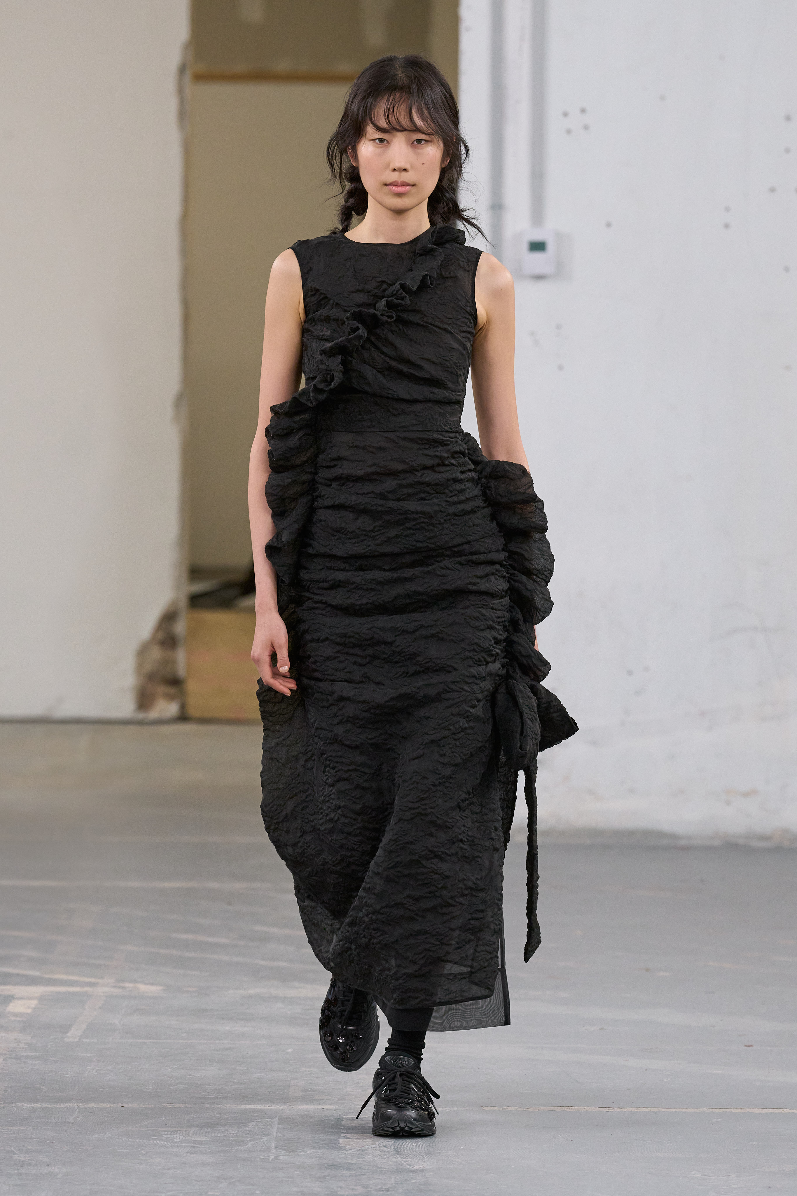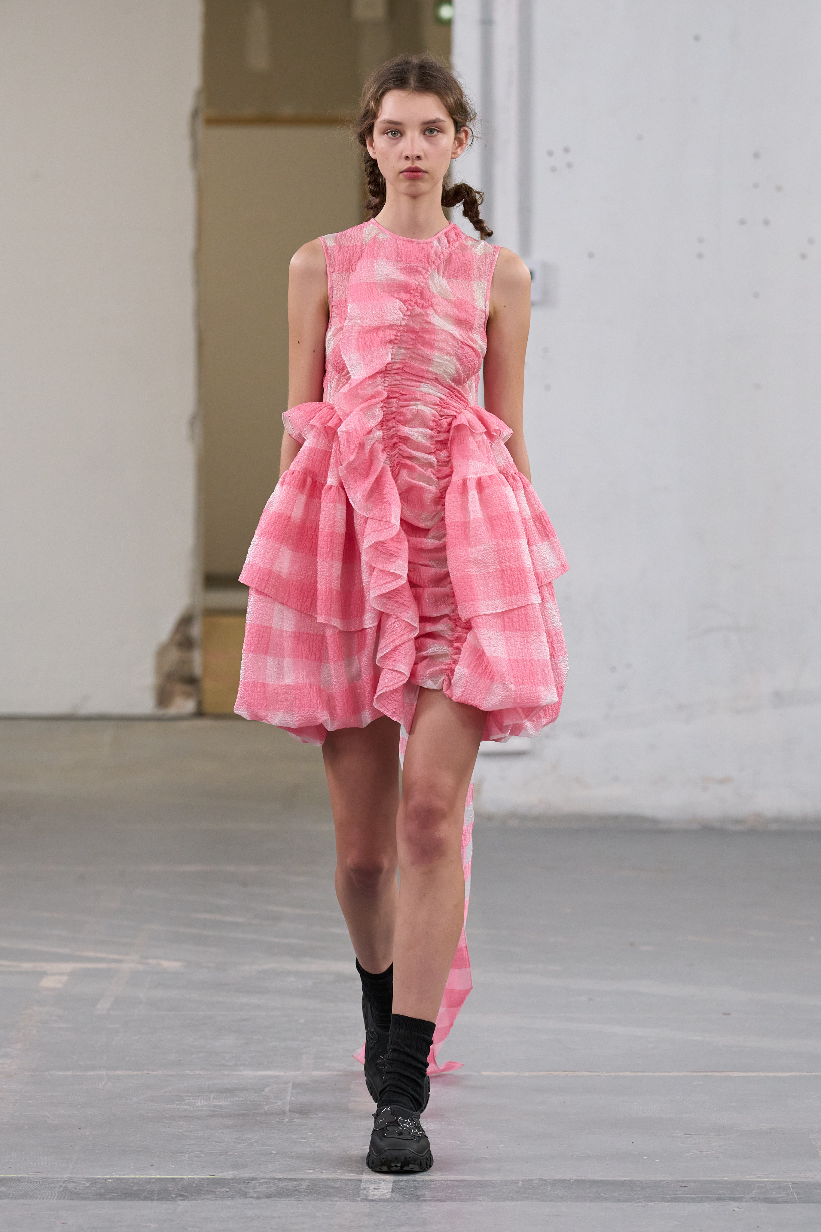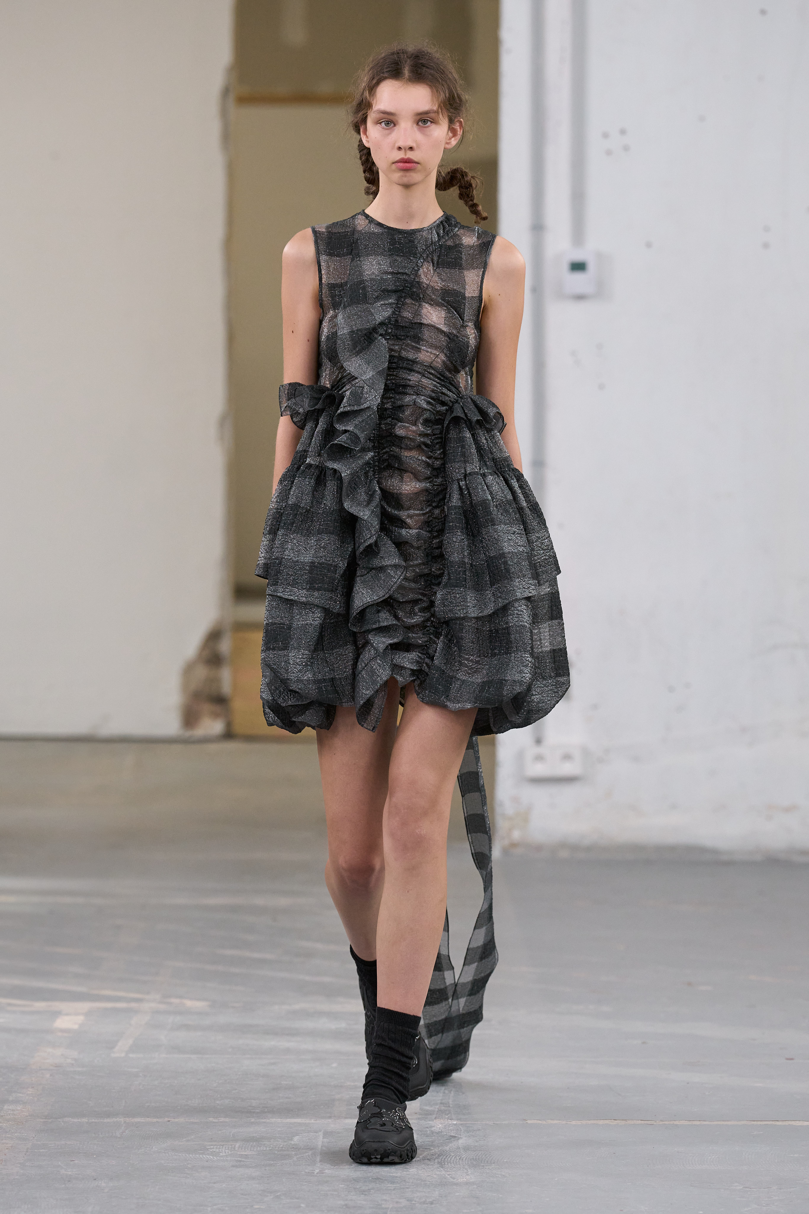 This season, Cecilie Bahnsen peels back the curtain on her process, with an intimate presentation showcasing the care and craftsmanship (more often craftswomanship) that goes into creating her romantic, ultra-feminine universe. The collection is presented in Paris at a raw space, 35/37, guests seated so close to the runway that fabrics brush up against them in whispers and the intricate details are seen, before taking on new shapes as they float down the runway faraway.