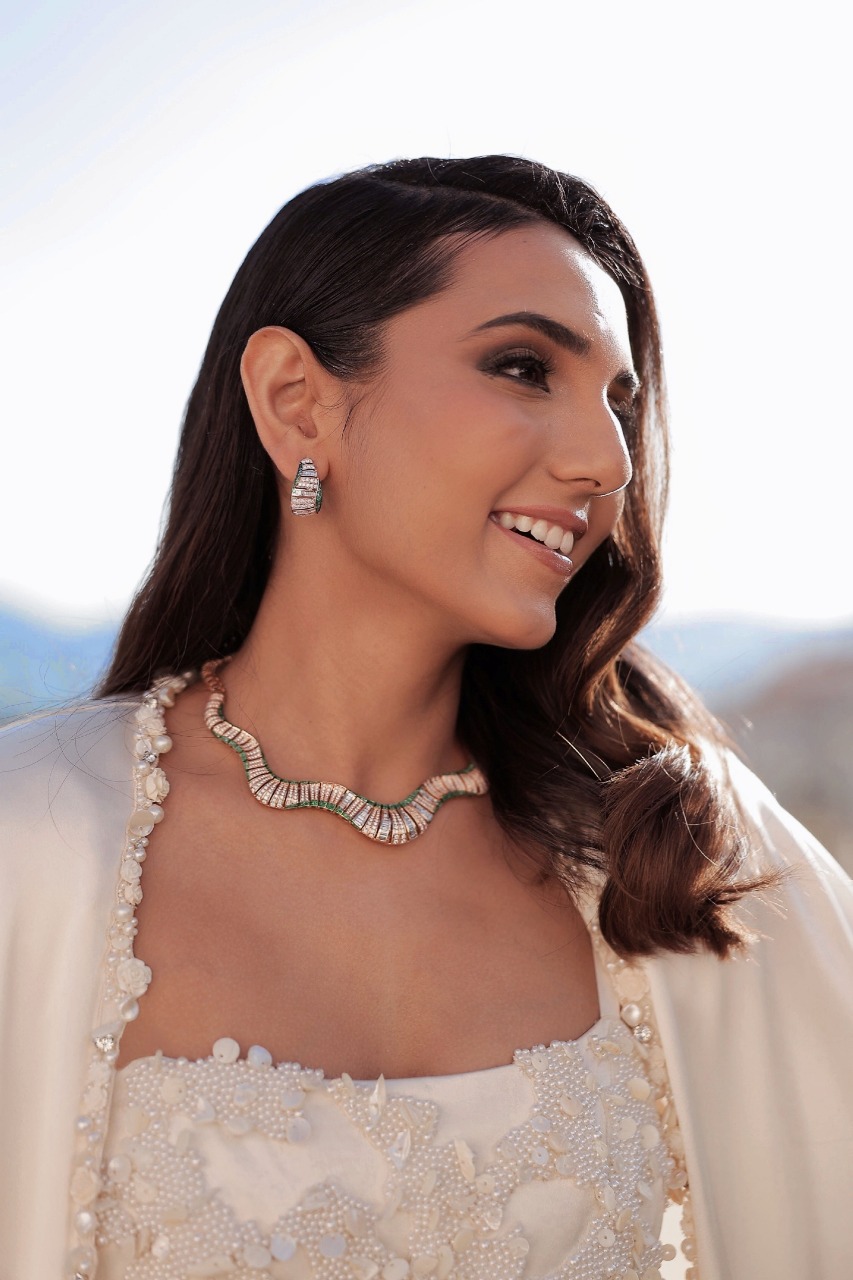 Saudi entrepreneur and style icon Lama Alakeel made a statement in the bold and poetic Peacock collection by Sartoro Genève. Inspired by the hypnotic beauty of the peacock feather, the intricate diamond arrangement mimicked the fluidity of nature while celebrating empowered femininity.