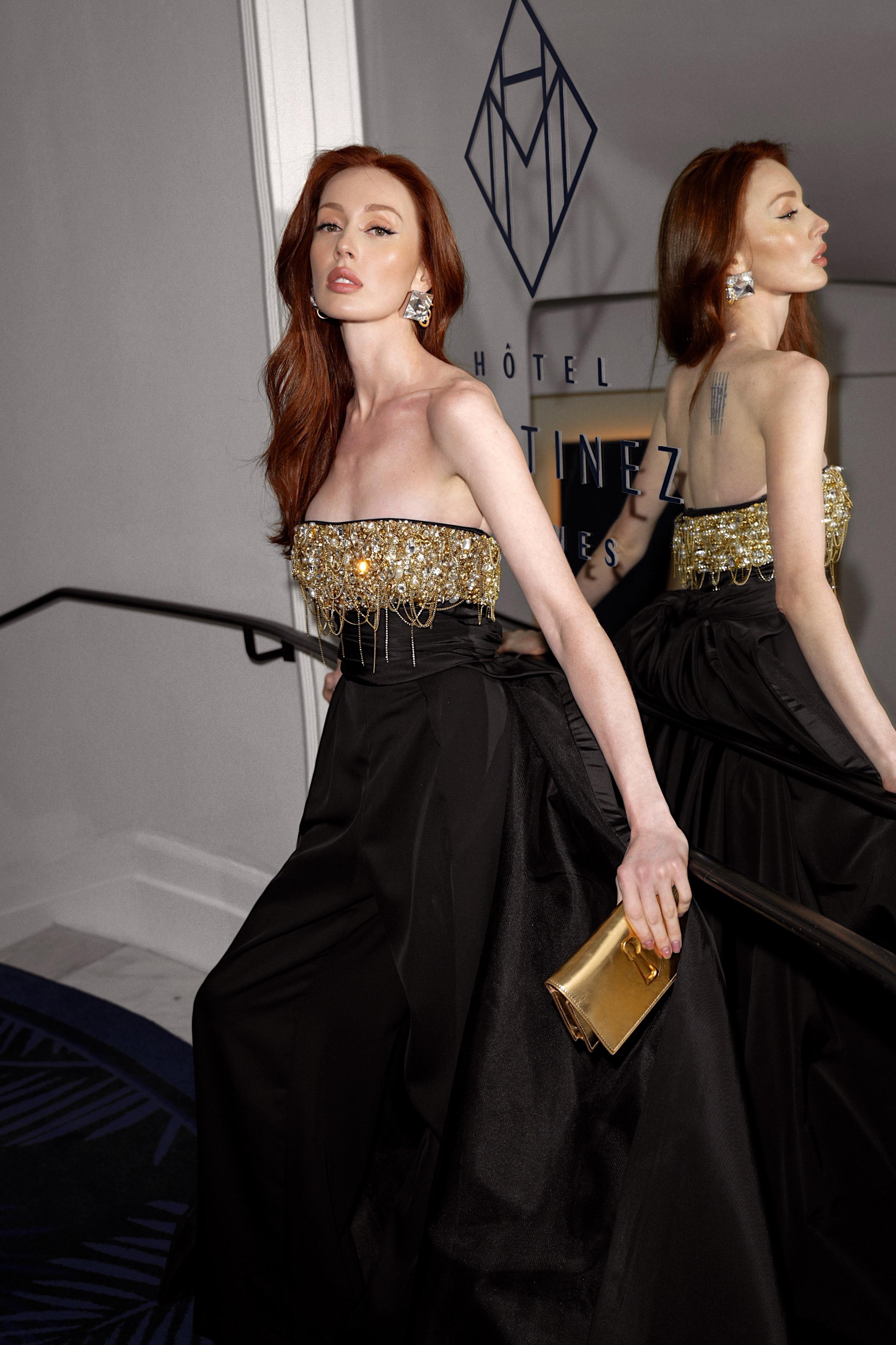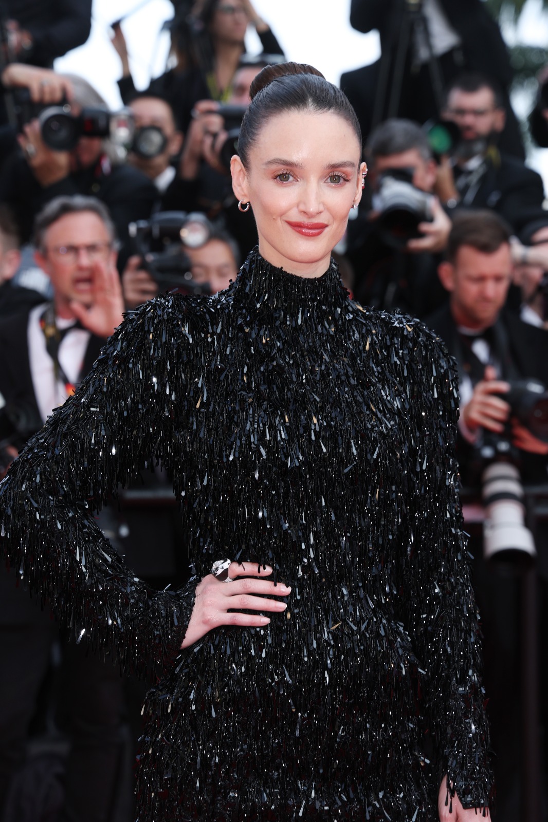 Liubov Seredkina stunned in a black Schiaparelli gown adorned with integrated gold and crystal embellishments that doubled as jewelry. The intricate fringe-style beading along the neckline and bodice shimmered like a layered necklace, eliminating the need for additional accessories. Her Cannes jewelry choices, ranging from classic pearl studs to statement detailing, struck a perfect balance: elegant, intentional, and true to her signature style.