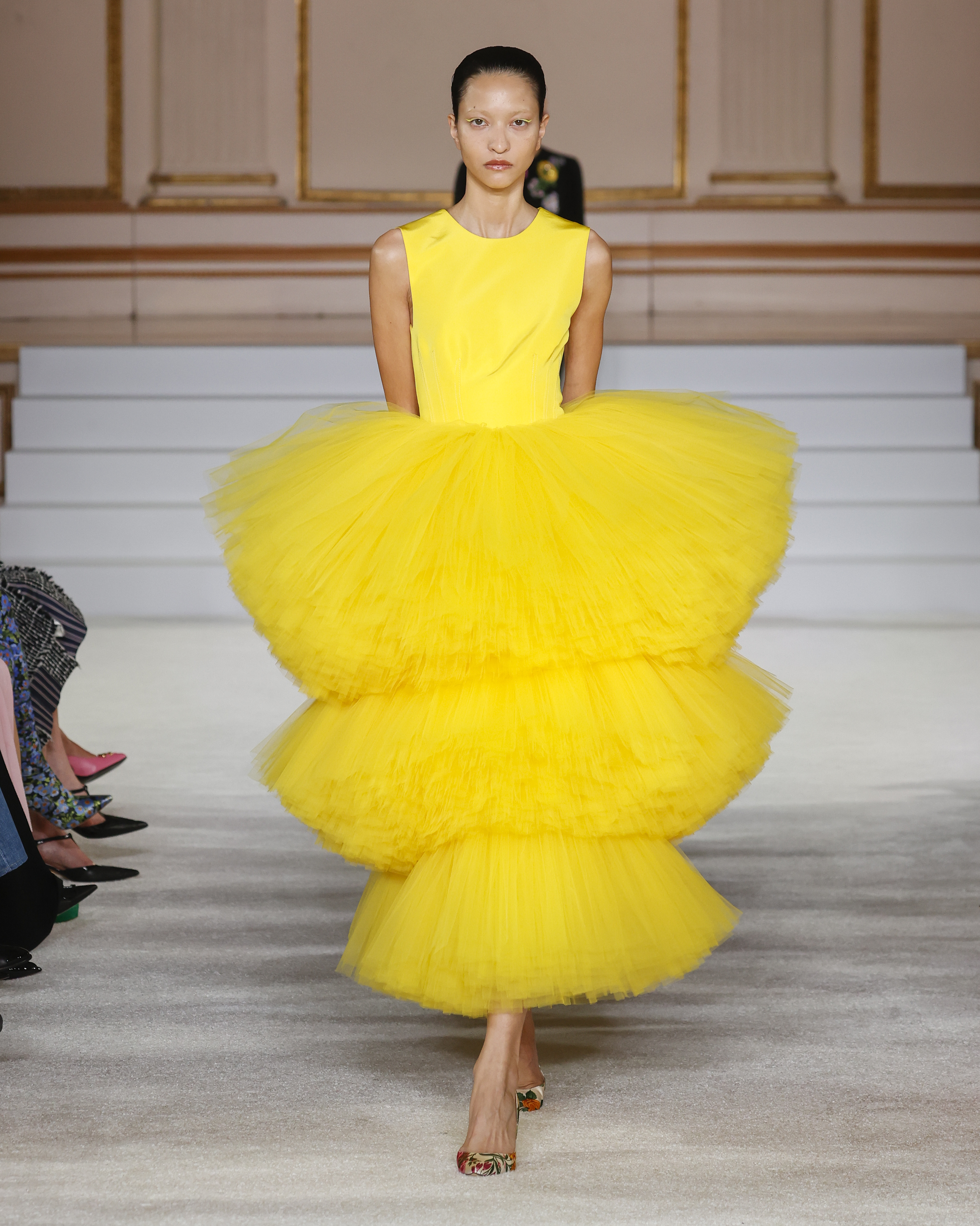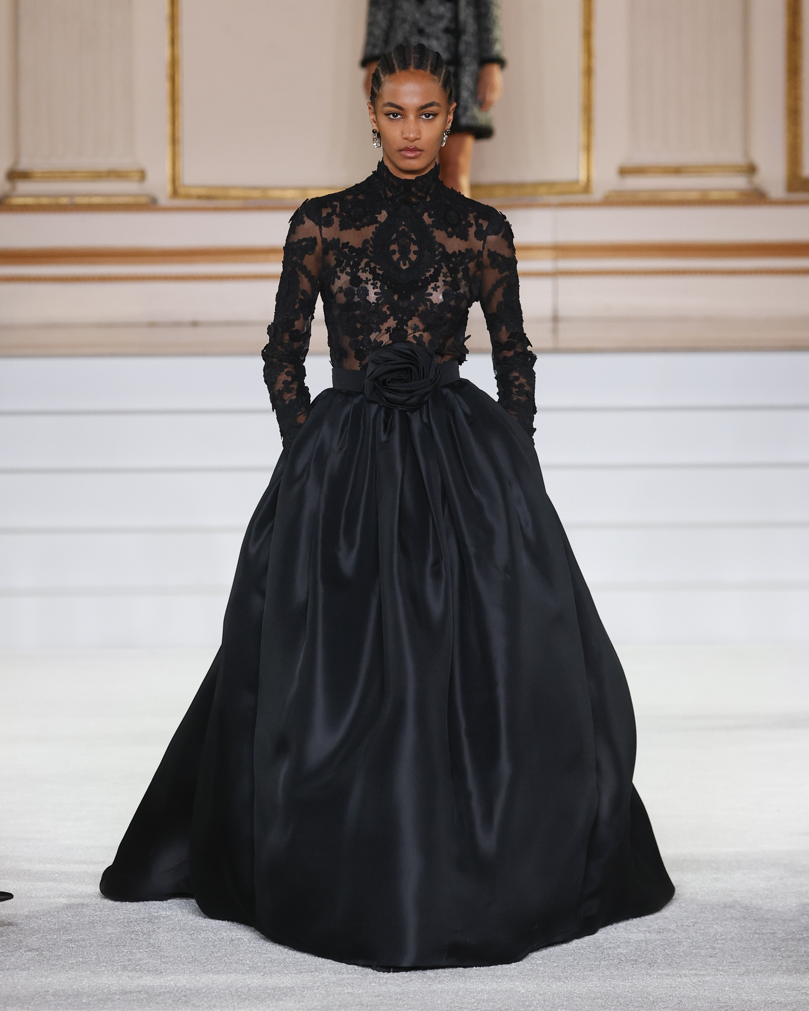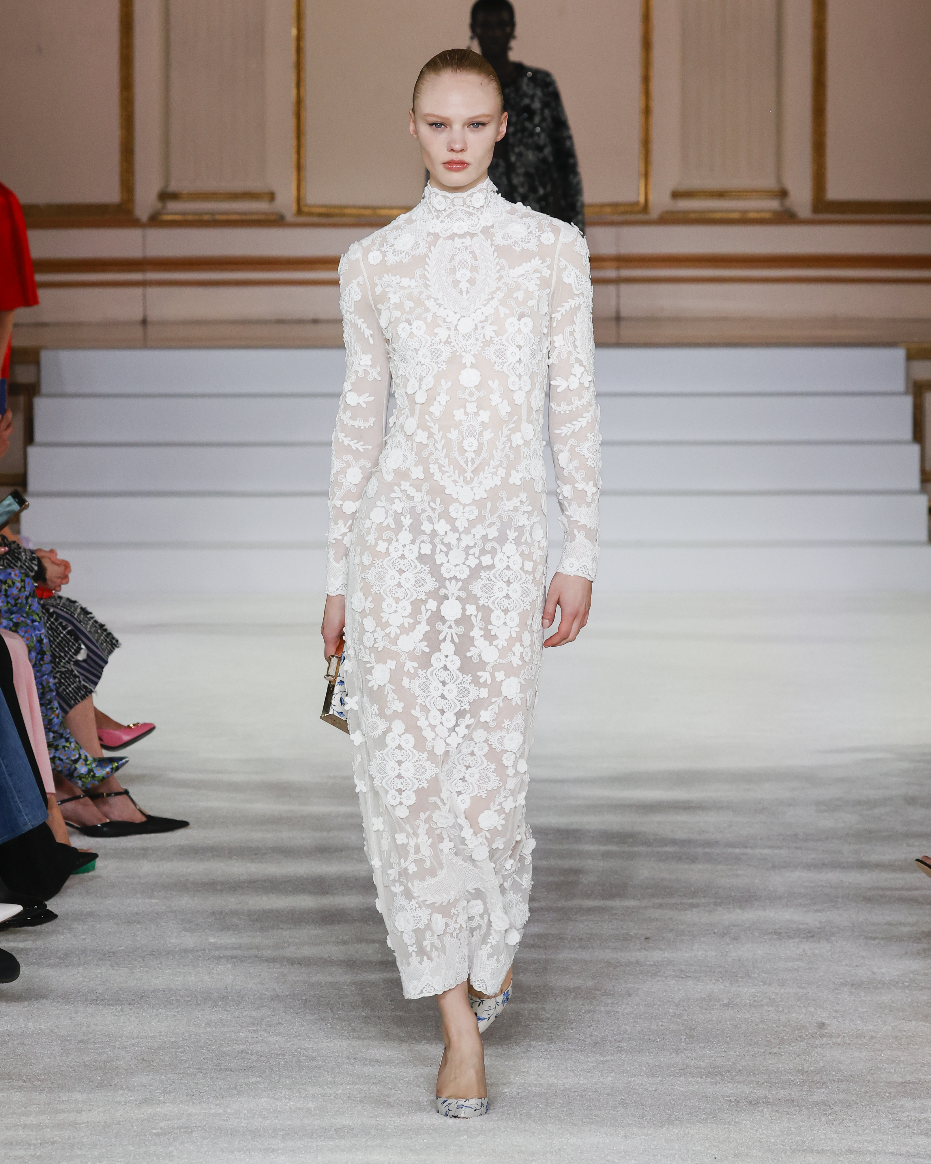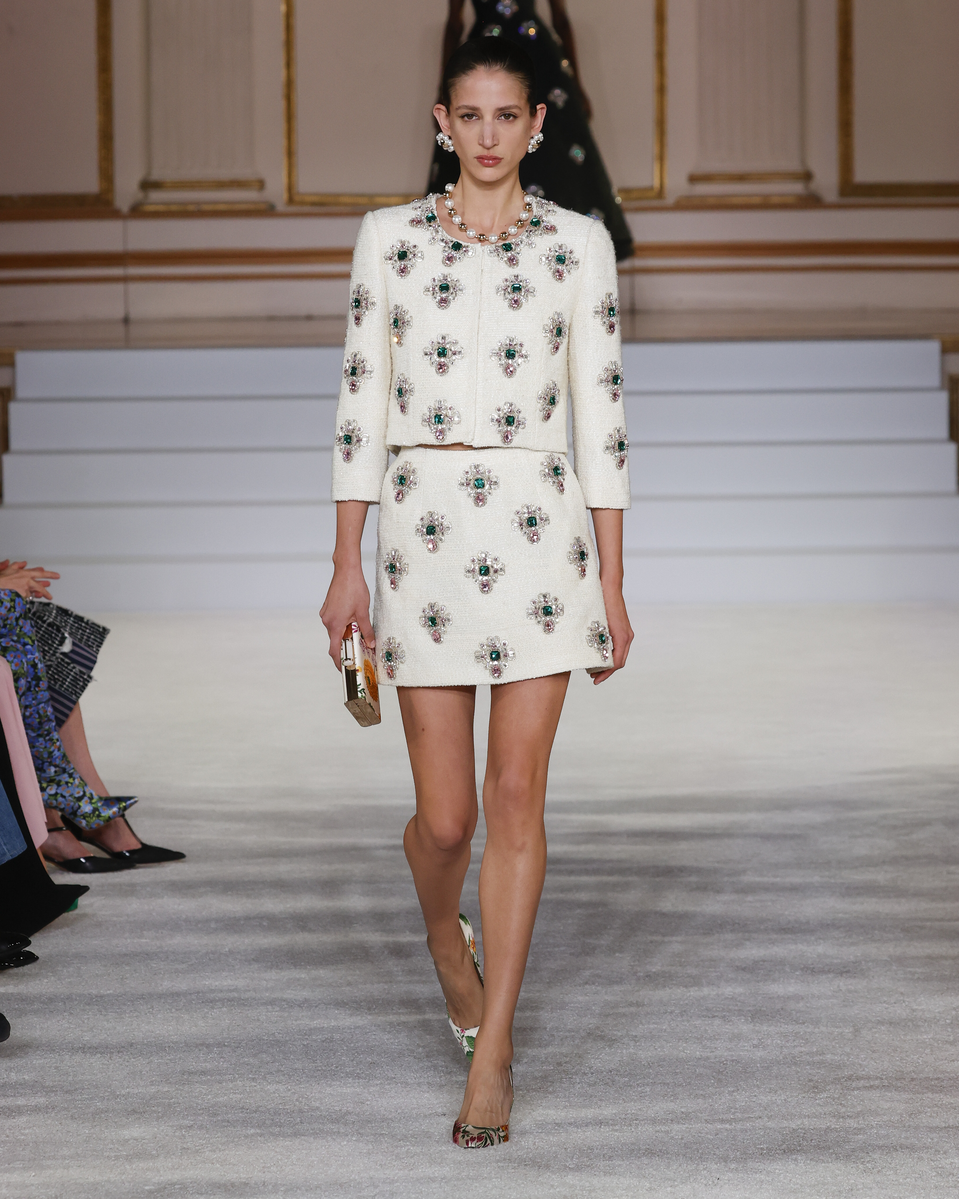 The concept of extreme opulence and what it means today is explored, and not just in its visual manifestation. There is opulence in time and consideration spent on the creation of a piece, opulence in zero compromise for the very best of construction and craftsmanship by the Carolina Herrera atelier. Opulence in how a woman feels when putting on her dress, the voluminous shape of her skirt held up by layers of feather-light tulle beneath, or a sharply tailored suit precisely cut to the millimeter.