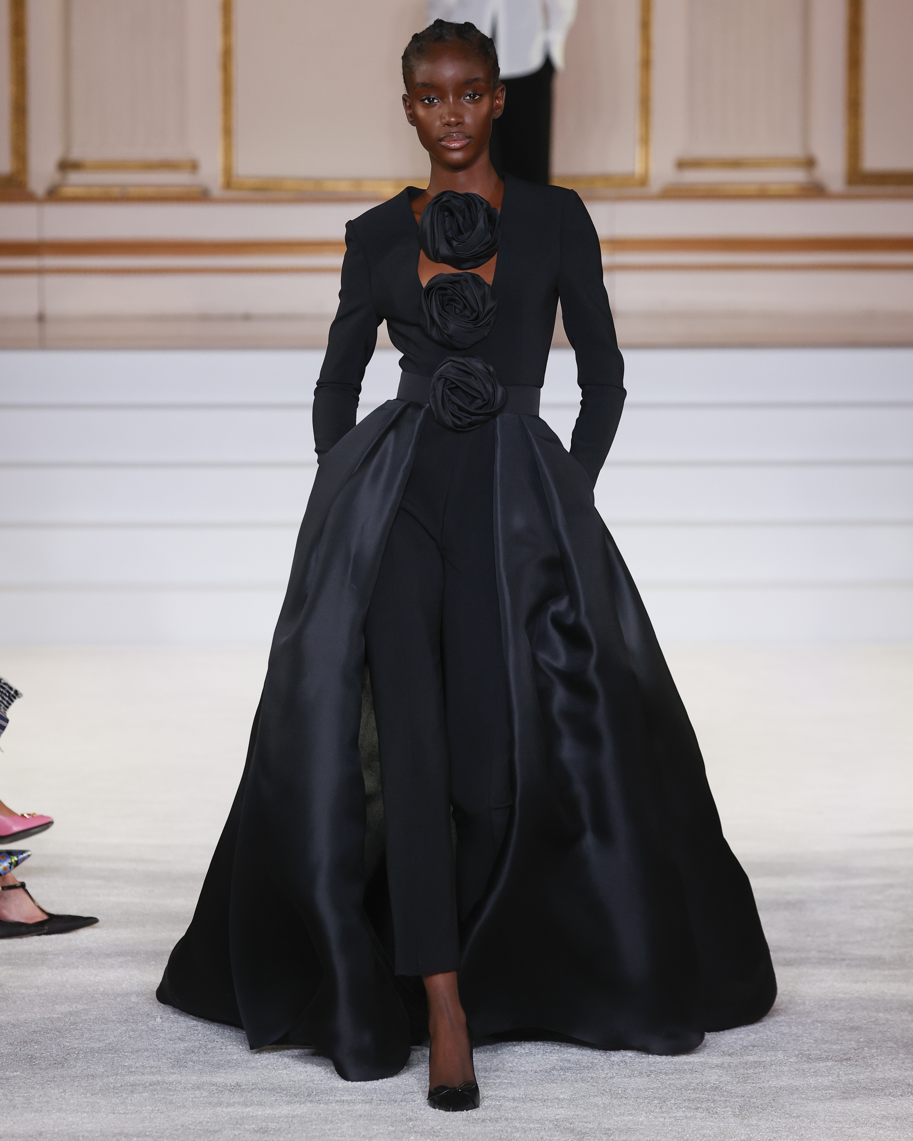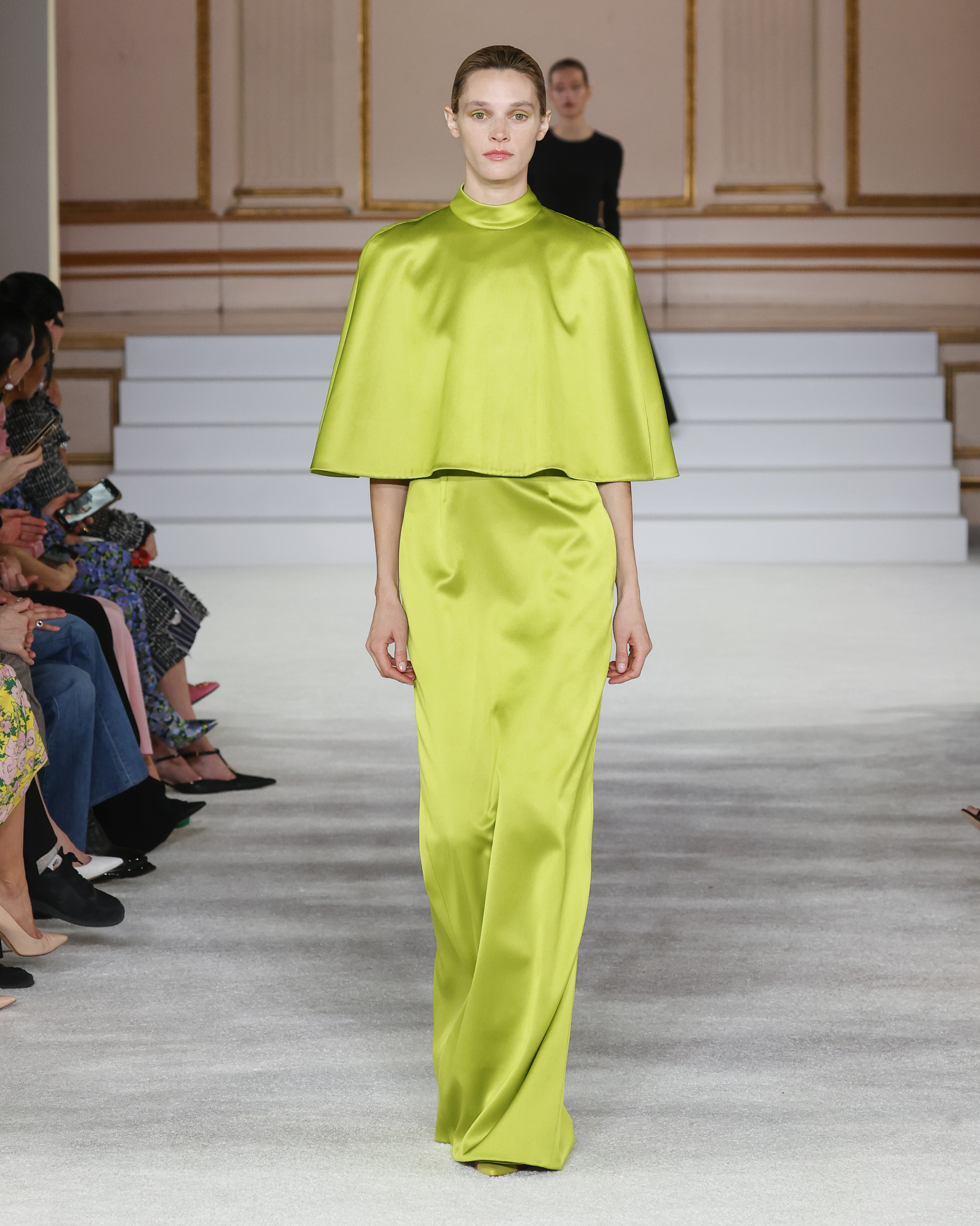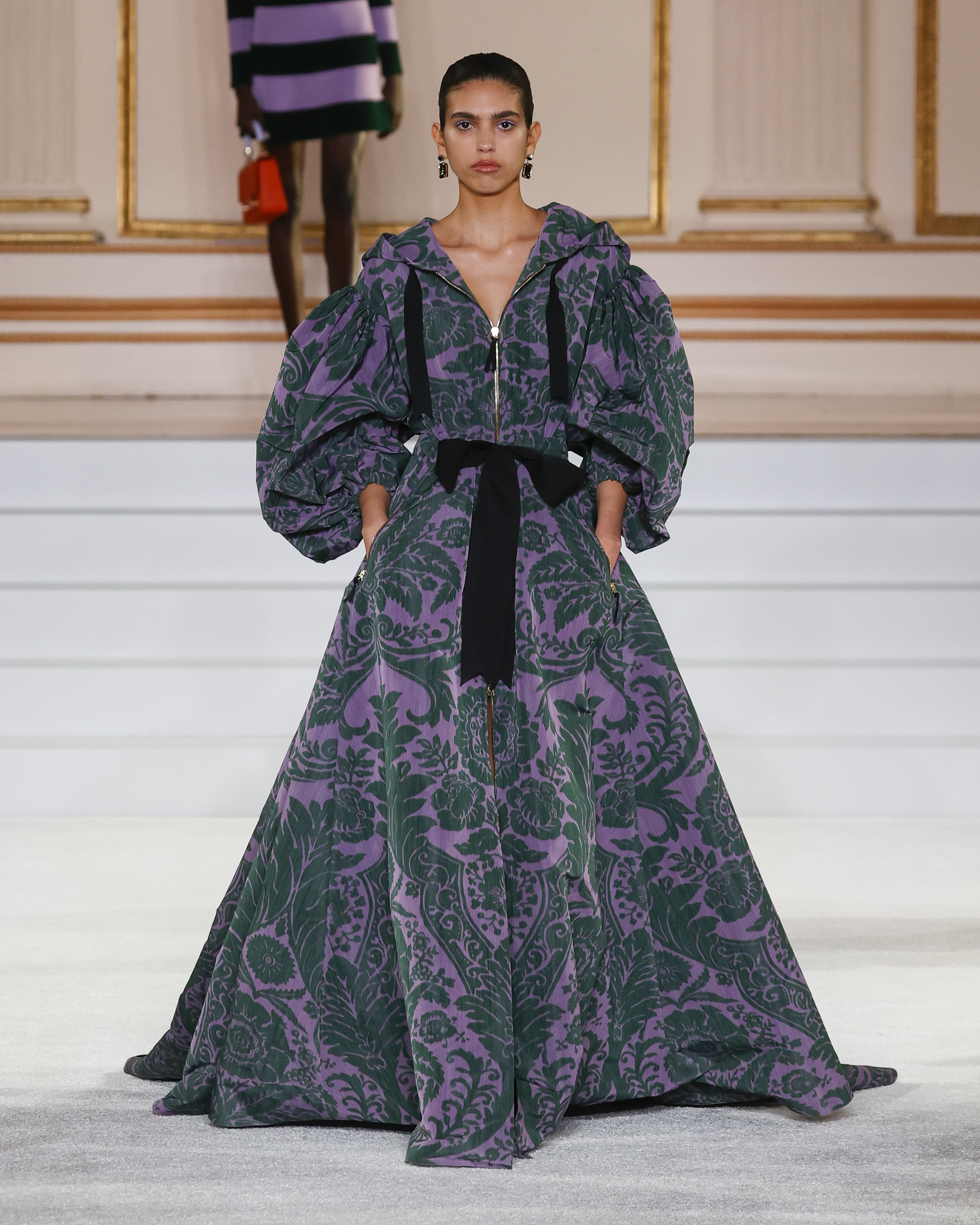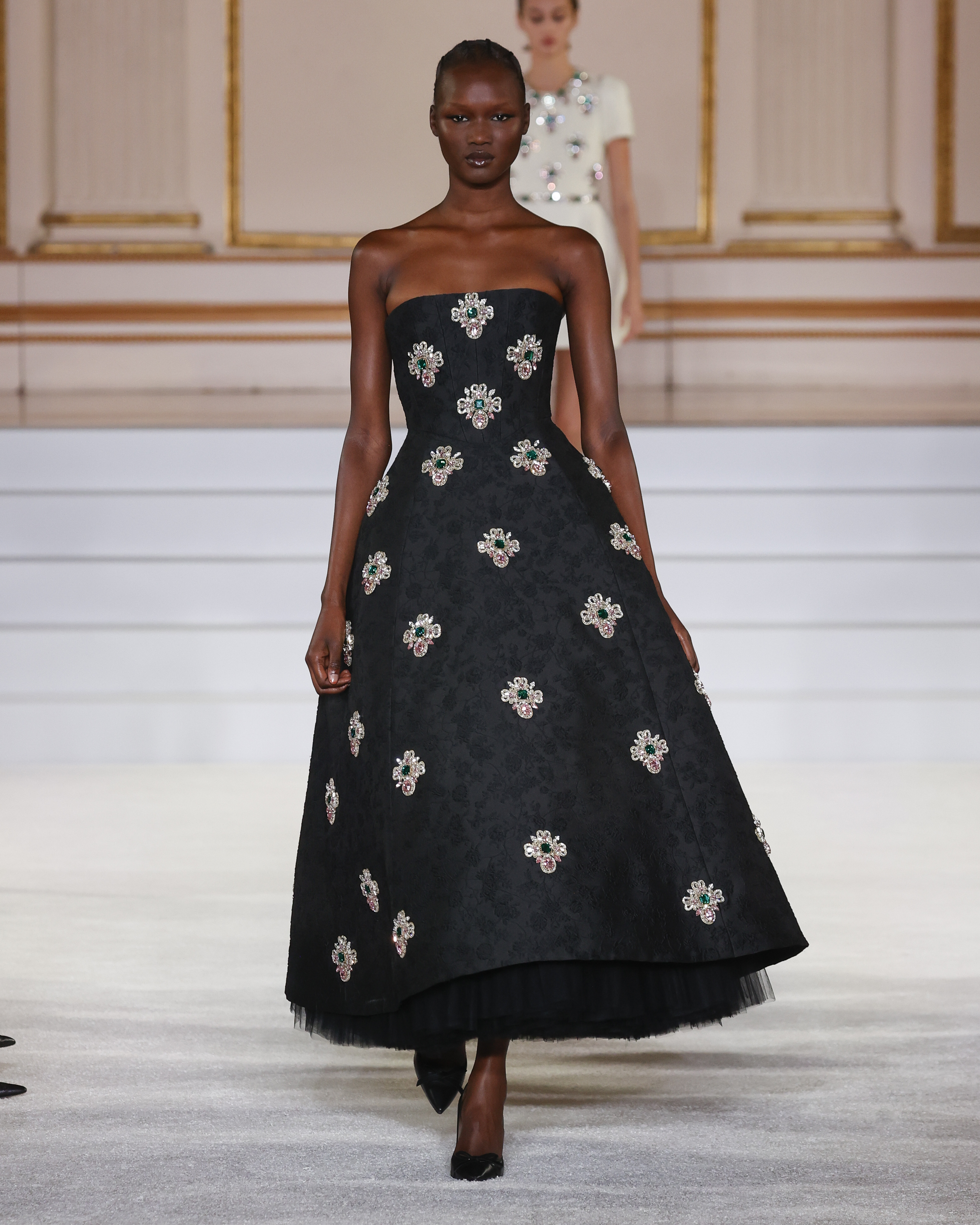 The concept of extreme opulence and what it means today is explored, and not just in its visual manifestation. There is opulence in time and consideration spent on the creation of a piece, opulence in zero compromise for the very best of construction and craftsmanship by the Carolina Herrera atelier. Opulence in how a woman feels when putting on her dress, the voluminous shape of her skirt held up by layers of feather-light tulle beneath, or a sharply tailored suit precisely cut to the millimeter.