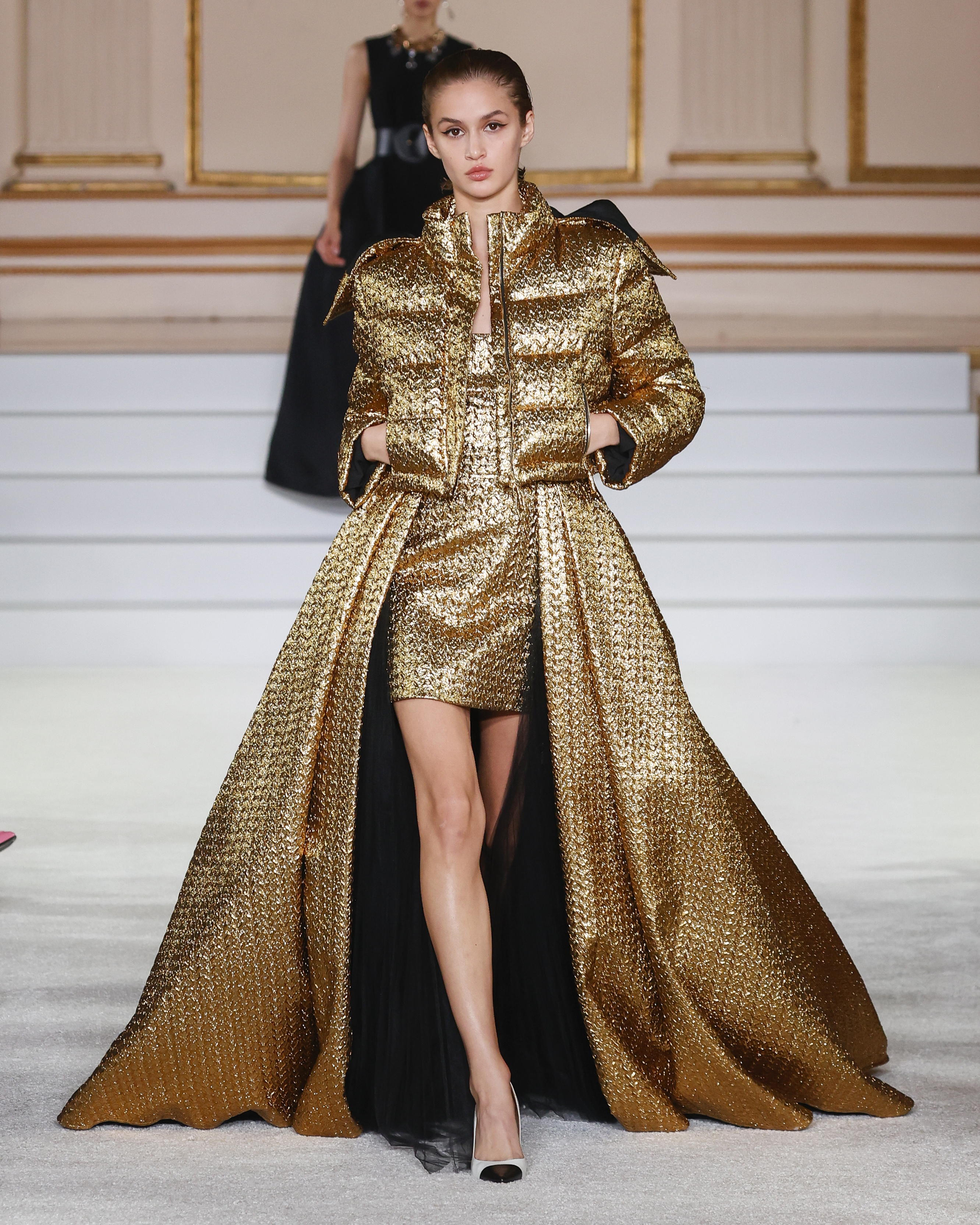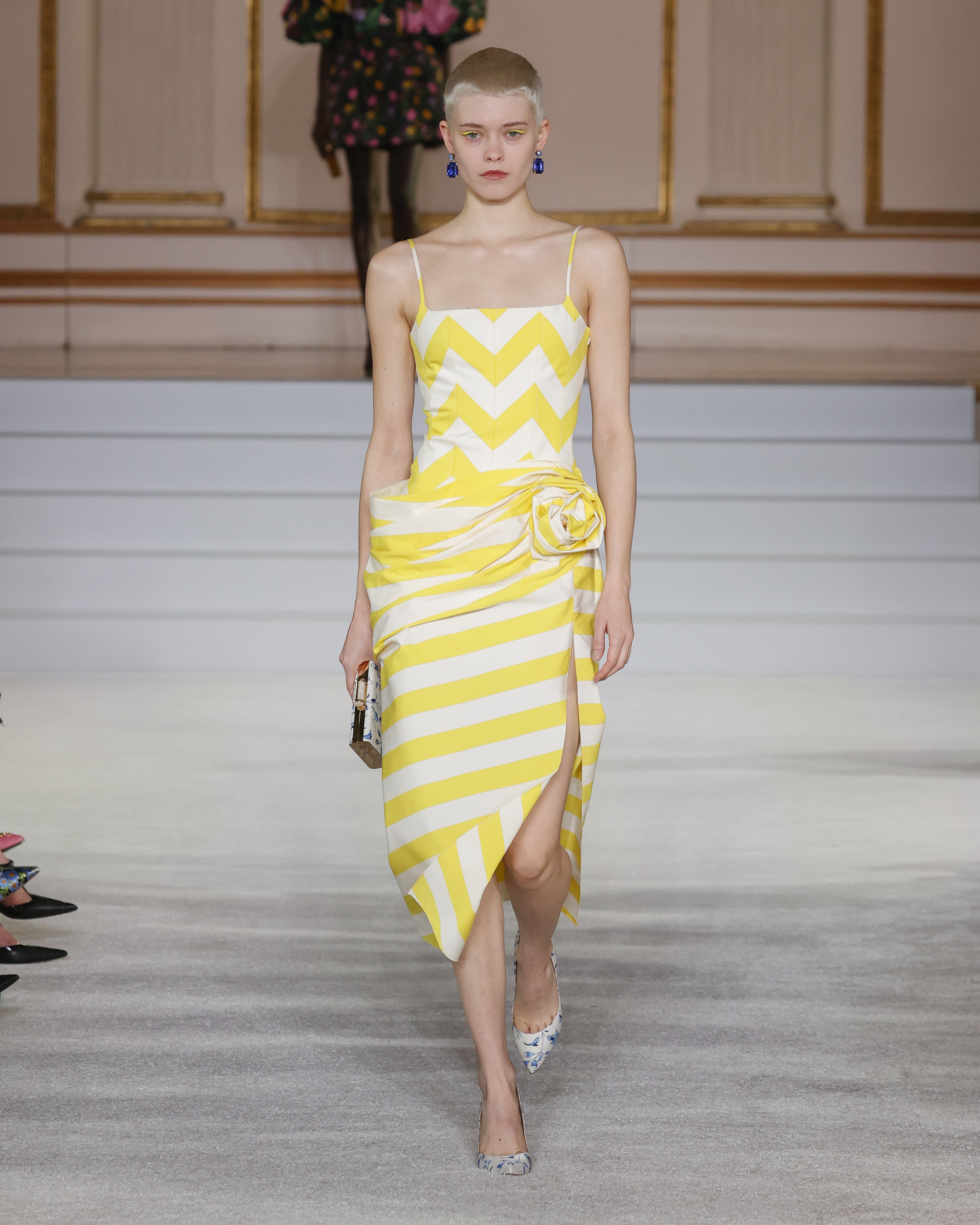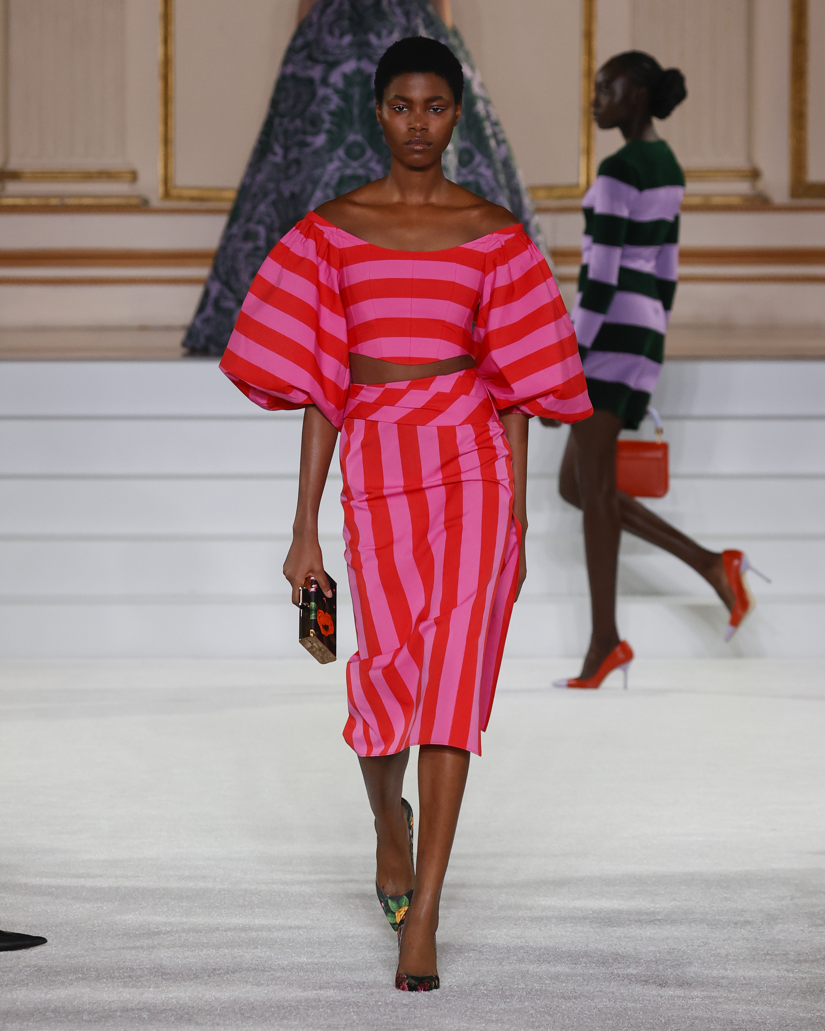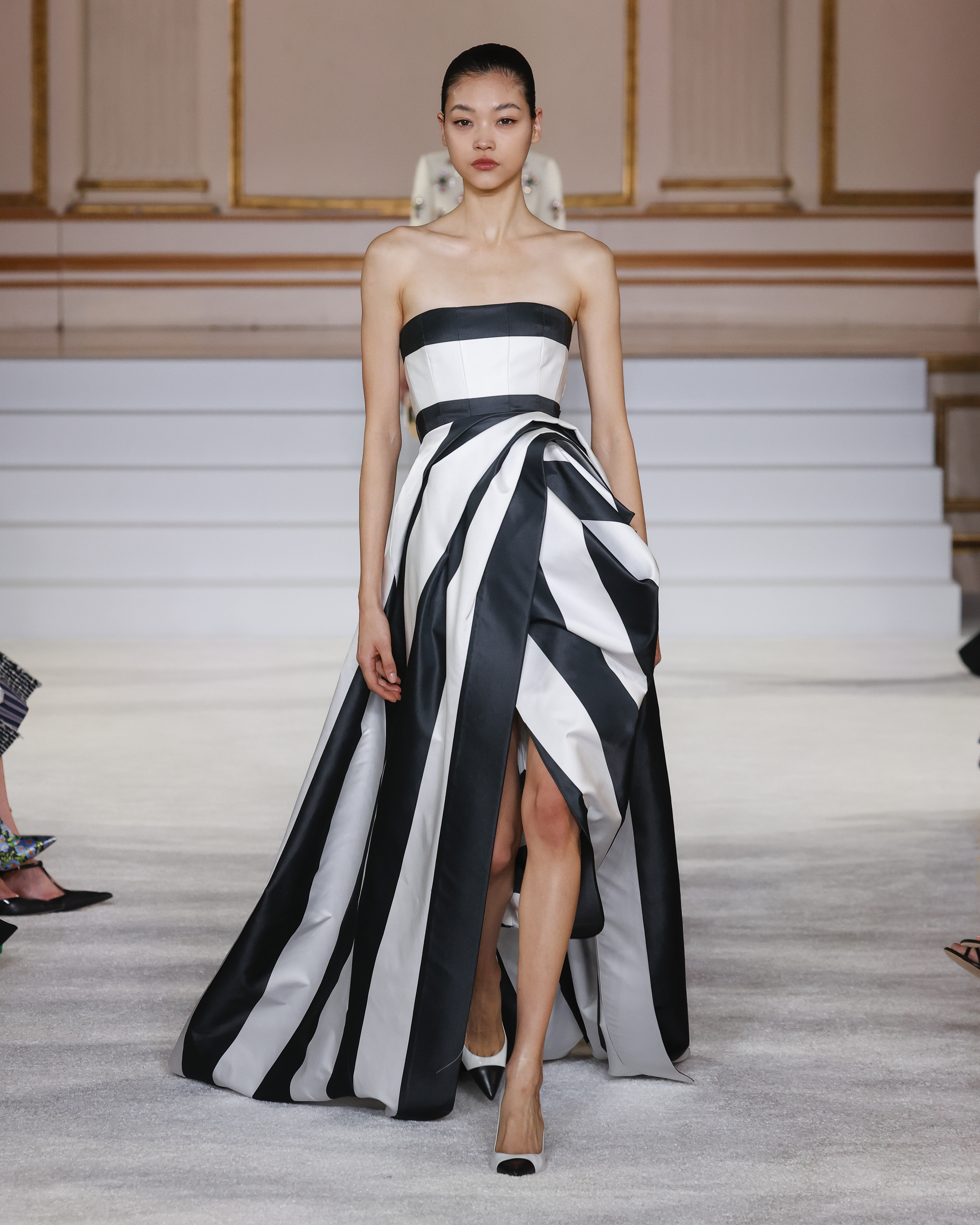 The rigidity of the Habsburg court in contrast with the freedom and romance Sisi strove for informs the sense of discipline mixed with exuberance and grandeur throughout the collection. Dresses with portrait necklines and romantic spiral folds put the Carolina Herrera woman in the spotlight, holding court. The vivid jewel-tone color palette is grounded in sumptuous textures of velvet and taffeta in black, gilded in gold embroidery. Geometric stripes take center stage in a myriad of meticulous constructions, knit separates and drapes. Daywear pieces, such as the signature Carolina Herrera white cotton shirt or little white sequin-tweed dress, empower the woman with an undeniable strength of presence.