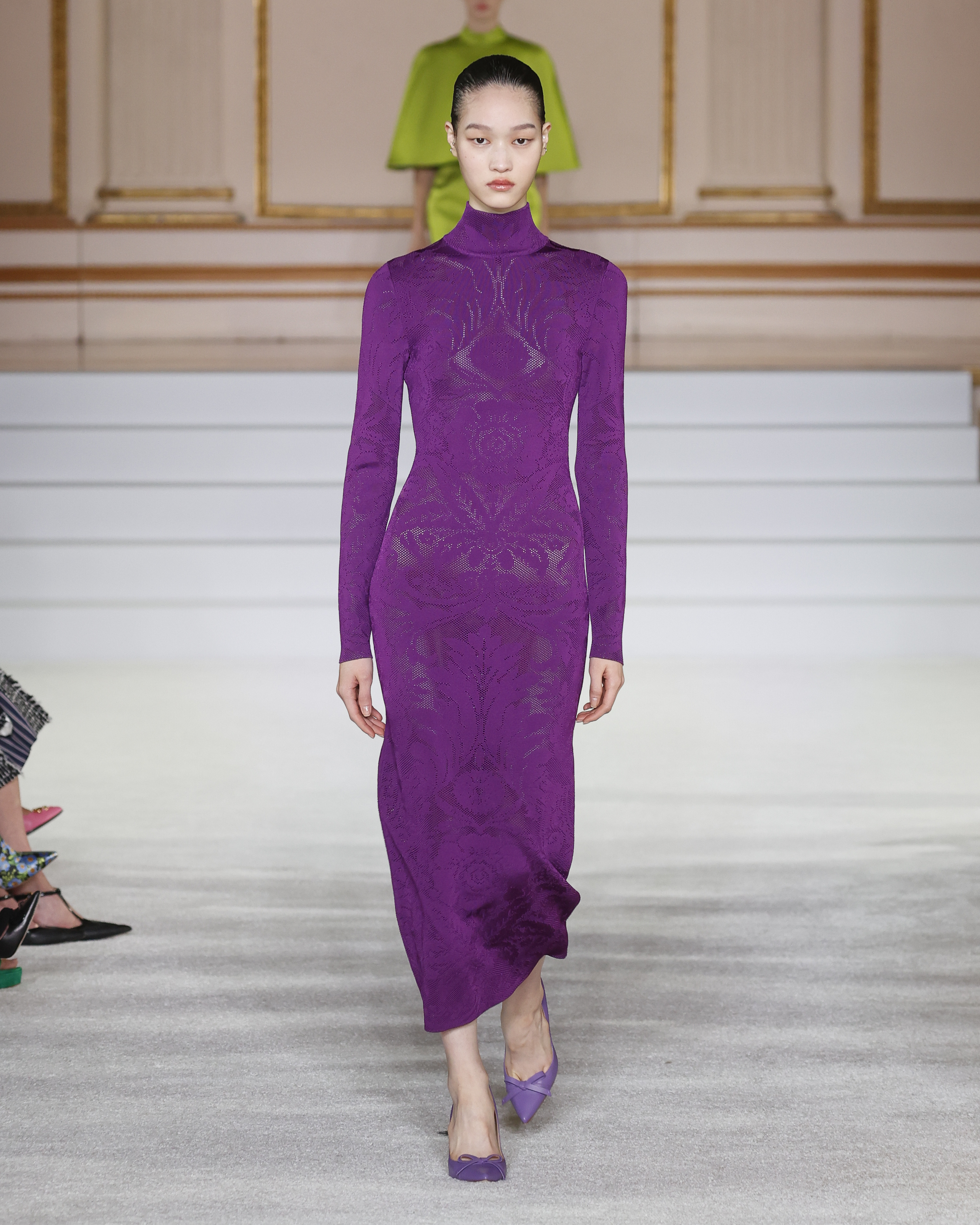 Opulence does not have to come at the expense of ease and modernity. An effortless floor-length knit dress is adorned in tonal Swarovski crystals that glimmer in soft light. A sweeping gown in the shape of a dramatic hooded anorak is fashioned in decadent woven chine, made with warp-printed yarns in deep purple and emerald green.