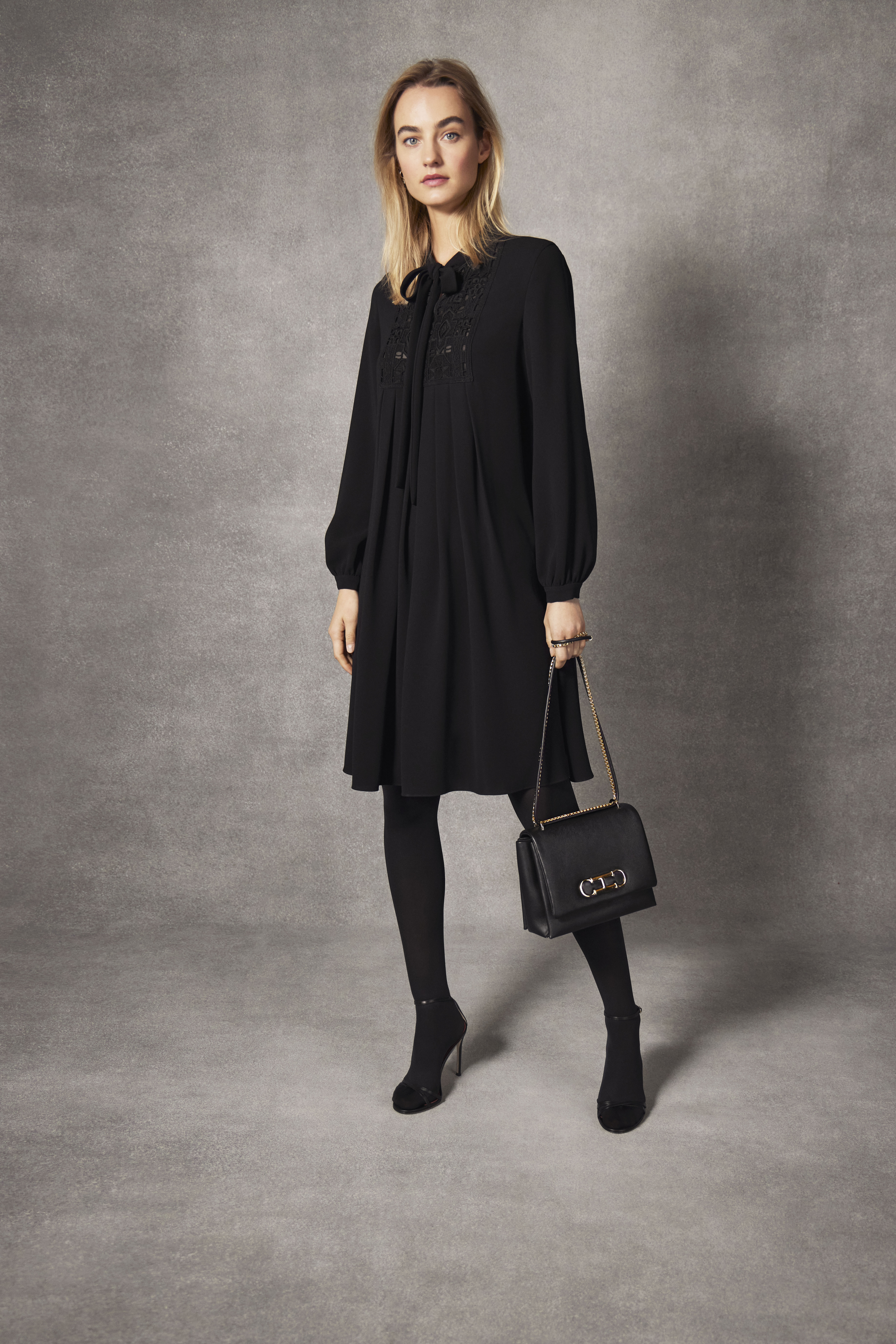 Fit and flare business wear styles with refined looks in monochrome white and black. An oversized black cape with a striking white Insignia motif bannered across.