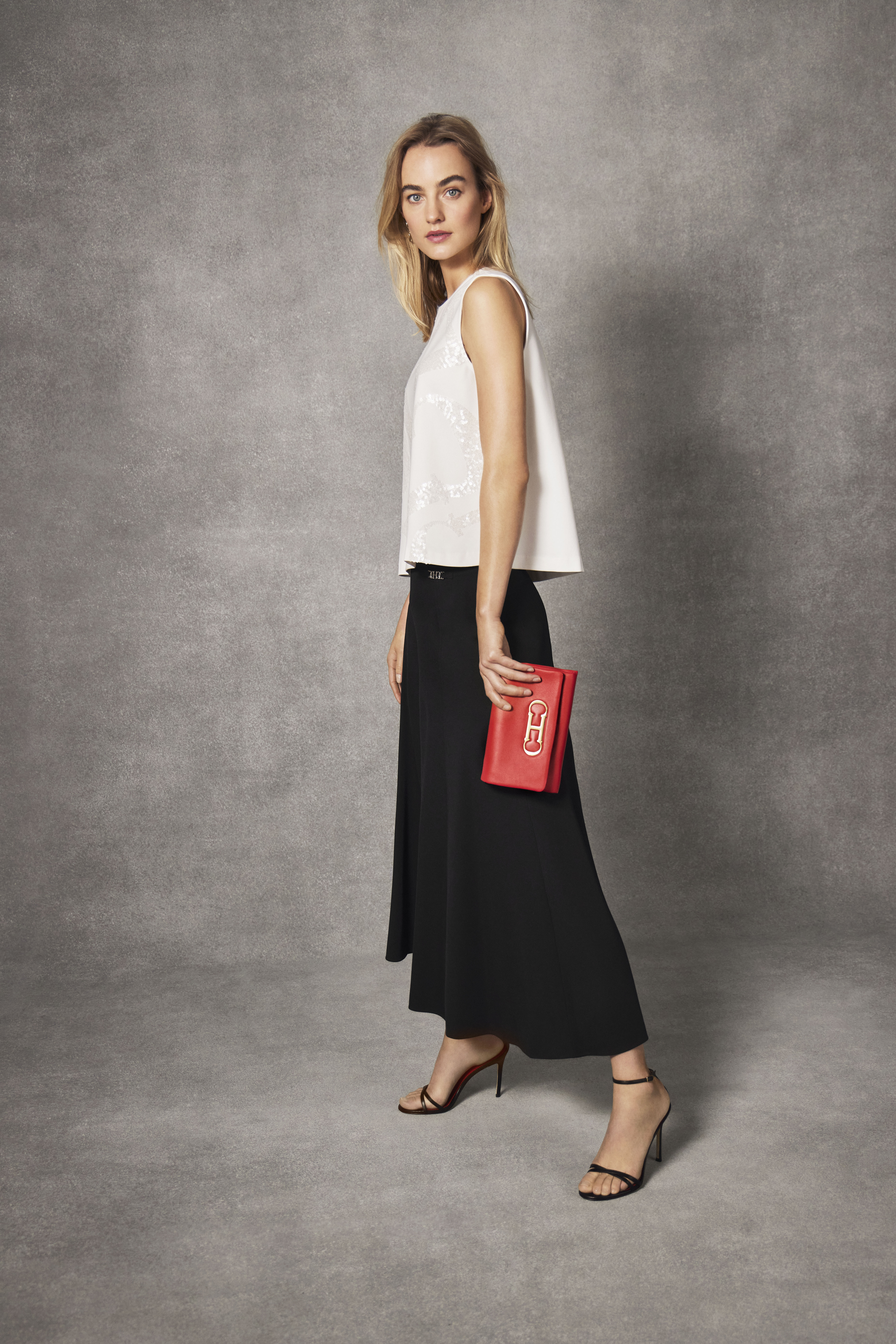 The Blasón bag, handcrafted in Mocán leather, is also featured in the collection. This iconic bag can be worn over the shoulder or carried by hand and will elevate any look. A versatile Ficus suede Poncho bag with Carolina’s initials and miniature Doma Insignia bags in pops of color to accessorize a look from day to night.