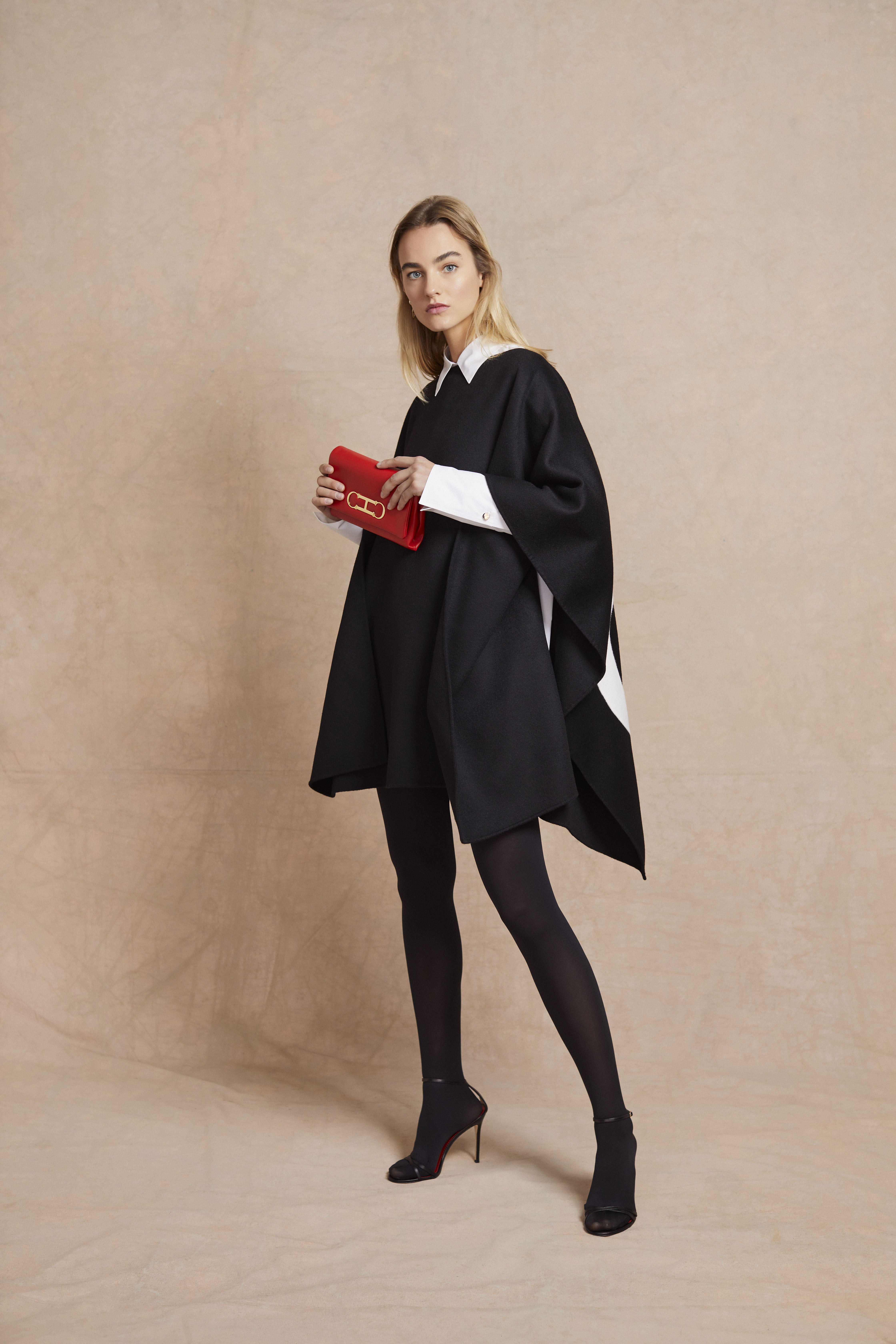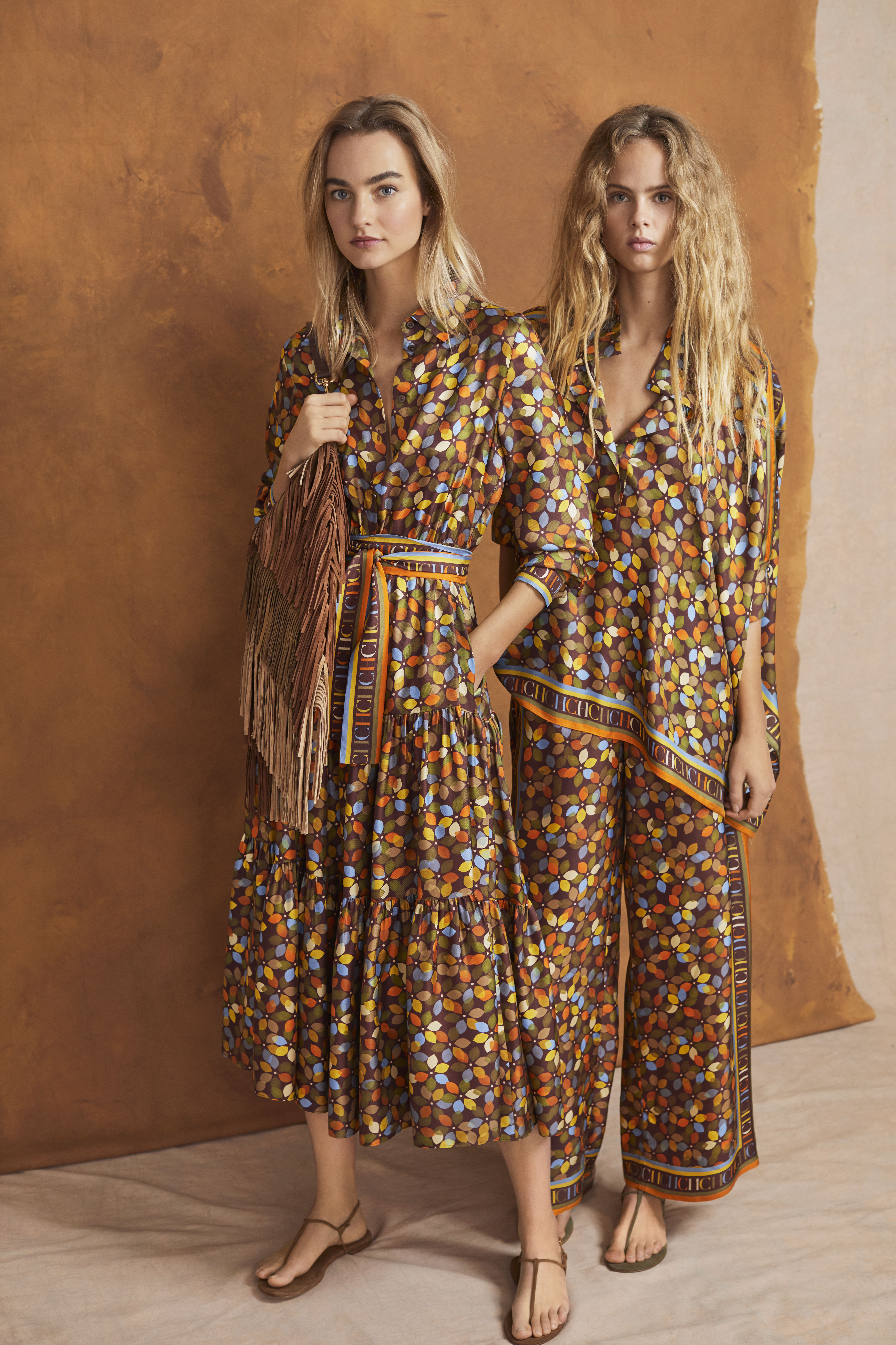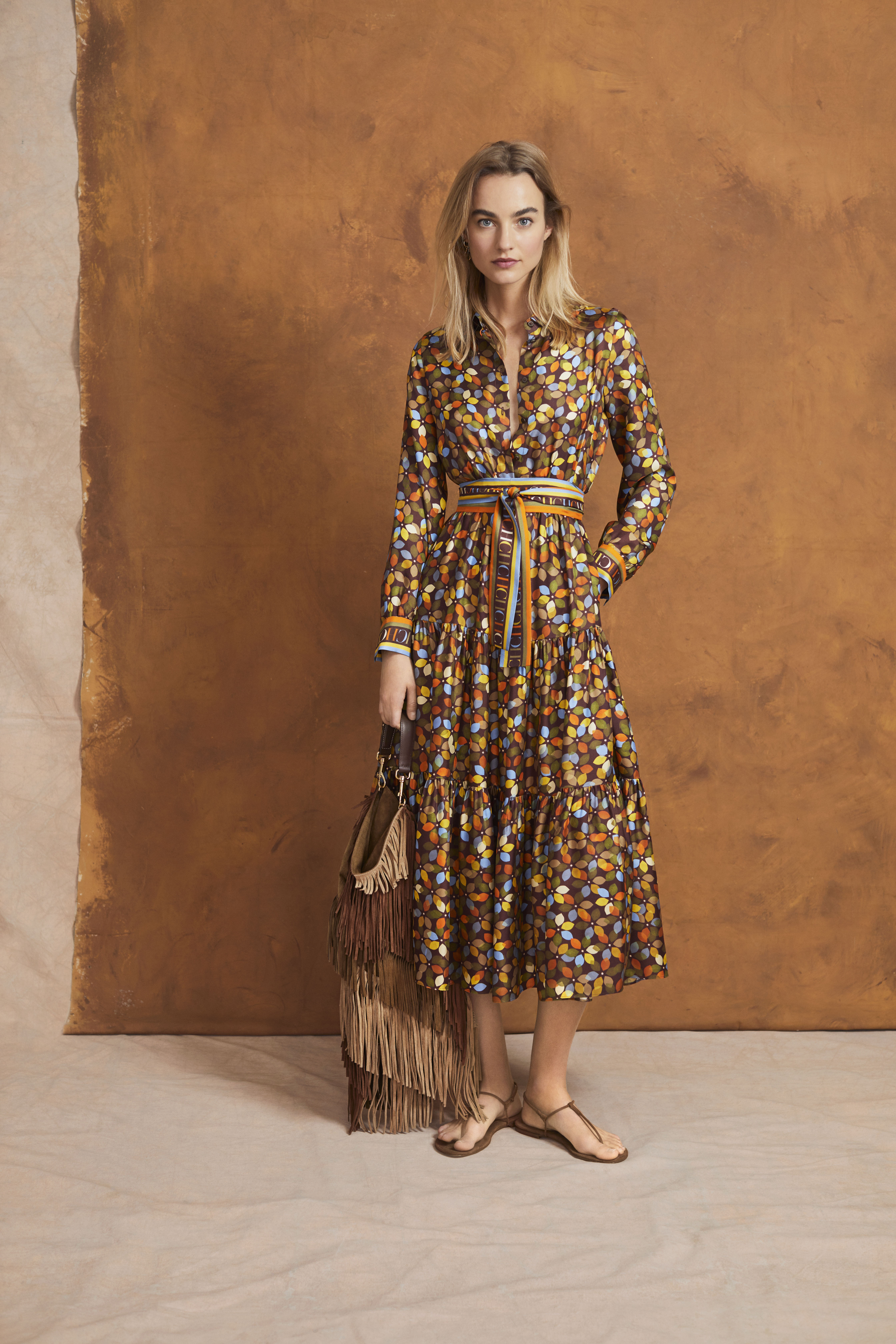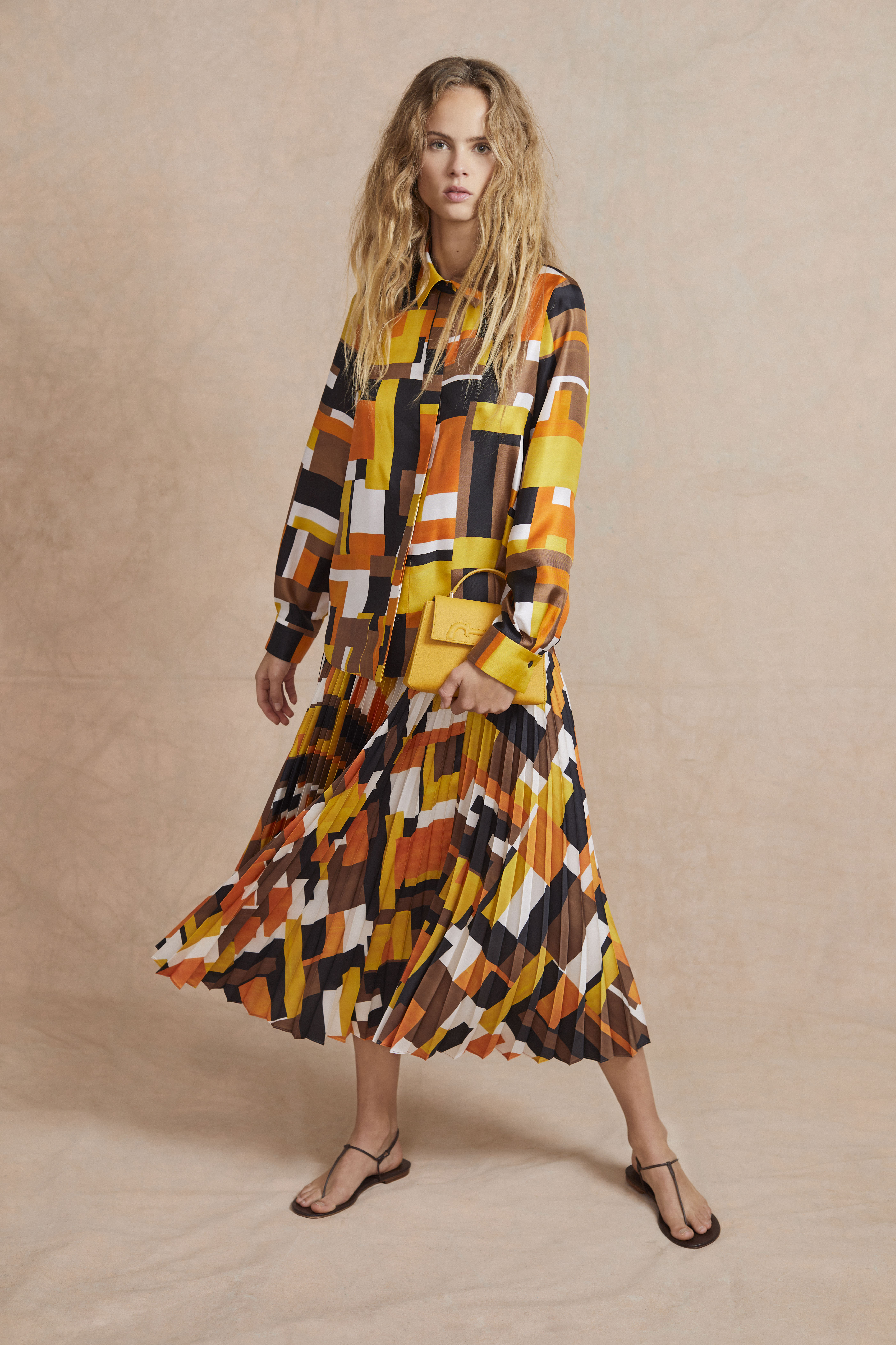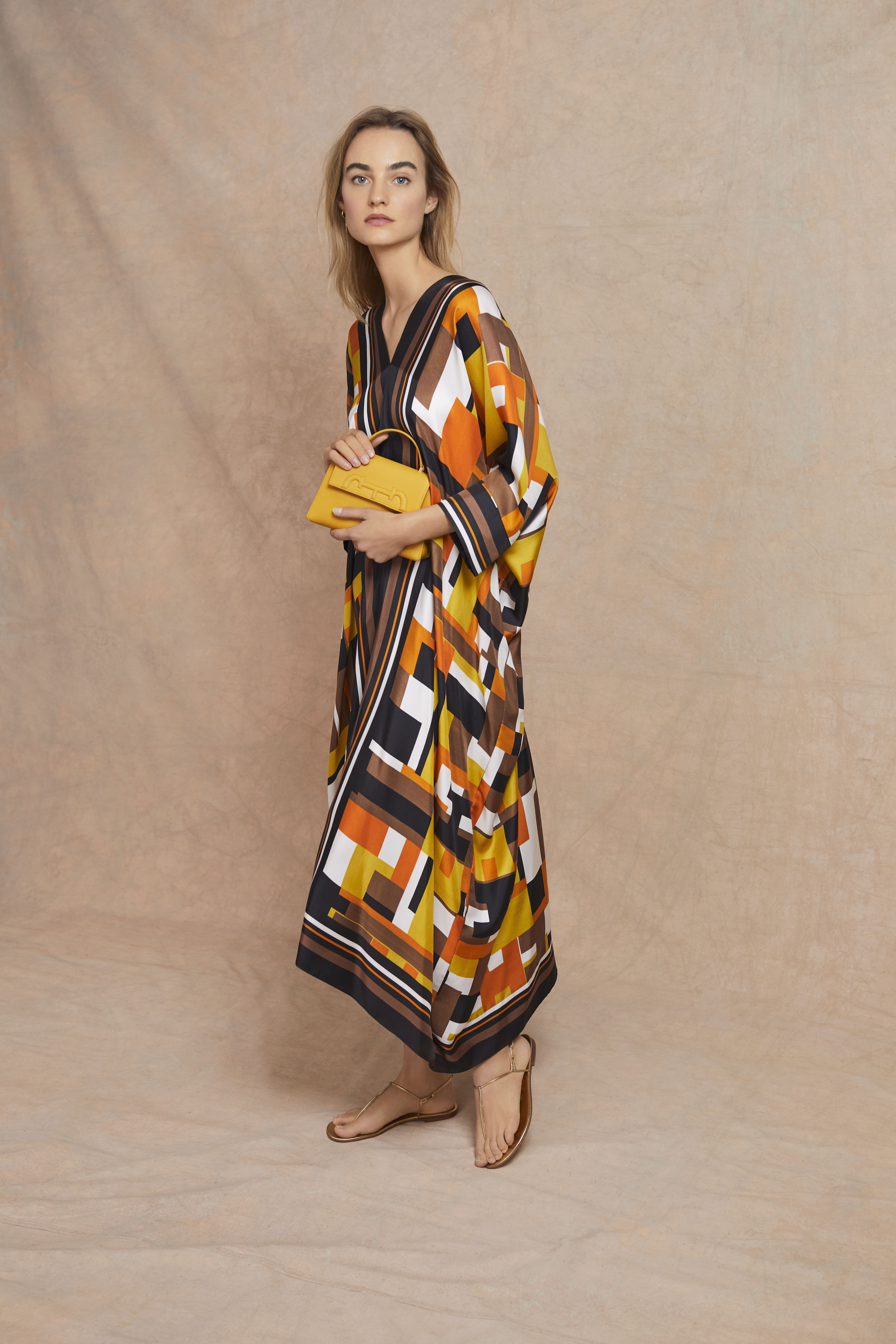 Bold printed looks including the essential shirtdress, an oversized kaftan-style dress in silk twill with a geometric print featuring Carolina's 2020 initials and contrasting striped trims, perfect for the sunset hour. A-lined short jackets in a wool and linen-blend twill and a merino wool oversized sweater to pair with a midi skirt for a woman on-the-go.