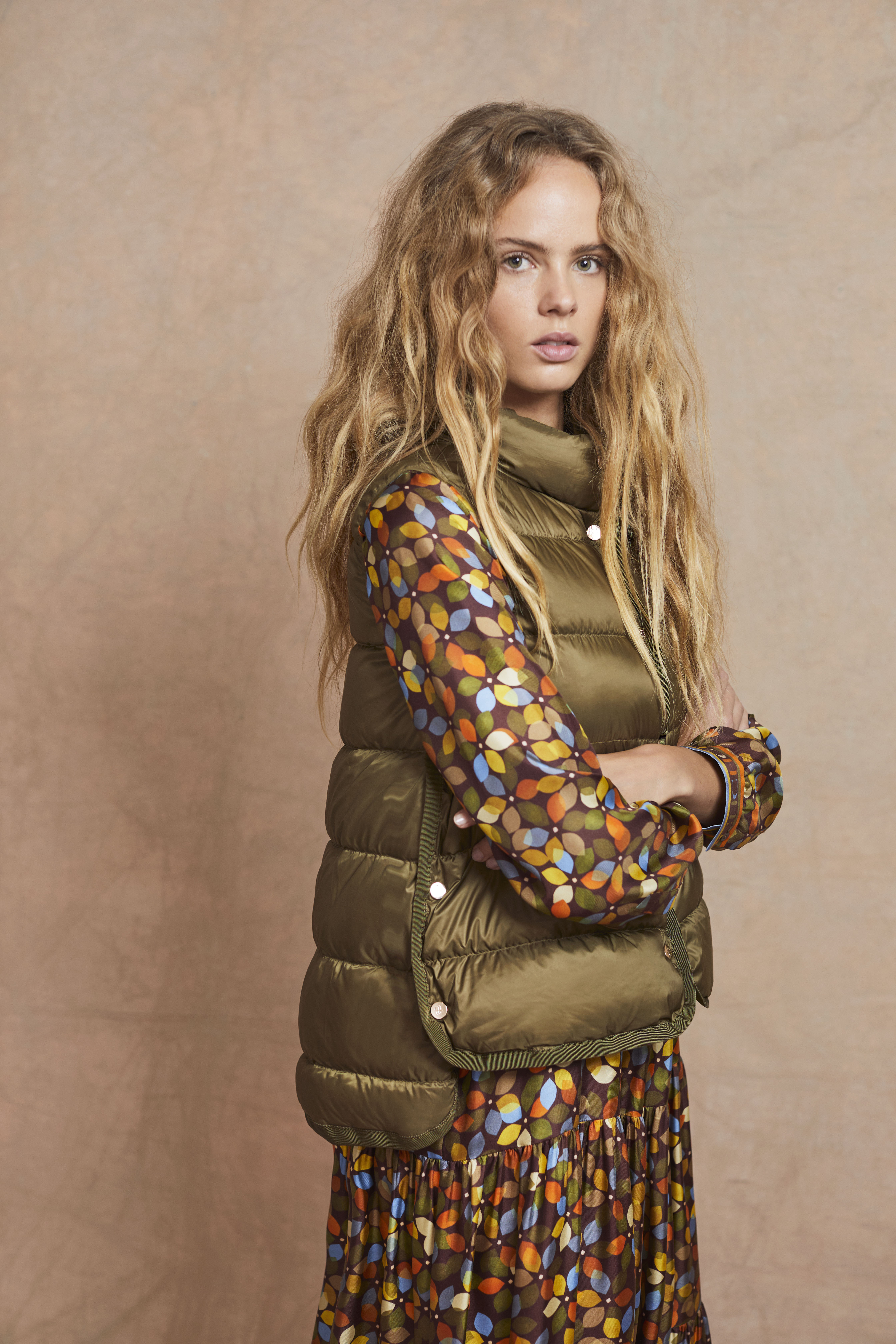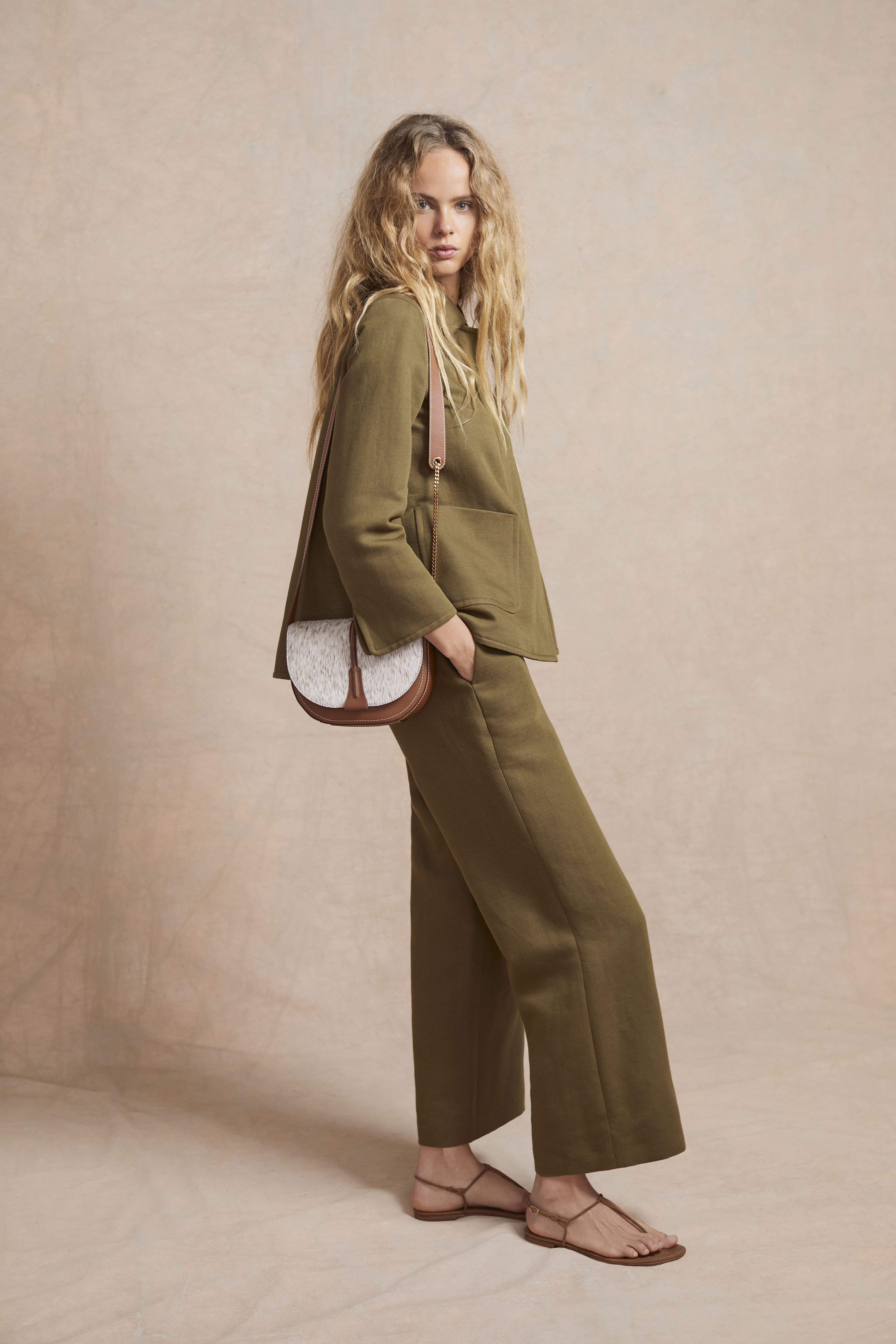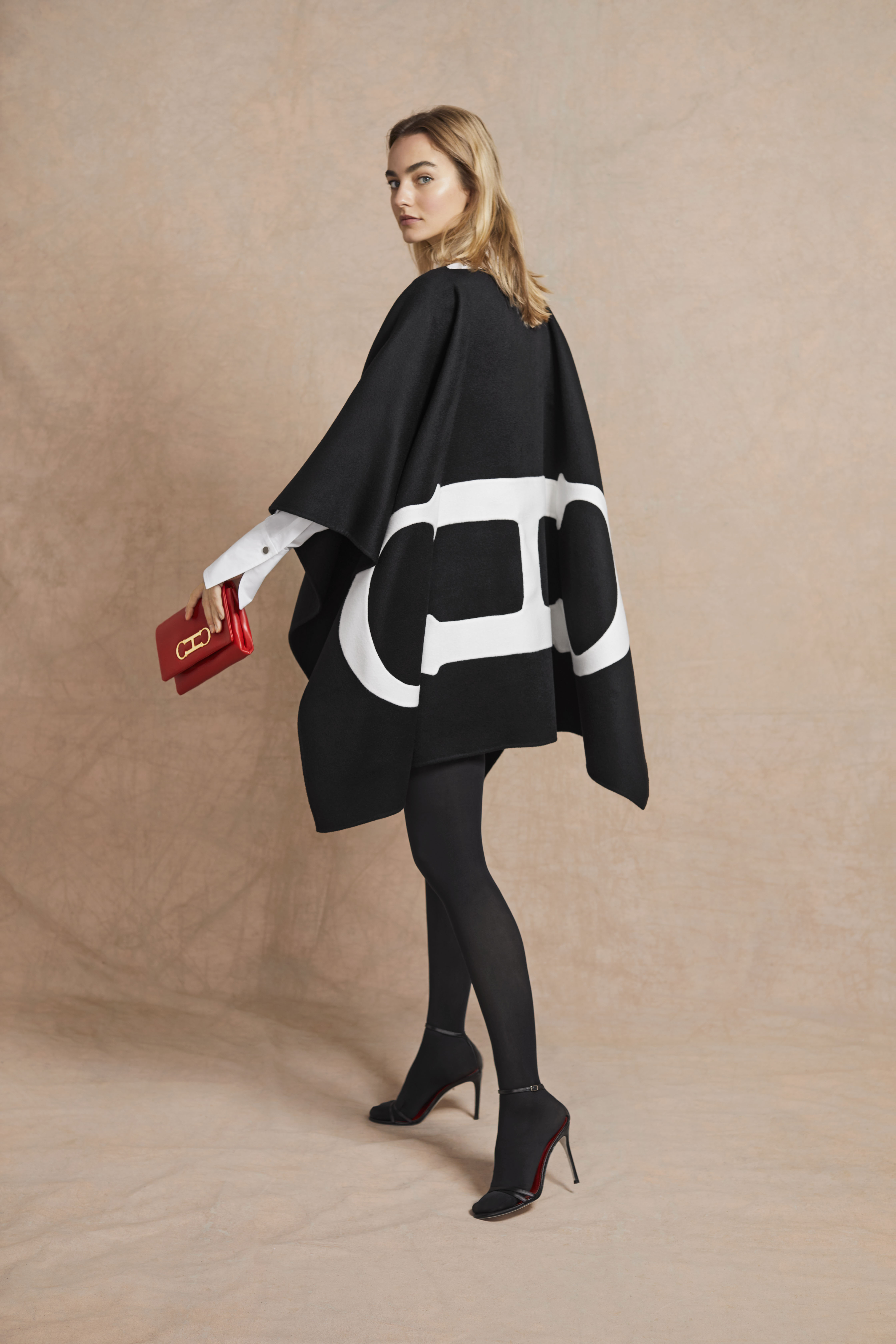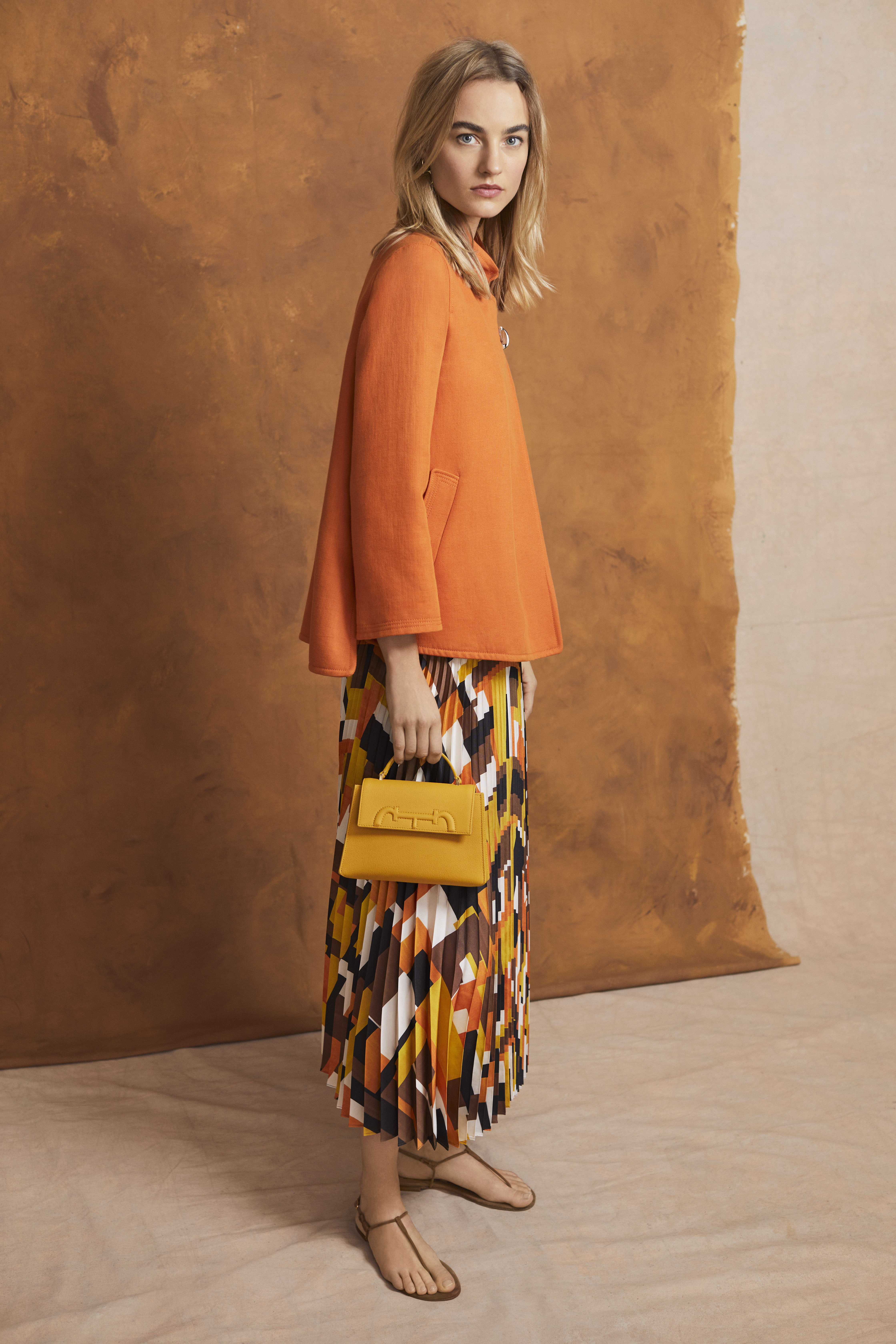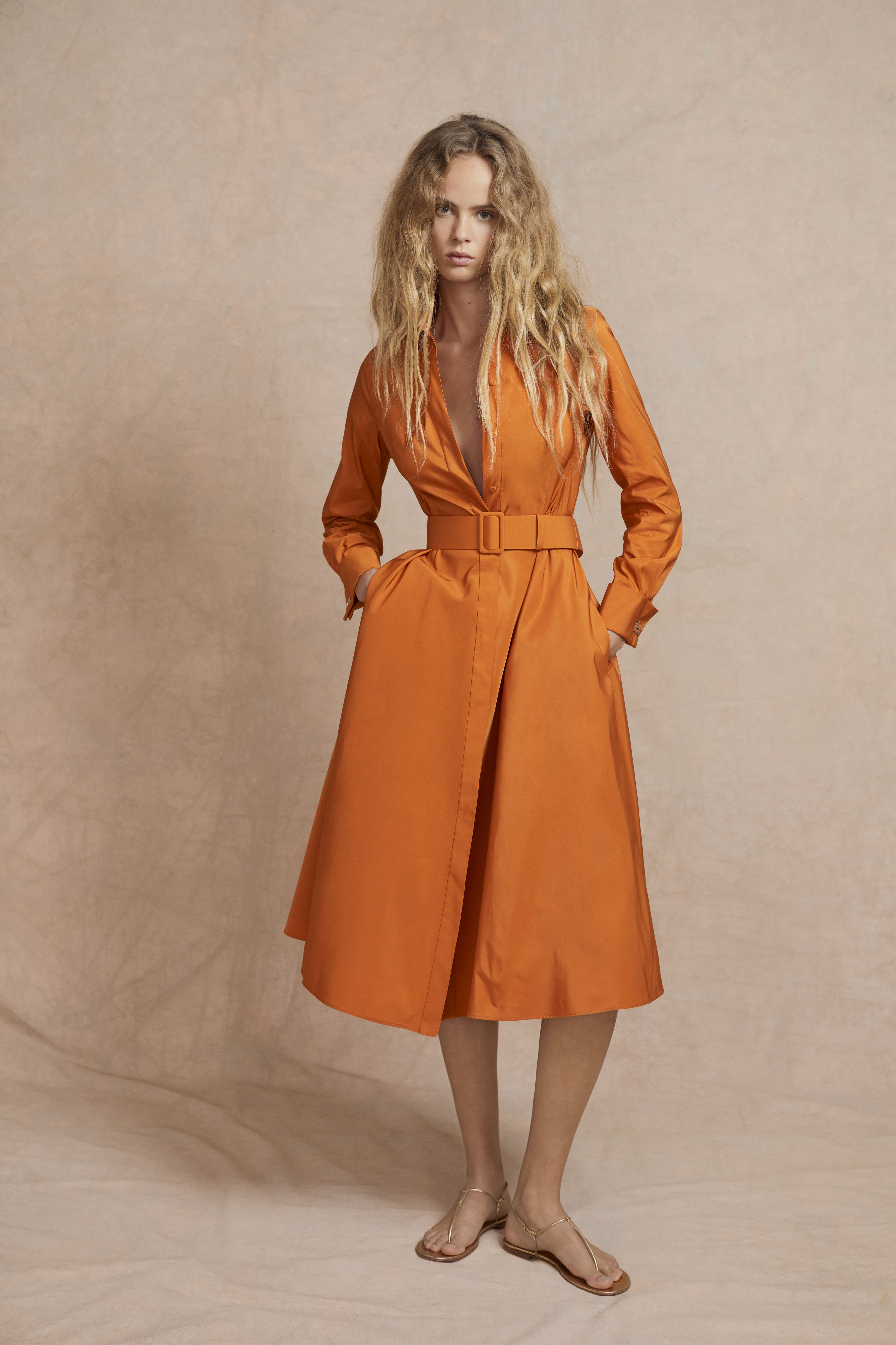 Bold printed looks including the essential shirtdress, an oversized kaftan-style dress in silk twill with a geometric print featuring Carolina's 2020 initials and contrasting striped trims, perfect for the sunset hour. A-lined short jackets in a wool and linen-blend twill and a merino wool oversized sweater to pair with a midi skirt for a woman on-the-go.