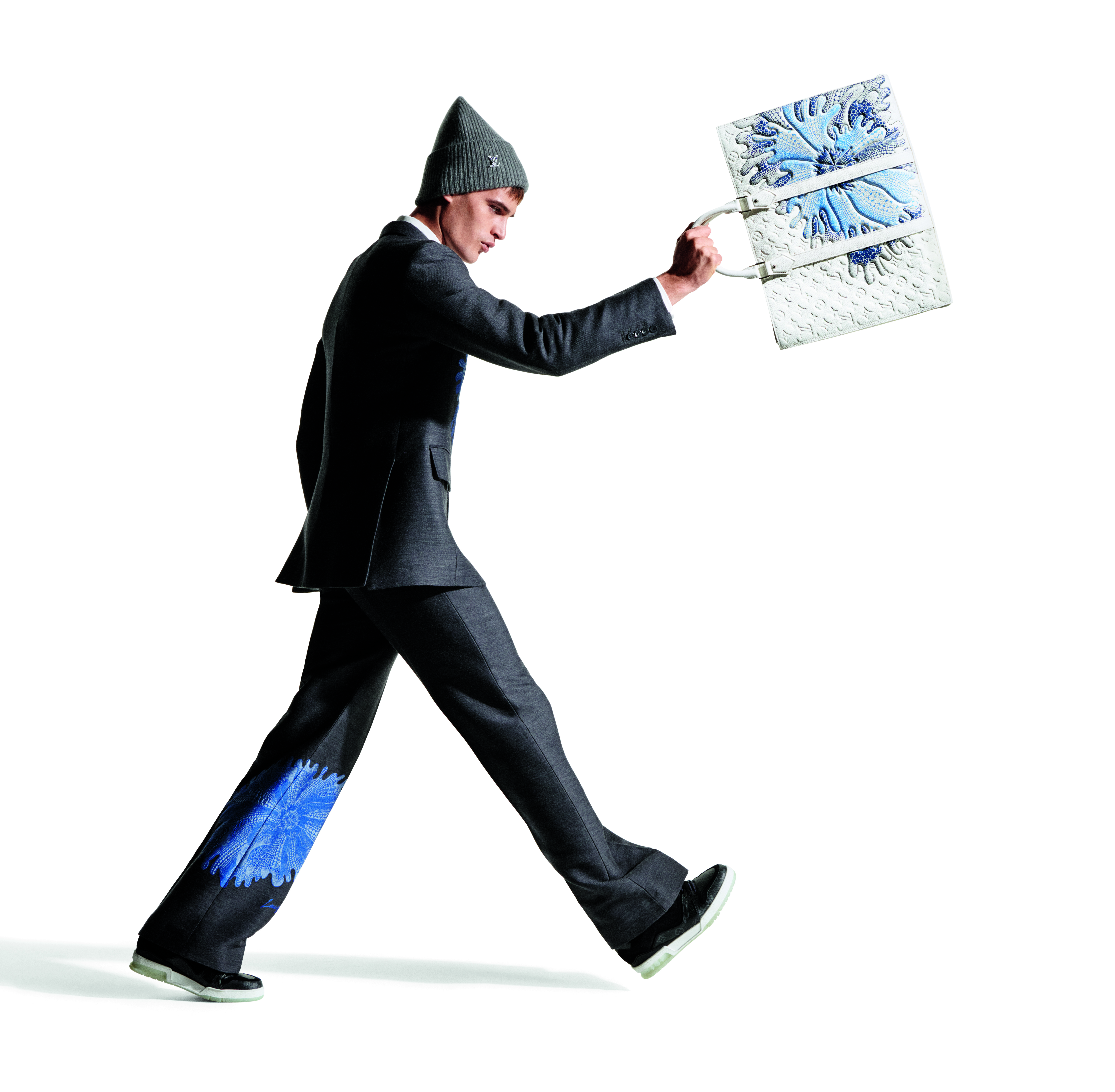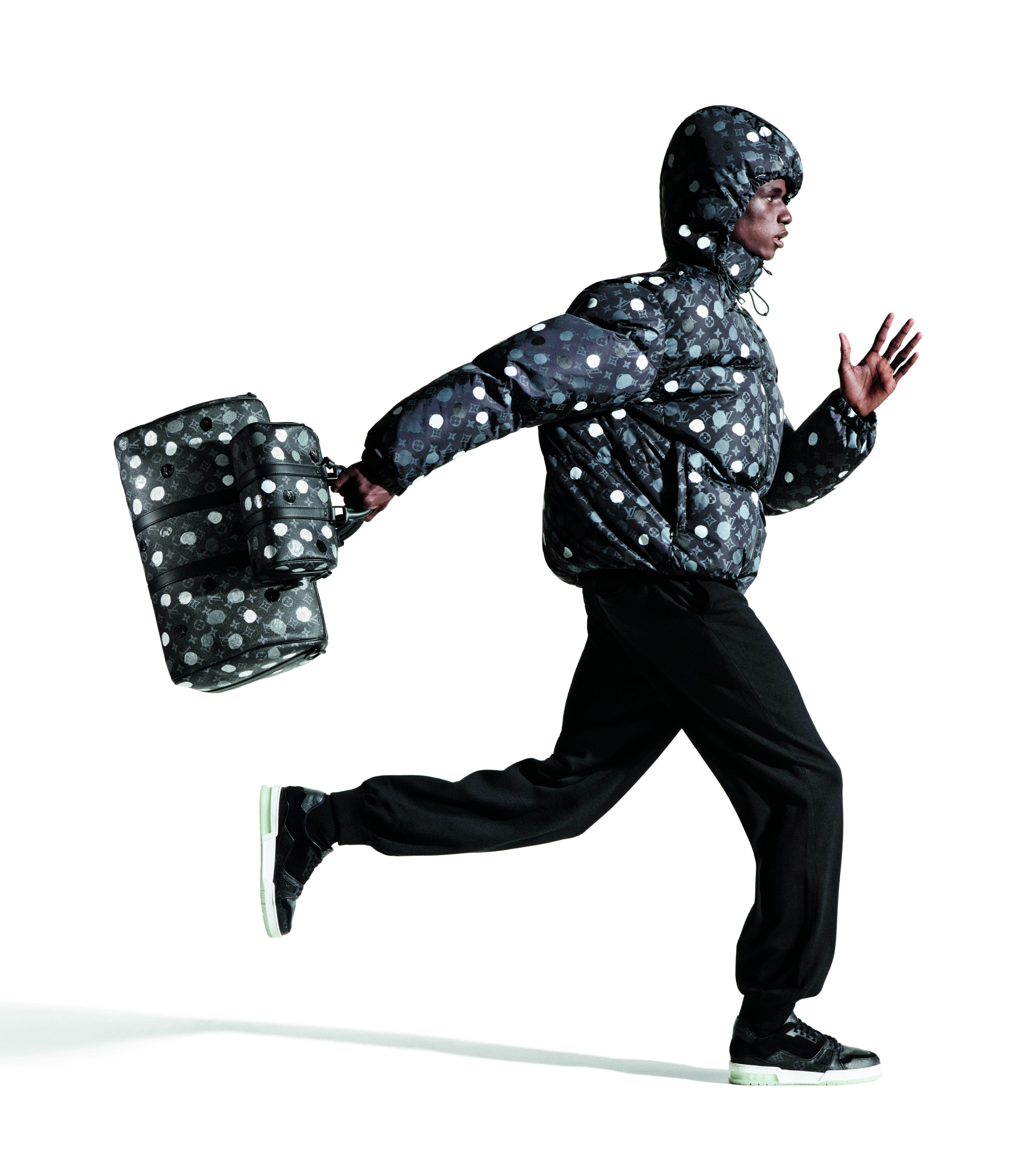 There is a playful meeting of Kusama’s signature brushstroked dots with Louis Vuitton’s Monogram that runs throughout this collection. From hard-sided luggage and a plethora of soft Monogram canvas bag icons of the Maison for women and men, via ankle boots, sneakers and derby shoes to men’s technical nylon ready-to-wear, in the shape of a dotted Monogram down jacket and cargo pants. The painted dots continue their proliferation through additional leather goods such as the white Capucines and black Dauphine bags as well as a black leather skirt with multicoloured brush stroke buttons; then onto ready-to-wear silk twill pyjama suiting, intricately printed denims and cashmere knits for women with men’s tailored outerwear, in the shape of a precision printed pure wool overcoat.