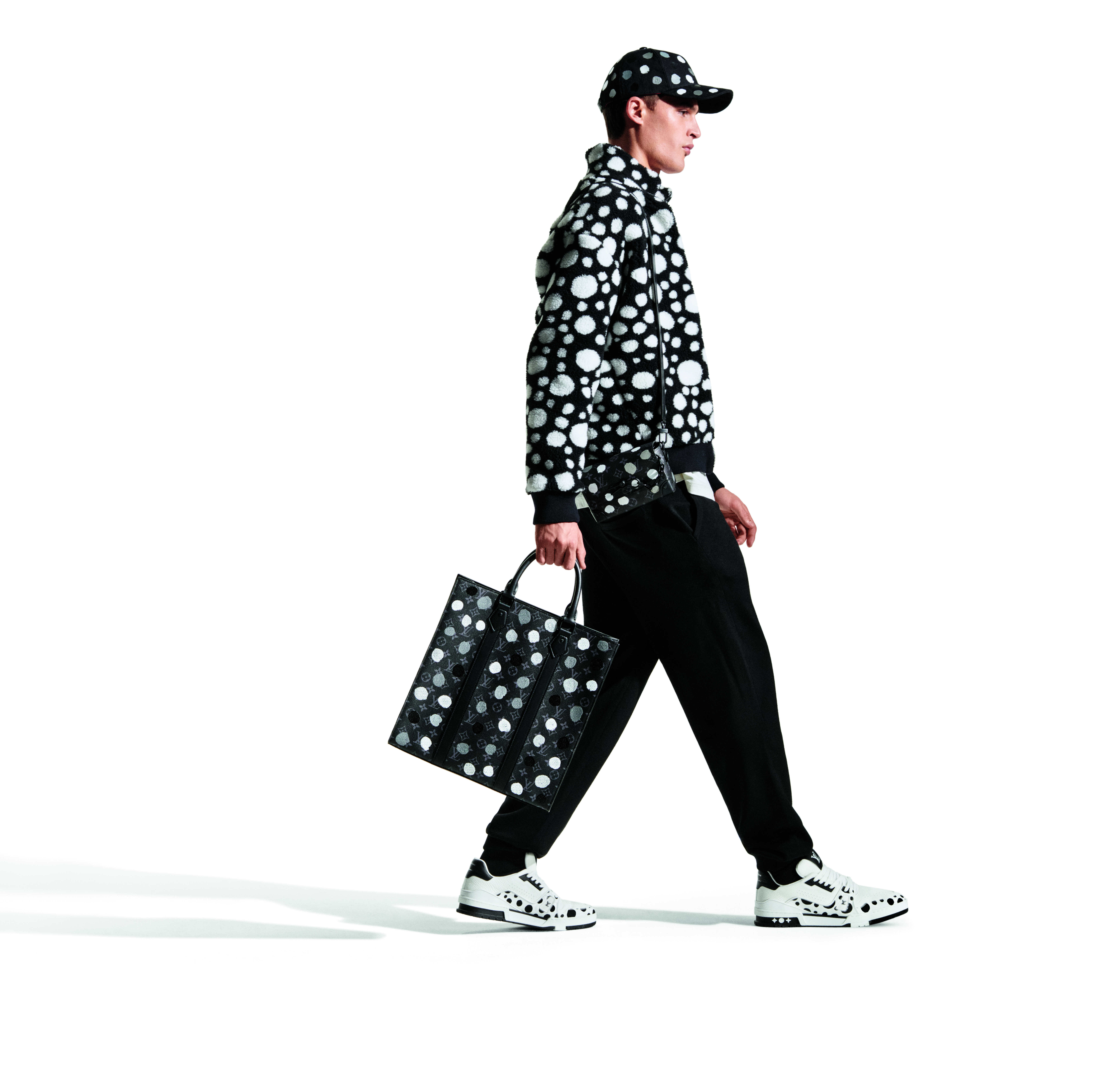 Woven into jacquards and 3D knits, printed onto silks and appearing as embroideries, the infinity dots find the elegance of the everyday when featured for women in signature Louis Vuitton silhouettes, such as the short, sharp printed gabardine spin on the skirt suit and enter into a more utilitarian realm for men in items such as the tech fleece blouson and zipped overshirt. For shoes, a proliferation of dots even takes shape on the soles and undersides of models such as signature Shake ankle boots and pumps. While metal hardware on Academy loafers is enamelled and echoed in infinity dotted jewellery. For men, the LV Trainer features its own palette of dots; on a grounding of white grain calf leather, black on white and green on white dots appear, together with a white on red iteration. A myriad of other accessories are also encompassed, including signature silk scarves, sunglasses, reversible bucket hats, baseball caps and even the ‘Vivienne’ doll – a version of Kusama herself. The infinity dots too extend their reach to the realm of fragrance with, appropriately enough, the obsessional Spell on You.