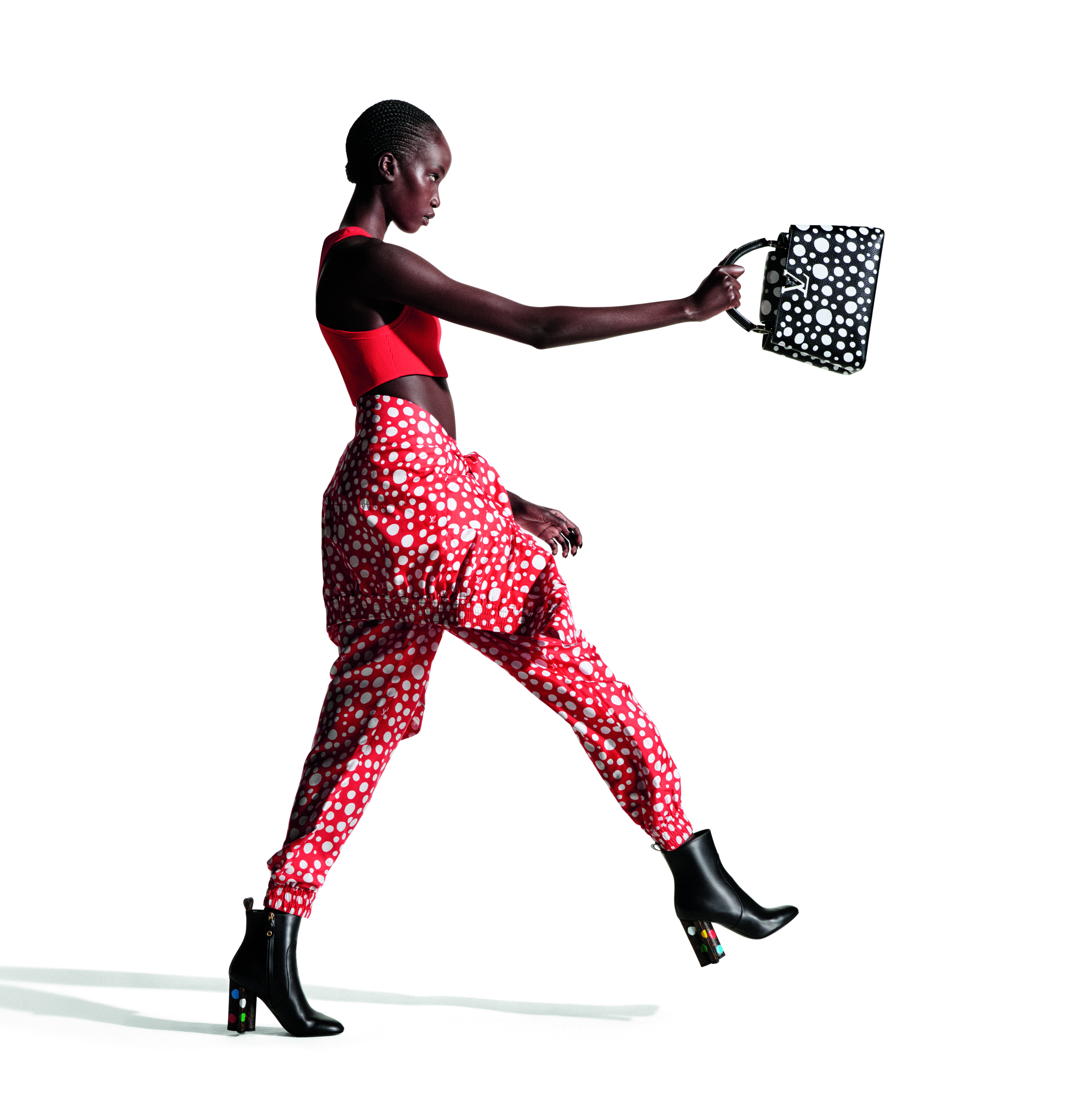 Proliferating in signature Kusama palettes of black & white, red & white, yellow & black, plus black & red for men, the infinity dots meld with a multiplicity of Maison icons, particularly in terms of leather goods, shoes and silhouettes. The infinity dots morph with the Monogram on leather goods such as the embossed Empreinte Neverfull, but also finds form in Epi bags such as the Twist or in the Taurillon Capucines. While for men, Taurillon is utilised for much of the initial infinity dot leather goods drop, including the classic Keepall and the Soft Trunk.